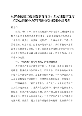 社保系统第二批主题教育党课:坚定理想信念厚植为民情怀全力答好新时代社保事业新考卷同志们:近期,我们召开了全市社保经办机构学习贯彻XXX新时代中国特色社会主义思想主题教育工作会,此次主题教育的总要求是学思想、强党性、重实践、建新功,既各有侧重,又是一个紧密联系、相互贯通、内在统一的有机整体,我们要把这一总要求贯穿主题教育全过程。下面,我就近期学习XXX新时代中国特色社会主义思想和党的XX大精神的收获与体会、感悟与思考,与大家作一个交流。一、学思想要心中有方,筑牢理论根基在中国共产党历史展览馆广场上,矗立着一座名为《信仰》的雕塑,展现的是71位不同时代、不同身份、不同年龄的中国共产党员庄严宣誓的场景,充盈着信仰的力量。一代代中国共产党人正是凝聚在信仰的旗帜下,为理想信念前赴后继、接续奋斗。XXXXXX指出:我们党取名为共产党,就是认定了共产主义这个远大理想。对共产主义的信仰,对中国特色社会主义的信念,是共产党人的政治灵魂,是共产党人经受住任何考验的精神支柱。回望党的百年奋斗史,千千万万共产党人为了理想信念抛头颅、洒热血,树立了坚守理想信念的榜样,激励着我们牢记信仰、勇往直前。今天,像战争年代那种血与火的生死考验少了,但具有新的历史特点的伟大斗争仍然在继续,前进道路上面临着一系列重大挑战、重大风险、重大阻力、重大矛盾的艰巨考验。没有坚定的理想信念,就容易患上软骨病,就会在乱云飞渡的复杂环境中迷失方向、在泰山压顶的巨大压力下退缩逃避在糖衣炮弹的轮番轰炸下缴械投降。我们要深刻领会XXX新时代中国特色社会主义思想关于坚定理想信念的要求,理想信念的坚定,来自思想理论的坚定,认识真理、掌握真理、信仰真理、捍卫真理是坚定理想信念的精神前提要全面学习领会XXX新时代中国特色社会主义思想的科学体系、精髓要义、实践要求,不断坚定马克思主义的信仰、中国特色社会主义的信念、实现中华民族伟大复兴中国梦的信心。要学好XXX新时代中国特色社会主义思想,首先要明白什么是XXX新时代中国特色社会主义思想。XXX新时代中国特色社会主义思想是博大精深的科学理论体系,是当代中国马克思主义、二十一世纪马克思主义,是中华文化和中国精神的时代精华,其核心内容是十个明确十四个坚持和十三个方面的主要成就。十个明确从理论层面阐明新时代坚持和发展什么样的中国特色社会主义,十四个坚持从实践层面阐明新时代怎样坚持和发展中国特色社会主义,十三个方面的主要成就从客观实际总结阐明新时代必须通过走好自己的路来坚持和发展中国特色社会主义,体现了党的指导思想与行动纲领的有机统一,是广大党员干部统一思想、统一意志、统一行动,实现高质量发展的行动指南。如何学好这一科学的理论体系,就要求我们要做到四个学,即全面系统学、及时跟进学、深入思考学、联系实际学。一是全面系统学。在《改造我们的学习》一文中,毛泽东曾开宗明义地要求全党要系统地而不是零碎地,实际地而不是空洞地学习马克思列宁主义。在今天的主题教育中,这种学习方法对于我们学好XXX新时代中国特色社会主义思想尤为重要。不能采取临时抱佛脚的态度,用什么学什么、用多少学多少、用哪块学哪块,不能满足于一知半解、浅尝辄止,更不能断章取义、不讲背景地生搬硬套。XXX新时代中国特色社会主义思想深刻回答了新的历史条件下党和国家事业发展的一系列重大理论和实践问题,进一步丰富发展了党的理论和路线方针政策,对党员干部提出了更具时代特色的新要求。首先,要学好用好《XXX著作选读》第一卷、第二卷,《XXX新时代中国特色社会主义思想学习纲要(2023年版)》,深入把握这一思想的核心要义、精神实质、丰富内涵、实践要求,不断增进政治认同、思想认同、理论认同、情感认同。其次,要结合党史、新中国史、改革开放史、社会主义发展史、中华民族发展史来学,通过点、线、面的连通汇合,打牢XXX新时代中国特色社会主义思想的基础知识,构筑结构严密的知识逻辑体系,进而弄清这一思想的来龙去脉、前后因果及其路径走向。再次,要学会运用马克思主义方法论,掌握贯穿其中的思想方法和工作方法,领悟好XXX新时代中国特色社会主义思想背后的坚定信仰追求历史担当精神、真挚为民情怀和务实思想作风,更好地用以指导和推动各项事业发展。只有这样,才能在学习XXX新时代中国特色社会主义思想中深刻体会到中国选择走社会主义道路的历史和现实必然性,才能深刻体会到中国进行改革开放、走社会主义市场经济道路的历史必然性,才能够适应新时代的要求,才能具备驾驭全局、掌握大势的本领,进一步坚定理想信念。二是及时跟进学。德国诗人歌德曾说:理论是灰色的,而生活之树常青。来源于实践的XXX新时代中国特色社会主义思想有很强的时代性。如果只是被动地按照上级要求学,而不能做到在学习上跟进、认识