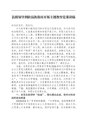 县级领导到软弱涣散村开展主题教育党课讲稿村各位党员、同志们:今天非常高兴能到你们村与同志们见面交流。作为你们村的包联领导,之前我也经常来村里开展工作,村悠久的历史文化、淳朴的风土人情、深厚的发展潜力都给我留下很深的印象,今天和大家齐聚一堂,主要是针对软弱涣散党组织整顿提升做调研,同时和大家坐在一起,面对面探讨交流、听取意见建议,同时结合当前的发展形势,以抓实抓好主题教育,推动乡村振兴迈出坚实步伐为主题,给大家讲一次专题党课。在座的各位,有村两委班子成员、有普通党员、有群众代表,大家都是村乡村振兴事业的组织者、实施者和推动者。希望大家通过这一次党课学习,树立干大事、成大事的志气和抱负,把学习贯彻新时代中国特色社会主义思想主题教育谋划好、组织好、落实好,在村乡村振兴事业中拼搏实干、建功立业。当前,全党正在深入开展学习贯彻XXX新时代中国特色社会主义思想主题教育。XXXXXX在学习贯彻新时代中国特色社会主义思想主题教育工作会议上强调,这次主题教育,要在推动学习贯彻新时代中国特色社会主义思想走深走实上下功夫,努力在以学铸魂、以学增智、以学正风、以学促干方面取得实实在在的成效。这些重要论述为我们扎实开展主题教育,全面系统掌握新时代中国特色社会主义思想提供了根本遵循。下面,我就围绕以学铸魂、以学增智、以学正风、以学促干四个方面,和同志们共同交流。一、在坚定信仰中铸魂,强化理论武装,筑牢对党忠诚的政治根基XXXXXX在广东考察时强调,以学铸魂,就是要做好学习贯彻新时代中国特色社会主义思想的深化、内化、转化工作,从思想上正本清源、固本培元,筑牢信仰之基、补足精神之钙、把稳思想之舵。党的十八大以来,以同志为核心的党中央勇担时代重任,立足时代之基,回答时代之问,引领时代之变,回应时代之需,推进马克思主义基本原理同中国具体实际相结合、同中华优秀传统文化相结合,创立了新时代中国特色社会主义思想,实现了马克思主义中国化时代化新的飞跃。作为革命老区村,你们村拥有着光荣的革命传统,诞生了一批为国家独立和民族解放做出杰出贡献的革命先驱。他们心怀对马克思主义信仰和共产主义信念,一生转战多地,在抗日战争、解放战争以及新中国的和平建设中攻坚克难、砥砺前行,为党和人民立下汗马功劳,铸就不朽丰碑。我们要传承好这种革命理想高于天的崇高信念,发扬好共产党人坚持真理、坚守理想的精神品格,以主题教育为契机,坚定不移用新时代中国特色社会主义思想凝心铸魂,深刻领会这一思想关于坚定理想信念、提升思想境界、加强党性锻炼等一系列要求,勇做党的创新理论的坚定信仰者和忠实实践者,让革命老区在乡村振兴新征程绽放新光芒。二、在深学细悟中增智,锤炼过硬本领,锻造坚强有力的战斗堡垒XXXXXX在听取陕西省委和省政府工作汇报时,深刻阐明以学增智,就是要从党的科学理论中悟规律、明方向、学方法、增智慧,把看家本领、兴党本领、强国本领学到手。并从提升政治能力、提升思维能力、提升实践能力三个方面对以学增智作出深刻阐释,为开展好主题教育提供了科学指引。近年来,你们村在市委市政府和镇党委政府的坚强领导下各项事业取得了显著成效,但还存在支部战斗堡垒作用发挥不够有力、党员教育管理不够规范等一系列问题,因此对于你们村而言,确定为软弱涣散村党组织既是一种鞭策,也是一次机遇。大家要正确看待整顿工作,以开展主题教育为重要抓手,对照整顿要求,查漏补缺,切实提高政治能力、思维能力和实践能力。一是提高政治能力。在干部干好工作所需的各种能力中,政治能力是第一位的。要将新时代中国特色社会主义思想作为必修课、主修课,不断增进政治认同、思想认同、理论认同、情感认同。同时突出政治功能,把党支部建设成为宣传党的主张、贯彻党的决定、领导基层治理、团结动员群众、推动改革发展的坚强战斗堡垒。二是提高思维能力。思维能力是人类认识世界、改造世界能力的最直接体现。新时代中国特色社会主义思想坚持和运用辩证唯物主义和历史唯物主义的世界观和方法论,既部署过河的任务,又指导解决桥和船的问题,是一个逻辑严密、内涵丰富、系统全面、博大精深的科学体系。我们必须通过深学细悟,自觉把新时代中国特色社会主义思想的世界观、方法论和贯穿其中的立场观点方法转化为自己的科学思想方法,提高为党分忧、为民谋福的能力和水平。三是提高实践能力。要学习掌握新时代中国特色社会主义思想蕴含的领导方法、思想方法和工作方法,紧紧围绕村奋斗目标,持续增强推动乡村振兴、服务群众、防范化解风险的本领,在谋事中锻炼、在干事中磨炼、在成事中锤炼,全面提升基层党组织创造力、凝聚力、战斗力,推动基层组织全面进步、全面过硬。三、在检视整改中正风,树立良好形象,营造风清气正的政治生态XXXXXX在内蒙古考察时,对开展主题教育提出明确要求,对以学正风作出深刻阐释