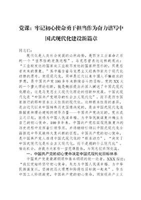 党课:牢记初心使命勇于担当作为奋力谱写中国式现代化建设新篇章同志们:现代化是人类社会发展的必然趋势,是西方工业革命之后的一个世界性的发展进程。马克思曾表达这样的观点:工业较发达的国家向工业较不发达的国家所显示的,只是后者未来的景象。其中蕴含着马克思主义经典作家关于现代化趋势的思考。实现现代化,同样是近代以来中国人不懈追求的梦想,是中国共产党100多年来持续奋斗的目标。党的XX大的一个重大理论创新,就是概括提出并深入阐述了中国式现代化理论,这是马克思主义现代化理论的创新和发展。中国式现代化是中国共产党领导的社会主义现代化,而不是西方国家推行的那种资本主义性质的现代化。这种根本性质的差异,是由近代以来中国特殊历史国情决定的,是由中国式现代化道路探索和理论建构的领导力量——中国共产党决定的。党自成立之日起,就将为中国人民谋幸福、为中华民族谋复兴确立为自己的初心使命。100多年来,中国共产党在实现民族复兴的历史进程中发挥着引领作用,并将继续引领以中国式现代化全面推进中华民族伟大复兴新的征程。中国共产党的初心使命,是中国共产党人推进中国式现代化的根本动力,决定了中国式现代化是社会主义现代化,而不是别的什么现代化。借此机会,由我为大家作一堂党课报告,与同志们共同交流。一、中国共产党的初心使命决定中国式现代化目标体系中国共产党是最高纲领和基本纲领的统一论者。XXX指出:我们党始终坚守初心使命,矢志为中国人民谋幸福、为中华民族谋复兴,坚持把远大理想和阶段性目标统一起来。作为中国工人阶级政党,中国共产党的初心使命,同实现共产主义的远大目标具有内在统一性。中国共产党从成立之初,就将承认无产阶级专政,直到阶级斗争结束,即直到消灭社会的阶级区分写入纲领,将实现共产主义作为自己的最高理想。但是,在一个落后的东方大国实现这个最高理想不可能一蹴而就,既要时刻牢记将来的纲领也要及时确定现在的纲领。纵观党在不同历史时期的基本纲领,核心的一条就是为人民幸福和民族复兴不懈奋斗;实现上述目标,就要不断解放和发展社会生产力、推进国家的现代化。党的初心使命,决定了中国共产党探索建构的中国式现代化目标体系,同实现民族复兴的目标和实现共产主义的远大理想是一致的。第一,中国式现代化是实现中华民族伟大复兴的必由之路民主革命时期,中国共产党人就从民族复兴的角度看待国家的现代化问题。1944年5月,毛泽东指出:我们共产党是要努力于中国的工业化的。他总结近代中国落后的原因,主要的是没有新式工业。他还特别指出,经济工作尤其是工业对于军事、政治、文化、思想、道德、宗教等方面的决定性意义。毛泽东把实现工业化提到了实现民族独立的高度,认为这是中国共产党人的历史责任。在党的七大上,毛泽东认为中国工人阶级的任务主要包括两个方面:一是建立新民主主义的国家,二是工业化和农业近代化。为了实现民族复兴、建设强大的社会主义国家,新中国成立后,中国共产党提出要在相当长的时期内,逐步实现国家的社会主义工业化。1954年,在第一届全国人大一次会议上,周恩来在政府工作报告中指出,要摆脱落后和贫困,要使革命达到目的,就必须建设强大的现代化的工业、农业、交通运输业和国防。这是四个现代化战略目标的初步表述,表明新中国社会主义现代化建设在构想之初就基于摆脱落后和贫困这个目标。改革开放之后,邓小平也强调:所谓四个现代化,就是要改变中国贫穷落后的面貌。他还指出,社会主义现代化建设的目标,是在经济上赶上发达的资本主义国家,在政治上创造比资本主义国家的民主更高更切实的民主,同时造就更多更优秀的人才。民族复兴必须通过社会主义现代化来实现,这是近代以来的历史结论,更是由中国共产党人的初心和使命所决定的。XXX指出,中国共产党人的初心和使命,是我们党领导现代化建设的出发点和落脚点。经过70多年探索,中国式现代化已经引领民族复兴进入不可逆转的历史进程;实践证明,中国式现代化是强国建设、民族复兴的唯一正确道路。第二,中国式现代化引领我国社会主义从初级阶段向更高阶段迈进。实现共产主义,不可能一蹴而就,而是需要经过一个漫长的历史时期、经历若干个历史阶段。对于这一过程的阶段性,马克思主义经典作家也曾有过预想,在《哥达纲领批判》中,马克思就提出共产主义社会第一阶段和高级阶段的概念。新中国成立之后,毛泽东曾将社会主义划分为两个阶段,即不发达的社会主义和比较发达的社会主义。改革开放后,邓小平在会见外国客人时曾指出:社会主义本身是共产主义的初级阶段,而我们中国又处在社会主义的初级阶段,就是不发达的阶段。这些科学的论断,为中国共产党科学规划社会主义初级阶段的基本路线、为以社会主义现代化建设推进中国的社会主义向更高阶段迈进提供了理论依据。中国的社会主