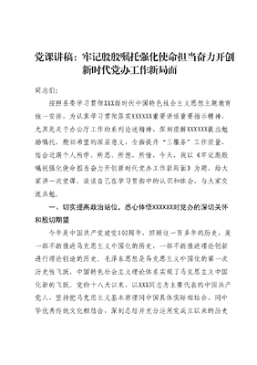党课讲稿:牢记殷殷嘱托强化使命担当奋力开创新时代党办工作新局面同志们:按照县委学习贯彻XXX新时代中国特色社会主义思想主题教育统一安排,为认真学习贯彻落实XXXXXX重要讲话重要指示精神,尤其是关于办公厅工作的系列论述精神,深刻理解XXXXXX提出勉励嘱托、殷切希望的深层意义,全面提升三服务工作质量,结合近期个人所学、所思、所想、所悟,今天,我以《牢记殷殷嘱托强化使命担当奋力开创新时代党办工作新局面》为题,给大家讲一次党课,谈谈自己在学习贯彻中的认识和体会,与大家交流共勉。一、切实提高政治站位,悉心体悟XXXXXX对党办的深切关怀和殷切期望今年是中国共产党建党102周年,回顾这一百多年的历史,是一部不断推进马克思主义中国化的历史,一部不断推进理论创新进行理论创造的历史。毛泽东思想是马克思主义中国化的第一次历史性飞跃,中国特色社会主义理论体系实现了马克思主义中国化新的飞跃。党的十八大以来,以XXX同志为主要代表的中国共产党人,坚持把马克思主义基本原理同中国具体实际相结合、同中华优秀传统文化相结合,深刻总结并充分运用党成立以来的历史经验,从新的实际出发,创立了XXX新时代中国特色社会主义思想实现了马克思主义中国化时代化新的飞跃,为新时代党和人民事业发展、实现中华民族伟大复兴提供了科学理论指导。XXX新时代中国特色社会主义思想是当代中国马克思主义、二十一世纪马克思主义,是中华文化和中国精神的时代精华,实现了马克思主义中国化时代化新的飞跃。XXX新时代中国特色社会主义思想以两个结合为根本途径推进理论创新,是顺应时代大势、适应实践所需、植根文化沃土的科学真理,以马克思主义中国化时代化新的飞跃,引领新时代党和国家事业取得历史性成就发生历史性变革。其内涵丰富、逻辑严密、体系完备、博大精深涵盖改革发展稳定、内政外交国防、治党治国治军等方方面面,构成集时代性、系统性、原创性于一体的开放的科学体系。党的XX大报告明确指出,十个明确、十四个坚持、十三个方面成就概括了这一思想的主要内容。新征程上,我们必须坚持不懈用XXX新时代中国特色社会主义思想凝心铸魂,完整把握、准确理解这一科学思想的世界观和方法论,坚持好、运用好贯穿其中的立场观点方法,进一步增强对两个确立、两个维护的政治认同、思想认同、理论认同、情感认同,更加紧密地团结在以XXX同志为核心的党中央周围,更加自觉用当代中国马克思主义、二十一世纪马克思主义指引方向,凝心聚力走好新时代的赶考之路。党委办公室处于四最一中枢(为党委服务最直接、联系各方面最广泛、保障党委工作最关键、在各机构运转中最核心,居于承上启下、协调左右的中枢位置)的特殊位置是首要政治机关,开展学习贯彻XXX新时代中国特色社会思想主题教育的首要任务,就是要认真学习领会XXXXXX对新时代党委办公厅(室)工作作出的重要指示批示精神,悉心感悟体会XXX对党办工作的殷殷嘱托和殷切期望,切实把XXXXXX重要论述精神作为提升三服务工作质量、开创党办工作新局面的强大思想武器和行动指南。XXXXXX非常熟悉办公厅工作,不仅组织领导过这项工作,而且亲自做过这项工作。他大学毕业到军委办公厅做秘书工作,后来无论在地方担任县委书记、地(市)委书记、省长、省委书记还是在中央担任党的XXX,都非常重视办公厅(室)工作,关心办公厅(室)建设,提出了做好办公厅(室)工作的一系列指示要求。1988年至1990年间,XXX同志在担任福建省宁德地委书记时指出,对于办公室工作,体会最深的有四个字:一是重,地位重要。二是苦,非常辛苦。三是杂,事务繁杂。四是难,难度很大。他要求地方党委的领导,对办公室工作要在理解、信任和尊重的基础上支持使用。1993年11月,XXX同志在担任福州市委书记时要求市委办公厅对党忠诚、马上就办、严谨认真、同心协力、无私奉献。他指出,办公厅(室)是一个单位的首脑机关,时时处处都要起表率作用。讲政治、坚持政治原则,很重要的一条,就是要在思想上政治上行动上同党中央保持高度一致。用坚强的党性确保中央政令畅通,确保党的路线方针政策不折不扣得到贯彻落实。要有高度的责任感,要高效率开展工作,实行高水平服务。要讲团结顾大局,正确对待自己和别人,与人为善、常怀善念,互相尊重互相支持,在相互配合中加深了解,在合作共事中增进团结。要戒奢节俭,自觉抵制铺张浪费的不良风气。2005年5月,XXX同志在担任浙江省委书记时指出:省委提出大的思路,办公厅的同志要帮助出主意;省委作出大的决策,办公厅要制定具体方案;省委勾勒蓝图,办公厅要描绘细节,具体深化;省委提出目标,办公厅要考虑'行军路线',做好'搭桥铺路'的工作。XXX同志说,文件是用来指导工作的,要言之有物有具体内容,有创新之处,连标点符号也不能马虎。文件、报