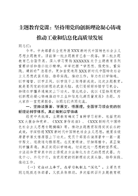 主题教育党课:坚持用党的创新理论凝心铸魂推动工业和信息化高质量发展同志们:今年,中央部署在全党开展XXX新时代中国特色社会主义思想主题教育,目前第一批主题教育已告一段落,第二批主题教育已全面开展。深入学习贯彻XXXXXX关于主题教育系列重要讲话和指示批示精神,牢牢把握学思想、强党性、重实践、建新功总要求,更加自觉地用XXX新时代中国特色社会主义思想武装头脑、指导实践、推动工作,努力在以学铸魂、以学增智、以学正风、以学促干上取得新成效。这次主题教育,就是要用党的创新理论武装头脑,我们要好好珍惜学习机会,持续在学懂弄通做实上下功夫。借此机会,我以《坚持用党的创新理论凝心铸魂推动市工业和信息化高质量发展》为题,为大家作一堂党课报告,与同志们共同交流。一、坚持读原著、学原文、悟原理,全面学习领会党的创新理论科学体系,真正做到以学铸魂经党中央批准,主题教育确定了8种学习材料,包括党的XX大报告和党章、《XXX著作选读》、《XXX新时代中国特色社会主义思想专题摘编》等。推动主题教育取得实实在在的成效,学深悟透XXX新时代中国特色社会主义思想,就要在读原著学原文悟原理上下功夫。党员干部要在读原著中一篇一篇学原文、逐段逐句悟原理,在反复研读、仔细琢磨中,真正做到学懂弄通,真正实现以学铸魂,切实把这一思想的世界观、方法论和贯穿其中的立场观点方法转化为自己的思想武器,内化于心、外化于行,自觉用党的创新理论武装头脑、指导实践、推动工作。(一)突出以上率下,在学习机制上深化。主要负责同志既抓总体部署,又抓具体推动,多次组织召开主题教育领导小组会议、理论学习中心组学习会、集中学习研讨,带头开展调查研究、讲授思政课、上专题党课,多次对纵深推进主题教育提出明确要求;严格对标对表XXXXXX和党中央决策部署,省委、市委各项要求,一体推进工作计划、学习计划、调研计划、整改计划,统筹建立问题清单、调研成果转化运用清单、为民办实事清单,实行清单式管理、项目化推进、销号制落实。(二)突出凝心铸魂,在学习重点上深化。紧紧围绕学习贯彻XXX新时代中国特色社会主义思想这个主题,聚焦学习贯彻XXXXXX关于开展主题教育系列重要讲话和重要指示批示精神,组织开展全覆盖学习培训、全方位宣传宣讲,层层传导、步步深化。在深入学习调研基础上,围绕学习贯彻党的XX大精神和XXXXXX系列重要讲话、重要指示批示精神,聚焦XXXXXX赋予的使命任务,作出具体部署,动员引领全体党员干部把主题教育激发的热情和汲取的力量转化为感恩奋进、真抓实干的生动实践。(三)突出入脑入心,在学习方式上深化。坚持读原著学原文悟原理,把全面学和重点学结合起来,把学习和思考结合起来,把知其然和知其所以然结合起来,形成党委(党组)会议、理论学习中心组学习会、读书班、三会一课、主题党日等理论学习组合拳,推动党员、干部努力学深悟透中央指定的学习材料、XXXXXX对本系统本领域系列重要讲话和重要指示批示摘编。已累计开展理论学习中心组学习10次、专题党课10次、三会一课10次、主题党日10次。二、熟练掌握这一重要思想的世界观方法论和贯穿其中的立场观点方法,把马克思主义看家本领学到手,真正做到以学增智开辟马克思主义中国化时代化新境界的重大任务,是当代中国共产党人的庄严历史责任。新时代新征程上,我们党的中心任务是团结带领全国各族人民全面建成社会主义现代化强国、实现第二个百年奋斗目标,以中国式现代化全面推进中华民族伟大复兴。新时代新征程的使命任务催人奋进,前进的道路既繁花似锦,也荆棘密布,充满风险挑战,甚至惊涛骇浪。我们党要继续带领全国各族人民完成这一千秋伟业,始终成为风雨来袭时全体人民最可靠的主心骨,就必须始终做到理论强党,不断推进党的理论创新。(一)以学增智,提升政治能力。坚定政治立场,提升政治判断力。政治判断力是以国家政治安全为大、以人民为重、以坚持和发展中国特色社会主义为本,科学把握形势变化、精准识别现象本质、清醒明辨行为是非、有效抵御风险挑战的能力。广大党员干部要坚持读原著、学原文、悟原理,学深悟透XXX新时代中国特色社会主义思想,善于从繁杂问题中把握事物的规律性、从苗头问题中发现事物的趋势性、从偶然问题中认识事物的必然性,逐步提升政治判断力,从而为党的政治能力建设提供更加坚实的根基,为党和国家的发展提供更加稳固的主体性支撑。提高政治意识,提升政治领悟力。政治领悟力是对党中央精神深入学习、融会贯通,坚持用党中央精神分析形势、推动工作,始终同党中央保持高度一致的能力。广大党员干部要在理论学习中明确党和国家政策的基本要义,把握党和国家政策的精髓,还要善于从党和人民的立场、党和国家工作大局出发想问题、作决策、办事情,切实提升政治领悟力,从而不断提升党员干部自身的党性修养,为党和国家的发展进一步夯实主体