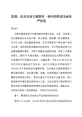 党课:扎实开展主题教育一刻不停推进全面从严治党同志们:开展主题教育是今年党的建设的重大任务。当前,我市第二批主题教育正在全面开展、深入推进。搞好第二批主题教育,对于扩大第一批主题教育成果,对于淬炼党员干部忠诚干净担当品质、巩固党的执政基础和执政地位,对于更好推动党中央决策部署落地落实,不断开创事业发展新局面,具有十分重要的意义。党的XX大报告指出,全面建设社会主义现代化国家、全面推进中华民族伟大复兴,关键在党。今年6月28日至29日召开的全国组织工作会议,首次正式提出并系统阐述了XXXXXX关于党的建设的重要思想,为开展好主题教育提供了鲜活理论教材。我们要完整、准确、全面把握这一重要思想的精神实质和核心要义,坚持全面从严治党这个主题主线,深入推进新时代党的建设新的伟大工程,为奋力谱写中国式现代化建设的强市新篇章提供坚强政治保证和组织保证。借此机会,由我为大家作一堂党课报告,与同志们共同交流。第一,要深刻认识全面从严治党新的时代内涵党的十八大以来,以XXX同志为核心的党中央在深刻总结全面从严治党经验基础上,提出了一系列管党治党的新理念新思想新战略,形成了XXXXXX关于党的建设的重要思想。党中央把坚持党要管党、全面从严治党写入党章,并纳入四个全面战略布局,赋予了全面从严治党新的时代内涵,深化了马克思主义建党学说根本原则、科学布局认识。党的十九大报告首次将党的政治建设和纪律建设纳入党的建设总体布局,形成了新时代党的建设新格局。XXXXXX关于党的建设的重要思想开辟了百年大党自我革命新境界,对共产党执政规律的认识达到新高度。中国共产党是世界上最大的马克思主义执政党,也面临大党独有难题。经过不懈努力,党找到了自我革命这一跳出治乱兴衰历史周期率的第二个答案,确保党永远不变质、不变色、不变味。立志于中华民族千秋伟业的中国共产党既是执政党,又是革命党,勇于刀刃向内,保持赶考的清醒,彰显出强大政治领导力、思想引领力、群众组织力、社会号召力。XXXXXX关于党的建设的重要思想,展现出了强大的真理力量和实践伟力,指引我们党在革命性锻造中更加坚强有力,推动党和国家事业取得历史性成就、发生历史性变革。党的XX大报告强调,全面从严治党永远在路上,党的自我革命永远在路上,决不能有松劲歇脚、疲劳厌战的情绪,必须持之以恒推进全面从严治党,深入推进新时代党的建设新的伟大工程,以党的自我革命引领社会革命。XXXXXX关于党的建设的重要思想深刻回答了管党治党、兴党强党时代答卷,深刻总结世界社会主义运动经验教训,是应中华民族伟大复兴时代要求而生的重大理论创新成果,必须以此为遵循,深入推进新时代党的建设新的伟大工程。第二,要准确把握全面从严治党主题主线XXXXXX关于党的建设的重要思想着眼解决大党独有难题,突出全面从严治党主题主线,围绕建设什么样的长期执政的马克思主义政党、怎样建设长期执政的马克思主义政党的重大时代课题,深刻阐明了新时代党的建设的根本原则、科学布局、价值追求、重点任务,为深入推进新时代党的建设新的伟大工程、做好新时代组织工作提供了根本遵循。牢牢把握党的建设的根本原则和有效路径。十三个坚持是对XXXXXX关于党的建设的重要思想的集中概括,其中第一位的是坚持和加强党的全面领导。XXXXXX指出,我们全面加强党的领导,明确中国特色社会主义最本质的特征是中国共产党领导,中国特色社会主义制度的最大优势是中国共产党领导,中国共产党是最高政治领导力量,坚持党中央集中统一领导是最高政治原则,强调党的领导是全面的、系统的、整体的,必须全面、系统、整体加以落实,健全总揽全局、协调各方的党的领导制度体系,完善党中央重大决策部署落实机制。这深刻揭示了党的领导与中国特色社会主义的内在统一性,阐明了坚持和加强党的全面领导、加强党的建设、全面从严治党的逻辑关系。坚持以党的自我革命引领社会革命是新时代党的实践经验的智慧结晶和理论升华,宣示了建设始终走在时代前列、人民衷心拥护、勇于自我革命、经得起各种风浪考验、朝气蓬勃的马克思主义执政党的有效路径。全面推进党的建设科学布局。XXXXXX关于党的建设的重要思想着眼党的政治建设、思想建设、组织建设、作风建设、纪律建设,把制度建设贯穿其中,强调党的建设科学布局。如坚持以党的政治建设统领党的建设各项工作突出政治建设首要性、根本性、统领性地位,关乎举旗定向,决定前途命运;坚持思想建党、理论强党强调思想建设的优良传统;坚持严密党的组织体系注重发扬党独特的组织优势;坚持持之以恒正风肃纪侧重从作风、纪律方面协同发力、久久为功;坚持制度治党、依规治党强调制度建设的根本性、全局性、稳定性、长期性保障作用;坚持一体推进不敢腐、不能腐、不想腐既是深入推进反腐败斗争的思路方法,又是重点任务,彰显标本兼治的决心和力度。准