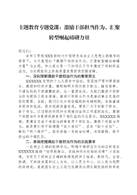 主题教育专题党课:激励干部担当作为,汇聚转型崛起磅礴力量同志们:在学习贯彻XXX新时代中国特色社会主义思想主题教育的背景下,今天我想以激励干部担当作为,汇聚转型崛起磅礴力量为主题,和大家分享一下如何在工作中激发干部的担当活力,为实现组织工作高质量发展提供坚强保障。一、深刻理解激励干部担当作为的重要意义XXXXXX在党的十九大报告中指出,要坚持严管和厚爱结合、激励和约束并重,旗帜鲜明为那些敢于担当、踏实做事、不谋私利的干部撑腰鼓劲。这一重要论述,为我们激励干部担当作为提供了根本遵循。激励干部担当作为是推动事业发展的迫切需要。当前,我们正处在转型崛起的关键时期,面临着诸多困难和挑战。要实现高质量发展,需要广大干部敢于担当、善于作为,以过硬的作风和本领推动各项工作落到实处。激励干部担当作为是建设高素质干部队伍的内在要求。XXXXXX强调,要建设忠诚干净担当的高素质干部队伍。激励干部担当作为,就是要引导干部增强四个意识、坚定四个自信、做到两个维护,培养造就一支政治过硬、本领高强、敢于担当的干部队伍。二、准确把握激励干部担当作为的实践要求一是树立正确的政绩导向,明确干部担当作为的目标定位XXXXXX强调经得起群众、实践和历史检验的实绩才是政绩,为党员干部树立正确的政绩观提供了指南。新时代,全面、协调、可持续发展和以人为本、以人民为中心、以人类为视野的政绩观,是我国社会主义现代化建设必须长期坚持的科学政绩观。我们要强化干部政绩观教育,教育引导广大干部深刻领会新时代、新思想、新矛盾和新目标提出的新要求,教育引导广大干部正确看待政绩、明白为谁创造政绩、弄清怎样做出政绩,以勇立潮头、时不我待、只争朝夕的历史担当,努力攻坚克难、改革创新、锐意进取和担当作为。二是强化思想引领,激励干部担当作为的思想自觉。通过常态化、制度化、多样性和长期性的教育活动,强化干部理论武装和党性锻炼,激发干部担当作为的内生动力。坚持用XXX新时代中国特色社会主义思想武装干部头脑,引导干部深刻领悟两个确立的决定性意义,增强四个意识,坚定四个自信,做到两个维护。坚持理想信念、宗旨观念教育,用马克思主义中国化最新理论成果、中华优秀传统文化、先进典型,教育引导干部提高政治站位,培养同理心与共同体意识,树立正确的价值取向和行为准则,把干事创业作为一种高尚的精神追求,强化干部的初心情怀,增强使命担当。三是坚持正确选人用人导向,树立激励干部担当作为的风向标。XXXXXX强调:要在选人用人上体现讲担当、重担当的鲜明导向,把敢不敢扛事、愿不愿做事、能不能干事作为识别干部、评判优劣、奖惩升降的重要标准,把干部干了什么事、干了多少事、干的事组织和群众认不认可作为选拔干部的根本依据,为我们选用担当作为的干部划定了标尺。我们要坚持把政治标准和重实干实绩的选人用人导向贯穿于干部培养、选拔、使用的全过程。一要坚持把政治标准放在首位,要看干部是否做到理想信念坚定,是否做到对党绝对忠诚,是否能够坚持原则敢于担当,考准考实干部的政治忠诚、政治定力、政治担当、政治能力、政治自律.二要坚持把敢扛事、愿做事、能干事作为选拔干部的重要标准,大力选拔敢于负责、勇于担当、善于作为、实绩突出的干部。以实干为导向把真正想干事、能干事、干实事的干部识别出来、选拔上来,把敢于负责、勇于担当、善于作为的干部发现、使用起来,把个性鲜明、敢抓敢管的干部遴选和重用起来。三要树立有为才有位的用人导向,激发干事创业的热情,保证人岗相适、人事相宜。根据党员干部的性格、特长、能力等因素匹配相应的岗位,以岗位要求和现实需要选择合适的党员干部,确保人尽其才。四要牢固树立能者上、优者奖、庸者下、劣者汰的正确导向,让吃苦的吃香、埋头的出头、实干的实惠。对思想正派、实绩突出、担当作为的干部优先提拔重用,做到干部能上。对担当不够、工作失责失察者,工作不适应、人岗不相适者,为官不为、激情衰退者,团结不力、影响事业发展者,坚决做到不换思想不换状态就换人,做到干部能下。四是强化能力提升,赋能干部担当作为。XXXXXX强调,要加快知识更新、加强实践锻炼,使专业素养和工作能力跟上时代节拍,勉励干部要敢想、敢做、敢当,既是对各级干部寄予的殷切期望,也为培养锻炼干部指明了路径。我们要按照XXXXXX提出的干部要增强八项本领和七种能力的要求,围绕新时代对干部能力素质提出的新要求,加强干部专业化知识培训和能力建设。要充分利用优质培训资源,创新培训方式,增强干部培训的实效性和针对性,帮助干部弥补知识空白、能力弱项、经验盲区。树立注重基层和实践的导向,让干部在重大斗争一线、艰苦复杂地区、改革开放前沿,脱贫攻坚、社会治理、乡村振兴等工作实践中长见识、增才干,把经历变成经验、把阅历变成能力。通过培训为干部担当作为赋