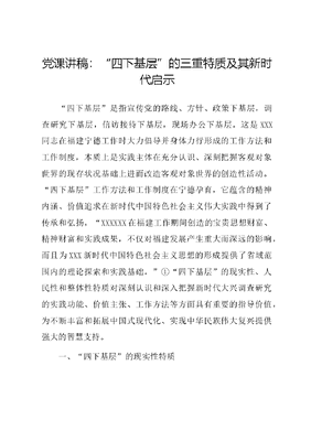 党课讲稿:四下基层的三重特质及其新时代启示四下基层是指宣传党的路线、方针、政策下基层,调查研究下基层,信访接待下基层,现场办公下基层。这是XXX同志在福建宁德工作时大力倡导并身体力行形成的工作方法和工作制度,本质上是实践主体在充分认识、深刻把握客观对象世界的现存状况基础上进而改造客观对象世界的创造性活动。四下基层工作方法和工作制度在宁德孕育,它蕴含的精神内涵、价值追求在新时代中国特色社会主义伟大实践中得到了传承和弘扬。XXXXXX在福建工作期间创造的宝贵思想财富、精神财富和实践成果,不仅对福建发展产生重大而深远的影响,而且为XXX新时代中国特色社会主义思想的形成提供了省域范围内的理论探索和实践基础。①四下基层的现实性、人民性和整体性特质对深刻认识和深入把握新时代大兴调查研究的实践功能、价值主张、工作方法等方面具有重要的指导价值,为不断丰富和拓展中国式现代化、实现中华民族伟大复兴提供强大的智慧支持。一、四下基层的现实性特质所谓四下基层的现实性特质意指四下基层不是实践主体的主观臆想、主观臆造的想象活动,而是实践主体通过对客观对象世界的深入了解、全面剖析、本质把握,对客观对象世界进行革命性改造,目的在于使这种客观对象世界的发展更符合人的本质、人的本性的需要。也就是说,四下基层不是停留在对客观对象世界的主观把握之上的,而是要深入到客观对象世界的本质性、历史性维度之中,透过现象看本质,把握事物发展的内在要求和规律指向。以此为基础,实践主体适用这一规律,准确把握事物发展的未来大势,提出相应的思想理念,进而指导乃至重建社会现实。所以,四下基层的社会功能不是仅仅停留在认识世界解释世界的层面上,而是把改变世界作为四下基层的实践旨归。总的来看,四下基层之改变世界的实践旨归主要包括两个层面。一是四下基层能规范、矫正实践主体的行为方式,增强实践主体的实践能力和拓宽视野。XXX同志在《摆脱贫困》中明确指出,领导干部必须放下架子,打掉官气,主动上门,把信访工作做到基层,由此可以改进工作作风,克服官僚主义,①各级领导干部到群众中走访……了解和熟悉他们工作和生活的状况,就可以从根本上防止这种命令主义、官僚主义的弊病。②可以说,四下基层不仅是提高党员干部政治智慧、增强执政能力、激发干事创业主动性的必要途径,还是党员干部通过与人民群众相互接触、相互作用,不断加强党密切联系群众的重要渠道,更是提高领导干部担当作为的党性修养、全心全意为人民服务的公仆意识的重要法宝。面对如何提高领导干部下基层能力和水平的问题,XXX同志要求党员干部眼睛向下,善于从群众的实践中汲取营养,获得真知。③这就要求党员干部充分了解基层情况、掌握群众意志,并按照事物发展的客观规律,制定出科学的路线、方针、政策。正如恩格斯在《英国工人阶级状况》中所指出的,调查了解工人阶级的生存境况,是给那些认为社会主义理论有权存在的见解提供坚实的基础,为了肃清赞成和反对这种理论的一切空想和幻想。④可以看出,四下基层是帮助拨开人们的思想迷雾、获得理论新认识、坚定理论自信的锐利武器。二是四下基层的现实性通过规范、矫正实践主体的主观世界,进而更好地改变世界,即促进实践主体之外的客观世界的向善发展,包括人类社会全面进步、生产方式进步发展等方面。现实本身是思想理念的产生根源,人们的存在就是他们的现实生活过程。⑤作为一种体察民情、追求真理的工作方法,四下基层就是对人们的现实生活过程的本质性研究和把握,并在这种现实生活的历史性展开过程中概括、提炼、升华出新的思想理念,用以创造出更加美好的世界。一方面,四下基层的工作方法以发现问题、分析问题、解决问题为导向。XXX同志强调,要提倡各级领导带任务、带问题深入基层,解剖麻雀。……有利于把问题解决在源头,把矛盾消弭在萌发状态。⑥也就是说,四下基层既是提高领导机关办事效率、增强办事精准性的重要途径,也是促进领导干部解决发展中的问题、矛盾、困境的有效方法。2021年9月,XXXXXX在中共中央党校(国家行政学院)中青年干部培训班开班式上讲话中结合自己在福建工作的经历,深入阐述了调查研究对制定科学的政策、提高人民生活品质的重要性:我在福建工作时,针对福建是林业大省、广大林农却守着金山银山过穷日子的状况,为解决产权归属不清等体制机制问题,推动实施了林权制度改革……我认为,林权改革关系老百姓切身利益……我们抓住山要怎么分、树要怎么砍、钱从哪里来、单家独户怎么办这4个难题深入调研、反复论证,形成了全国第一个省级林改文件。2008年中央10号文件全面吸收了福建林改经验。①四下基层的历史性展开过程不仅仅是一个解决问题、化解矛盾的过程,而且是