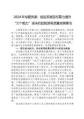 2024年专题党课:锚定双碳目标着力提升三个能力坚决扛起能源高质量发展重任主题教育深入开展之际,XXXXXX发表重要讲话,深刻阐明以学增智就是要从党的科学理论中悟规律、明方向、学方法、增智慧,把看家本领、兴党本领学到手,鲜明提出了党员干部要进一步提升政治能力、思维能力、实践能力的任务要求。作为能源工作者,要深入学习领会,认真践行双碳战略,着力推动全省能源绿色低碳转型,实现能源高质量发展。一、提升政治能力,夯实把握能源发展方向的政治根基政治能力是党员干部最重要的履职能力。有了过硬的政治能力,才能做到自觉在思想上政治上行动上同以XXX同志为核心的党中央保持高度一致,在任何时候任何情况下都能做到不畏浮云遮望眼乱云飞渡仍从容。当前新一轮能源革命和科技革命深度演变,大力发展新能源已成为应对气候变化和推动能源绿色低碳转型的一致共识。作为碳减排的重要举措,新能源必将步入规模化发展新阶段,成为积极应对气候变化、实现碳达峰碳中和目标的核心力量。作为能源党员干部,注重提升政治能力,切实履行好自身所肩负的职责。坚持不懈学懂弄通做实XXX新时代中国特色社会主义思想,牢固树立政治理想,正确把握政治方向,坚定站稳政治立场,严格遵守政治纪律,加强政治历练,积累政治经验,使自己的政治能力同所担任的职务和所肩负的职责相匹配,更加自觉贯彻党中央和省委省政府关于碳达峰碳中和的重大决策部署,围绕全省一主六双高质量发展战略,聚焦六新产业和四新设施,紧紧抓住五大工程这个关键推动全省能源产业实现高质量发展。政治能力是善于从党和人民立场和国家大局出发思考问题的能力。XXXXXX强调人民立场是中国共产党的根本政治立场,是马克思主义政党区别于其他政党的显著标志。要时刻把事关党和国家前途命运、事关人民根本利益的大事放在心上,牢牢站稳人民立场,做到能源发展为了人民。深入实施新能源乡村振兴工程,顺应人民对美好生活的向往。要促进能源改革发展成果更多惠及企业、惠及民生,解决好人民群众急难愁盼问题,逐步实现能源用得上向用得好转变。不断优化提升政务服务质量,提高获得电力水平,持续做好电力市场化交易,积极做好电力现货细则编制,推动全体人民共同富裕取得更为明显的实质性进展。政治能力是善于从繁杂问题中把握事物规律、趋势的能力XXX新时代中国特色社会主义思想深化了对共产党执政规律、社会主义建设规律、人类社会发展规律的认识。我们要熟练掌握这一科学理论蕴含的领导方法、思想方法、工作方法,善于运用这一科学理论观察时代、把握时代、引领时代,准确把握事物发展的必然趋势,不断提高政治敏锐力和政治鉴别力,提升透过现象看本质的能力。充分认识能源是支撑经济高质量发展重要的基础保障作用。能源必须立足高质量发展,面向国家能源四个革命、一个合作重大需求,面向碳达峰碳中和重大战略决策,积极布局新能源产业格局,在新能源装备产业链、储能、氢能做出规划和布局,做到眼睛亮、见事早、行动快。政治能力是能够驾驭复杂局面、防范政治风险的能力。当前,世界之变、时代之变、历史之变正以前所未有的方式展开,这是改革开放以来从未遇到过的。在能源领域,在双碳战略大背景下,推动能源绿色低碳转型,大力发展新能源产业,已成为能源行业未来发展的必由之路。围绕新能源发展的竞争日趋激烈,比如特高压通道建设,在电力十四五规划中已有12条,去年又新增了5条,加上我省正积极推动的吉电入京,国内多条特高压通道正在推动建设,可谓千帆竞发、百舸争流。提升政治能力,就是要有忧患意识,坚持底线思维,居安思危、未雨绸缪,时刻保持箭在弦上的备战姿态,下好先手棋,打好主动仗。二、提升思维能力,准确把握推动能源转型发展的关键XXXXXX对提升思维能力做出深刻阐释,强调要做到善于把握事物本质、把握发展规律、把握工作关键,把握政策尺度,增强工作科学性、预见性、主动性、创造性。做好全省能源工作,要在111555能源工作思路引领性,切实提升战略思维、系统思想创新思维和底线思维,以新能源产业发展为主线,以陆上风光三峡等一批重大能源项目建设为支撑,以推动清洁能源消纳为主攻方向,着力推动全省能源高质量发展取得新成效。一是强化战略思维,优化顶层设计。着重加强源网荷储的协同规划和布局优化。新能源具有间歇性和波动性,必须推进源网荷储一体化和多能互补发展,按照新能源+储能+火电协同运行模式,以储能火电调整支撑清洁能源高比例上网模式进行顶层设计,保证电力系统安全稳定高效运行。比如,五大工程是根据新能源发展新形势新任务提出的,包括消纳提速工程、储能提升工程、新型电网工程、六新产业耦合工程、创新驱动工程,涵盖了源网荷储一体化等多方面设想,是能源发展的有效路径,是项目和产业融合发展的关,将是我省新能源产业的着力点、增长点。二