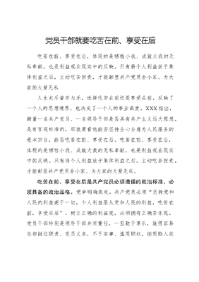 党员干部就要吃苦在前、享受在后吃苦在前、享受在后,体现的是牺牲小我、成就大我的无私奉献,也是利益观在现实中的反映。只有将个人利益放于集体利益之后,主动吃苦担责,才能彰显共产党员舍小家、为大家的大爱无私 人生充斥着苦与乐,选择吃苦在前还是享受在前,反映了一个人的思想境界,也决定了一个人的事业高度。XXX指出,衡量一名共产党员、一名领导干部是否具有共产主义远大理想,是有客观标准的,那就要看他能否坚持全心全意为人民服务的根本宗旨,能否吃苦在前、享受在后。吃苦在前、享受在后,体现的是牺牲小我、成就大我的无私奉献,也是利益观在现实中的反映。只有将个人利益放于集体利益之后,主动吃苦担责,才能彰显共产党员舍小家、为大家的大爱无私。吃苦在前、享受在后是共产党员必须遵循的政治标准,必须具备的政治品格。党章明确规定,共产党员必须坚持党和人民的利益高于一切,个人利益服从党和人民的利益,吃苦在前,享受在后。树立正确的利益观,必须拥有正确苦乐观。党员干部特别是领导干部身肩重任,一旦耽于享乐,就很容易忘却岗位职责、党员义务,不干实事、滥用职权,继而陷入欲望漩涡不能自拔,滋生享乐主义、奢靡之风,最终走向腐败堕落。无数事实证明,党员干部不谋私利才能谋根本、谋公利,才能从党的性质和根本宗旨出发,从人民根本利益出发,在吃苦奉献中推动事业发展进步。我党我军靠艰苦奋斗起家,也靠艰苦奋斗不断发展壮大。李先念同志曾说过:革命军队的每一个军人,特别是干部和共产党员,要吃苦在先,享受在后;大众利益在先,个人利益在后。军队党员干部特别是领导干部应把吃苦在前、享受在后作为加强党性修养的一条重要标准,作为终身践行的政治品格,摒弃特权思想,剔除个人私欲,带头吃苦、带头实干,积极为部队建设发展作贡献。做吃苦在前、享受在后的党员干部,根本要靠坚定理想信念。理想信念是共产党人精神上的钙,一名党员干部能不能主动做到吃苦在前、享受在后,取决于有没有坚定的理想信念。如果理想信念不坚定,就会在困难重任面前犹豫不决,在诱惑考验面前败下阵来。相反,有了为党和人民甘于牺牲奉献的坚定信念,就能始终以党和人民的利益为重,以不竭的工作热情主动吃苦,在艰苦奋斗中有所作为。广大党员干部特别是领导干部要自觉将个人理想融入党和人民的事业之中,牢固树立马克思主义信仰、共产主义远大理想和中国特色社会主义共同理想。要将坚定理想信念作为终身课题,深入学习党的创新理论特别是XXX新时代中国特色社会主义思想,筑牢信仰之基,补足精神之钙,把稳思想之舵,以带头吃苦的实际行动不断砥砺党性、提升修养,始终保持共产党人应有的政治本色。做吃苦在前、享受在后的党员干部,需要涵养大格局。格局的大小,体现出一个人的胸襟气度,也决定着他能不能主动担当、牺牲奉献。大格局是一种崇高思想境界,也是党员干部党性觉悟的体现。只有用大格局算大账,才能在个人利益与集体利益发生冲突时,自觉做到个人服从集体,从大局出发,为大局着想,在牺牲小我中成就大我。相反,处处打自己的小算盘,不愿个人利益受一点损失,甚至为了个人利益不惜损害党和人民的利益,这样的党员干部不仅不可能主动吃苦,也注定经不起考验。在我们党的历史上,许多共产党员的大格局令人肃然起敬。邓稼先毅然放弃国外高薪岗位和优越条件,扎根大漠数十载打造出大国重器;黄旭华为了国家利益隐姓埋名、艰苦奋斗,不能照顾家庭,依旧无怨无悔;张富清功勋卓著却数十载深藏功名,在贫困山区默默奉献……正是因为他们心怀大格局,吃苦在前、拼搏在前,才撑起了民族复兴的伟大事业。党员干部在干事创业的过程中,要处理好个人和集体、局部和全局、当前和长远的关系,不为个人小利和一己私欲所囿,做到个人利益服从党和国家、军队事业全局,以功成不必在我的胸怀和功成必定有我的担当无私奉献,在攻坚克难中增强本领、坚强党性、成就事业。做吃苦在前、享受在后的党员干部,离不开艰苦奋斗。艰苦奋斗是兴党强国的传家宝,也是赢得未来的重要保证,任何事业的成功,都离不开艰苦奋斗。吃苦在前、享受在后不能光挂在嘴边,必须以艰苦奋斗精神苦干实干。然而现实中,有的人嘴上说要吃苦,等困难重任到眼前就避而远之,不愿到艰苦岗位、偏远地区工作;有的人执着于做表面工程装样子,干工作只是为了应付上级检查;还有的人吃一点苦就叫苦不迭,工作刚有进展就四处宣扬、止步不前。这些都是没有把艰苦奋斗精神落到实处的表现。做到艰苦奋斗,就要发扬实干精神。党员干部特别是领导干部要将吃苦在前、享受在后的思想自觉转化为行动自觉,铆足敢闯敢拼之劲,狠下苦干实干之功,在主动担当重任的同时以实的作风真抓实干,确保将吃苦在前落于行动。就要涵养奋斗本色。继承发扬共产党人艰苦奋斗的优良传统,准确掌握艰苦奋斗精神的时代内涵和基本要求,永远保持不畏艰险、锐意进取的奋斗韧劲,在工作中勇挑重担、攻坚克难。