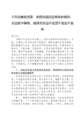 3月份廉政党课:发扬彻底的自我革命精神,永远吹冲锋号,确保党永远不变质不变色不变味同志们:全面从严治党永远在路上,党的自我革命永远在路上。当前,反腐败斗争形势依然严峻复杂,腐败存量尚未彻底清除,腐败增量仍在发生。面对依然严峻复杂的形势,反腐败绝对不能回头、不能松懈、不能慈悲,必须永远吹冲锋号。新时代新征程,要把严的基调、严的措施、严的氛围长期坚持下去,确保党永远不变质不变色不变味。必须持之以恒推进全面从严治党,以党的伟大自我革命破解大党独有难题,努力把党建设得更加坚强有力,引领和保障中国特色社会主义伟大事业继往开来、行稳致远。今天的廉政党课,重点从四个方面与大家进行交流。一、总结百年奋斗的宝贵历史经验,开辟新时代党的自我革命伟大实践的新境界自我革命是党百年奋斗的一条宝贵历史经验,也是管党治党、兴党强党的时代答案。敢于善于斗争,增强自身力量,打造过硬本领。敢于斗争才能让自我革命更加彻底。新时代下的党员干部,只有不断提升自己,增强自身能力和素养,才能拥有自我革命的勇气和动力。面对新时代的各项任务要求,必须认识到自身不足,敢于纠正,坚定斗争方向、学习斗争本领,将永远在路上的自我革命稳步向前推进。第一,理解找到跳出历史周期率的答案。从社会发展的历史周期率看,一个政权建立起来后,要保持兴旺发达、长治久安是很不容易的。如果不自省、不警惕、不努力,再强大的政权都可能走到穷途末路。从党自身的历史周期率看,先进的马克思主义政党不是天生的,而是在不断自我革命中淬炼而成的。党历经百年沧桑更加充满活力,其奥秘就在于始终坚持真理、修正错误。一百年来,党外靠发展人民民主、接受人民监督,内靠全面从严治党、推进自我革命,勇于坚持真理、修正错误,勇于刀刃向内、刮骨疗毒,保证了党长盛不衰、不断发展壮大。第二,理解解决大党独有难题。重要的一条是,要进一步健全全面从严治党体系。制度是管根本、管长远的,制度优势是一个政党、一个国家的最大优势。党的XXX提出我们要落实新时代党的建设总要求,健全全面从严治党体系,并对完善党的自我革命制度规范体系作出部署。完善党的自我革命制度规范体系,要坚持制度治党、依规治党,以党章为根本,以民主集中制为核心,完善党内法规制度体系,增强党内法规权威性和执行力,形成坚持真理、修正错误,发现问题、纠正偏差的机制。健全党统一领导、全面覆盖、权威高效的监督体系,完善权力监督制约机制,以党内监督为主导,促进各类监督贯通协调,让权力在阳光下运行。推进政治监督具体化、精准化、常态化,增强对一把手和领导班子监督实效。发挥政治巡视利剑作用,加强巡视整改和成果运用。落实全面从严治党政治责任,用好问责利器。第三,理解新时代新征程上推进党的自我革命。要弘扬伟大建党精神,着力增强党内政治生活的政治性、时代性、原则性、战斗性,克服党内政治生活的随意化、形式化、平淡化、庸俗化现象。要坚定维护党中央权威和集中统一领导,增强四个意识、坚定四个自信、做到两个维护,在思想上政治上行动上同以XXX同志为核心的党中央保持高度一致,不断增强党的政治领导力、思想引领力、群众组织力、社会号召力,确保我们党永葆旺盛生命力和强大战斗力。要始终与人民风雨同舟、与人民心心相印,想人民之所想,行人民之所嘱,不断把人民对美好生活的向往变为现实,在推进中国式现代化的进程中逐步实现全体人民的共同富裕。要把握历史大势,争取历史主动,始终保持昂扬奋进的精神状态,埋头苦干、担当作为,不断谱写新时代中国特色社会主义新篇章。二、发扬彻底自我革命精神,在伟大自我革命进程中永葆政治本色发扬彻底的自我革命精神,以永远在路上的坚韧和执着坚定不移推进全面从严治党。要聚焦坚决做到两个维护,进一步加强政治监督。巩固拓展学习贯彻XXX新时代中国特色社会主义思想主题教育成果,持续在深化内化转化上下功夫见实效,深刻感悟这一重要思想的真理力量和实践伟力,切实把理论武装的成果转化为做好本职工作、推动事业发展的实绩实效。加强对贯彻落实XXXXXX重要指示要求和党中央决策部署的政治监督,具体化确定监督事项、精准化纠治突出问题、常态化推动贯彻落实,加强全过程全链条监督,确保XXXXXX的殷殷嘱托全面落实在津沽大地上。严明党的政治纪律和政治规矩,持续盯住七个有之问题,加大查处力度,防微杜渐,自觉做政治上的明白人。第一,始终保持反腐败高压态势。XXXXXX在党的XXX报告中指出:腐败是危害党的生命力和战斗力的最大毒瘤,反腐败是最彻底的自我革命。历史证明,腐败是最容易颠覆政权的毒瘤,直接威胁到中国共产党的长期执政、中国社会的长治久安和人民群众的获得感、幸福感、安全感。新征程反腐败斗争,必须在铲除腐败问题产生的土壤和条件上持续发力、纵深推进。必须始终保持清醒头脑,坚持严的主基调不动摇,保持政治上、思想上、组
