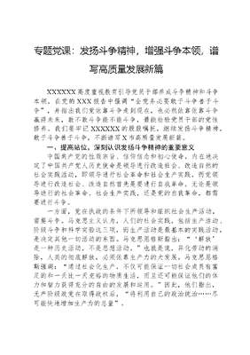 专题党课:发扬斗争精神,增强斗争本领,谱写高质量发展新篇XXXXXX高度重视教育引导党员干部养成斗争精神和斗争本领,在党的XXX报告中强调全党务必要敢于斗争善于斗争,并指出我们党依靠斗争走到现在,也必然依靠依靠斗争赢得未来,敢不敢斗争能不能斗争,最能检验党员干部的党性修养。我们要牢记XXXXXX的殷殷嘱托,继续发扬斗争精神,敢于斗争善于斗争,不断谱写X市高质量发展新篇。一、提高站位,深刻认识发扬斗争精神的重要意义中国共产党的性质宗旨、信仰信念和初心使命,内在地决定了中国共产党人历史使命是领导进行改造社会、改造自然的社会实践活动,即领导进行社会革命和社会生产实践,而党领导进行改造社会、改造自然首先是要进行自我革命。无论是领导进行的社会革命、社会生产实践,还是党的自我革命,都需要进行斗争。一方面,党在执政的条件下所领导和组织社会生产活动,需要斗争。马克思主义认为,人们的社会实践,包括生产活动、阶级斗争和科学实验这三项,而生产活动是最基本的实践活动,是决定其他一切活动的东西。马克思恩格斯指出:解放是一种历史活动,不是思想活动。也就是说,异化劳动的消除,人类的彻底解放,必须依靠生产力的大发展。马克思恩格斯强调:通过社会化生产,不仅可能保证一切社会成员有富足的和一天比一天充裕的物质生活,而且还可能保证他们的体力和智力获得充分的自由的发展和运用。因此,他们指出,无产阶级政党在取得政权后,将利用自己的政治统治……尽可能快地增加生产力的总量。党在全国执政后,必须领导人民扩大生产、提高效率、增进财富。毛泽东鲜明提出:我们的目标是要使我国比现在大为发展,大为富、大为强。在社会主义改造基本完成后,毛泽东向全党提出转变工作重心的要求:我们的根本任务已经由解放生产力变为在新的生产关系下面保护和发展生产力。在这个时期,要学会率领整个社会跟自然界作斗争,要把中国的面貌加以改变。改革开放以来,党中央反复强调经济建设为中心发展是执政兴国的第一要务聚精会神搞建设、一心一意谋发展,究其根本,也是领导人民进行社会生产活动。同样道理,共同富裕是社会主义的本质要求,但是,如果没有强大的生产力就无法创造出巨大的社会财富,人民也就无法在社会分配中获得更多的物质与精神财富,因此,必须依靠生产力发展积累起来足够的物质力量,实现真正的共同富裕。党的十八大以来,XXX反复强调,我国仍处于并将长期处于社会主义初级阶段的基本国情没有变,我国是世界最大发展中国家的国际地位没有变,并深刻地指出,以经济建设为中心是兴国之要,发展仍是解决我国所有问题的关键;发展是基础,经济不发展,一切都无从谈起。党的XXX进一步指出,高质量发展是全面建设社会主义现代化国家的首要任务。发展是党执政兴国的第一要务。没有坚实的物质技术基础就不可能全面建成社会主义现代化强国。首先,党领导人民群众进行的社会生产实践活动的本身,就是斗争。其次,社会生产实践也需要斗争,需要通过斗争、通过克服困难来不断解决发展中的问题。党的十八大以来,XXX多次强调创造美好的生活需要通过社会生产实践,需要经过奋斗和斗争。这就告诉我们,只要我们不忘初心,艰苦奋斗,撸起袖子加油干,就能创造美好的生活,也一定能够实现中华民族伟大复兴的中国梦。另一方面,党进行自我革命,使党自身过硬,需要斗争。文可居文库——海量学习资料,手机电脑均可下载www.wenkeju.com党的历史、党的理论和现实实践都告诉我们,从根本上说,党之所以成为领导核心,根本原因在于党的先进性。然而,党的先进性并不是一劳永逸的,对党的先进性的要求也需要与时俱进,进行党的建设是保持党的先进性的根本途径。中国特色社会主义进入新时代,世情国情党情深刻变化,我们党面临的挑战和风险更加复杂,面临着的四大考验和四种危险依然严峻复杂。与此同时,党内面临着一些突出问题,诸如一些党员干部信仰缺失、党性弱化、是非观念淡薄、原则性不强等影响党长期执政、国家长治久安、人民幸福安康的突出矛盾和问题。XXX反复强调,只有党自身是过硬的,才能担当起全面领导的重任,如何才能做到自身过硬呢?XXX创造性提出党的自我革命这一新时代党的建设理论与实践的重大主题,强调通过党的自我革命来引领社会革命。自我革命,顾名思义,就是自己对自己的根本性改造。就基本内容而言,党的自我革命主要包括两大方面:一方面,党自己主动地直面、克服和破解自身的毛病、缺点和问题,通过清除一切侵蚀党的健康肌体的病毒,以及旗帜鲜明地反腐败,确保党不变质、不变色、不变味,克服和消除导致其亡也忽焉的各种条件,确保党始终成为坚强领导核心。另一方面,主动地要求自己、约束自己、限制自己,使党牢记使命担当。这主要包括要以严的基调正风肃纪;严明党的政治纪律和政治规矩;严肃和规范党内政治