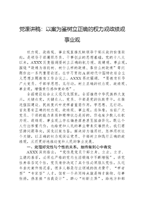 党课讲稿:以案为鉴树立正确的权力观政绩观事业观权力观、政绩观、事业观直接反映领导干部从政的价值取向,是领导干部履职尽责、干事创业的思想基础。党的十八大以来,AXXX反复强调要树立正确的权力观、政绩观、事业观,围绕政绩为谁而树、树什么样的政绩、靠什么树政绩等问题作出一系列重要论述。在学习贯彻A新时代中国特色社会主义思想主题教育工作会议上,AXXX再次强调,要教育引导广大党员、干部学思想、见行动,树立正确的权力观、政绩观、事业观,增强责任感和使命感。全面建设社会主义现代化国家,全面推进中华民族伟大复兴,关键在党,关键在人。党员、干部是党的执政骨干,在推进强国建设、民族复兴中发挥着重要作用,学思想、见行动,首先要有正确的权力观、政绩观、事业观。总体看,当前广大党员、干部的能力素质和精神状态是好的,但也有少数人在权力观、政绩观、事业观上存在偏差落差甚至扭曲异化,既让个人付出惨重代价,也给党和人民的事业带来灾难损失。我们要坚持问题导向,深化以案为鉴,解决好为谁用权、怎样用权这个关键,以正确的权力观保证党员、干部树立和践行正确的政绩观,从而更好地推动党和人民的事业发展。一、处理好党性与个性的关系,始终做到心中有党AXXX深刻指出,党性是党员干部立身、立业、立言、立德的基石,必须在严格的党内生活锻炼中不断增强。讲党性并非否定个性,党员身份决定了其个性必须服从党性。从近年查处案件情况看,很多人都是行业领域的技术骨干、学者型专家型人才,但有一个共同特点就是恃才傲物、行事张扬,热衷搞自我设计,醉心标新立异,给地方和部门发展带来灾难性后果和风险隐患。加强党性修养是安身立命必须解决好的重大课题,有坚强党性才有正确权力观、政绩观、事业观。毛泽东曾说,党员有两种个性,即创造性的个性和破坏性的个性。讲党性不是不要讲个性,而是要在正确张扬个性的同时更好彰显党性。错位的权力观、政绩观、事业观,根子在于背离党性、沾染了私心杂念,让破坏性的个性占了上风。党性修养需要在自我修炼、自我约束、自我改造中检视、砥砺和提高,不断发挥创造性的个性,沉下心来抓发展、惠民生、保稳定,努力干出一番无愧于党和人民的实实在在的业绩。二、处理好显绩与潜绩的关系,始终做到心中有民潜是显的基础,显是潜的结果。潜绩和显绩是一对矛盾统一体,实际上反映的也是大我和小我、长远和眼前的关系。有的领导干部执政一方,为了引起上级的关注,急功近利、好大喜功,喜欢做显山露水、表面风光的事,对那些虽不轰轰烈烈、但事关人民群众切身利益的小事、杂事、繁事、难事却不感兴趣;有的领导干部热衷于打造可视范围内高大上的面子工程形象工程,违背客观规律,脱离当地实际,搞破坏性开发、掠夺式经营,乱铺摊子,劳民伤财,使一代人的政绩成为几代人的包袱;有的领导干部热衷搞自我设计,醉心晋升路线图,一门心思想着如何能走得更快、升得更高,着重在唱功上做文章,而忽略做功,习惯于广播里有声、电视里有影、报纸上有文。有的欠发达地区的领导干部,贪图搞短、平、快,急于做出成绩来显示自己的才能和魄力,对当前、届内出效益的事情考虑得多,为今后和下届做铺垫的事考虑得少,结果造成解决一个问题,留下十个遗憾的后果。合抱之木,生于毫末;九层之台,起于累土。我们要坚持以人民为中心的发展思想,坚持人民至上,以实际行动践行好为民造福是最大政绩的理念,把长远利益、根本利益和眼前利文可居文库——海量学习资料,手机电脑均可下载www.wenkeju.com益、个人利益统一起来,以功成不必在我、功成必定有我的境界,以对人民和历史负责的态度,甘于做铺垫性的工作,甘于抓未成之事,多做一些功在当代、利在长远、惠及子孙的事情。政声人去后,民意闲谈中。人在仕途,不必对名声看得过重,而须时时考虑怎样才能做个对地方、对百姓有用的官,关键还要看群众满不满意、答不答应。为官一任,如果能造福一方百姓、推动一方发展、守护一方平安,从政声誉如何百姓心中自然有杆秤。三、处理好权力与责任的关系,始终做到心中有责有职就有权,有权就有责,用权受监督,这是共产党人权力运行中的铁律。权力为责任所系,领导干部只有视权力为一种责任时,才会珍惜、慎用权力,才能不误用、滥用权力。从近年查处案件情况看,有的党员领导干部独断专行、擅权妄为,凌驾于组织之上,凡是他定的事都不容置喙,把民主集中制异化为家长制,把执政部门当作自留地,把职责范围视为私家花园,以言代法、违规决策,搞一言堂、当一霸手,导致明规矩名存实亡、潜规则大行其道;有的失职渎职、弃权不为,躺平于得过且过,工作不负责任、不履行或者不正确履行职责,更有甚者玩忽职守、不担当不作为,慢作为假作为。一些基层领导对党员、干部存在的突出