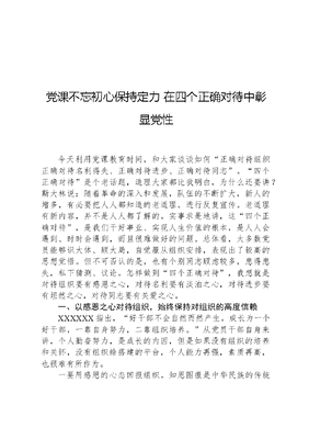 党课不忘初心保持定力 在四个正确对待中彰显党性今天利用党课教育时间,和大家谈谈如何正确对待组织正确对待名利得失、正确对待进步、正确对待同志。四个正确对待是个老话题,道理大家都比我明白,为什么还要讲?斯大林说:随着革命的深入和发展,队伍的不断扩大,新人的增多,有必要把人人都知道的老道理,进行反复宣传。老道理有新内容,并不是人人都了解的。实事求是地讲,这四个正确对待,是我们干好事业、实现人生价值的根本,是人人会遇到、时时会遇到,而且很难做好的问题。总体看,大多数党员能够识大体、顾大局,自觉服从组织安排,表现出了较高的思想觉悟。但不可否认的是,也有个别同志顾虑较多,患得患失,私下猜测、议论。怎样做到四个正确对待,我想就是对待组织要有感恩之心,对待名利要有淡泊之心,对待进步要有坦然之心,对待同志要有关爱之心。一、以感恩之心对待组织,始终保持对组织的高度信赖XXXXXX指出,好干部不会自然而然产生。成长为一个好干部,一靠自身努力,二靠组织培养。从党员干部自身来讲,个人勤奋努力,是成长的内因,但是如果没有组织的培养和关怀,没有组织给搭建的平台,个人能力再强,素质再高,也很难有所作为。一要用感恩的心态回报组织。知恩图报是中华民族的传统美德。大家可以回顾一下我们每个人的成长经历,我们许多人都是从一名普通青年,成长为今天的党员领导干部的,可以说,没有组织,就没有我们现在的生活。然而实际中,个别同志有时看不到这一点,比如,在个人成长进步上,总认为是自己努力奋斗的结果,与组织的培养没有多大关系;进步慢了,个人要求没有得到满足,就觉得组织亏欠了自己;有的尽管在个人进步上收获了很多,但横攀竖比总认为组织给予自己的还不够,甚至埋怨、闹情绪等等,这些都是对党组织缺乏感激之情、感恩之心的表现。工作中,我们不能只向组织伸手,更要想想我们给组织回报了什么,给单位建设贡献了什么。明成祖朱元璋在一次打仗时被困,一连几天都没有吃东西,差一点饿死,是一位老妇人给他吃了一碗饭,救了他的命。对此,他一直感激于心,当了皇帝以后还专程去看望老妇人,可谓是不忘一饭之恩。我们作为一名党员,受组织的恩情可以说远远大于一饭之恩,更应该懂得感恩图报。作为一名党员,我们都要强化组织意识、党性意识,多想想组织对自己的培养,多体谅体谅组织的难处,多为组织分忧,以听从安排的实际行动回报组织。这样,我们对组织就能多一些服从需要,少一些斤斤计较;多一些尊重理解,少一些牢骚埋怨。二要用求真的信念信任组织。过去有些同志信奉提拔靠关系、当官靠活动,所以一到干部调整、一有位置空缺的时候,便到处托关系、找门路。党的十八大以来,大气候越来越好,小环境越来越严,风清气正、生态良好。这几年我们在风气建设、选人用人上的公开公正,大家也有切身体会。作为一名党员,心理要健康,心态要阳光,相信组织一定会严格按原则办、按政策办、按规矩办、按程序办,用好机制选拔好干部,用好作风使用好干部;相信组织一定会充分考虑大家想进步、想发展的良好意愿,反复酝酿,权衡利弊,最大限度盘活现有资源,做到人岗相适、人尽其才。三是以大局利益为重服从组织。干部的选拔、任用和调配文可居文库——海量学习资料,手机电脑均可下载www. wenkeju .com 具有很强的政策性和导向性,必须按照政策法规来办,结合实际情况来调,根据岗位需要来选,离开了这些去搞个人设计,结果只能是期望值越高、失落感越强。作为一名党员,你只管干好自己的工作就行了,至于你的成长进步,组织上会考察,也会从单位建设大局考虑,群众也自有公论,党委在选人用人上,是根据岗位需要和个人优长而定的,是在广泛听取群众意见的基础上,慎重考虑研究决定的,也是经得起群众监督和历史检验的,不是说谁想干啥就干啥,谁想进步就进步,这些都是不以个人的意志为转移的,组织会对每名同志的成长进步高度负责,做出公正合理的安排。二、以淡泊之心对待名利,始终保持阳光健康的好心情这里有个小故事,乾隆皇帝有一次南巡,住在金山寺,一天和方丈到江边散步,乾隆见江上百舸争流,便问方丈:你可知江上笔宝有几艘?方丈从容回答两艘而已。乾隆笑道:这江上的笔宝往来如织,怎么只有两艘呢?方丈答到:我只看见一艘为名,一艘为利。乾隆听后点头称赞。现实生活中,名利也往往伴随着我们一生。如何正确对待名利得失,我们常说,平平淡淡才是真。甘于平淡,是人生追求的境界,也是履行宗旨的根本要求。一要懂得知足,始终如一干工作。有人说:得之,我幸不得,我命。如此而已。该是你的别人抢不去,不是你的也争不来。有这样的心态,才能处在一种智慧状态。现在我们的物质待遇与过去相比有了很大提高,我们应当感到知足。我看过这么一个故事:一个农民想要一块土地,去求地主。地主说:你从这里往外跑,每跑一段就插上一根竹竿,太阳落山