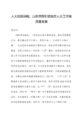 人大党课讲稿:以新思想引领地方人大工作高质量发展同志们:AXXX深刻指出,党的历次集中教育活动,都以思想教育打头,着力解决学习不深入、思想不统一、行动跟不上的问题。无论是延安时期厉行整风运动,改革开放初期开展全面整党,还是上世纪九十年代的三讲教育,还是新世纪以来深入学习实践科学发展观活动,一代代中国共产党人在学习教育中不断提高理论水平和实践能力,推动中国这艘东方巨轮在风浪中稳步前行。2013年,以为民务实清廉为主要内容,党的群众路线教育实践活动把学习教育贯穿始终,不断加强理论武装,为解决实际问题增添精神动力;2015年,三严三实专题教育在县处级以上领导干部中开展,将学习贯彻AXXX系列重要讲话精神作为重中之重,让严实成为终身习惯和自觉追求;2016年,两学一做学习教育把党的思想建设放在首位,党内教育从关键少数向广大党员拓展、从集中性教育向经常性教育延伸;2019年,新中国成立七十周年之际,不忘初心、牢记使命主题教育以理论学习有收获为首要目标,推动A新时代中国特色社会主义思想在党员内心深处扎根;2021年,建党百年之际,以学党史、悟思想、办实事、开新局为明确要求,党史学习教育引导全党同志回望历史来路、坚定历史自信、掌握历史主动、不断开拓新局。惕厉自省,慎终如始。新时代以来,接续开展的五次党内集中教育层层推进,将学习贯彻A新时代中国特色社会主义思想贯穿始终,持续深化理论武装,吹响了凝心聚力的奋进号角,为加强党的建设、推动全面从严治党向纵深发展作出了重要贡献,解决了许多新时代所面临的重大理论和现实问题。要把A新时代中国特色社会主义思想转化为坚定理想、锤炼党性和指导实践、推动工作的强大力量,汲取不懈奋斗的源泉动力,增强学思践悟的政治智慧,筑牢拒腐防变的堤坝防线,从而更有定力、更有自信、更有智慧地走好中国式现代化道路。下面,我以深学细悟强领会真信笃行抓落实以新思想引领地方人大工作高质量发展这一主题,从四个方面谈谈个人的认识体会,供大家参考。第一、新时代产生新思想文可居文库——海量学习资料,手机电脑均可下载www.wenkeju.com伟大时代孕育伟大思想,伟大思想引领伟大时代。这是一个什么样的时代?变是时代的主基调,新是党和国家事业发展的主旋律。同时,今天我们所面临挑战的复杂程度、解决问题的艰巨程度明显加大,难也成为大趋势。要深刻领悟A新时代中国特色社会主义思想的创新成果,在思想上来一个大解放、来一次大提升。(一)A新时代中国特色社会主义,回答了马克思主义往何处去的重大问题世界社会主义500年,从空想到科学、从理论到实践、从一国实践到多国发展,反映了人类对美好社会制度的执着追求,深刻改变着世界历史的发展进程。马克思主义创立170多年,在中国落地生根、开花结果,通过A新时代中国特色社会主义实现了新飞跃,开辟了新境界。如何推进马克思主义中国化时代化走向深入?AXXX曾在多个场合提出坚持把马克思主义基本原理同中国具体实际相结合、同中华优秀传统文化相结合。近日,XXX在文化传承发展座谈会上再次强调,在五千多年中华文明深厚基础上开辟和发展中国特色社会主义,把马克思文可居文库——海量学习资料,手机电脑均可下载www.wenkeju.com主义基本原理同中国具体实际,同中华优秀传统文化相结合是必由之路。这是我们在探索中国特色社会主义道路中得出的规律性认识,是我们取得成功的最大法宝。第一个结合,解决的是理论与实际、主观与客观的关系;第二个结合,解决的是古与今、中与外的关系。把两个结合定位为必由之路、最大法宝,特别是对第二个结合的强调,我认为有很深的战略考量。首先,这是对学习贯彻A新时代中国特色社会主义提出了新的更高要求。文化自信,是更基础、更广泛、更深厚的自信,文化认同是最持久、最深层的力量。在学习贯彻的过程中,如果能做到既观照现实,解决实际问题,又回溯历史,汲取精神力量,最终让中国共产党、中华民族形成统一的思想、统一的意志、统一的行动,让A新时代中国特色社会主义思想成为政治上的坚定信仰,成为我们的文化符号和精神标识,这才是真正学到位了。其次,这是对马克思主义中国化时代化改变世界提出了新的更高要求。传承和发展马克思主义的庄严使命,当代中国共产党人责无旁贷。我们坚信,把两个结合融在一起,文可居文库——海量学习资料,手机电脑均可下载www.wenkeju.com互相契合,彼此成就,使马克思主义呈现出更多中国特色、中国风格、中国气派,使中华优秀传统文化成为现代的、创新的、有生机的,将把世界带向更光明的未来。(二)A新时代中国特色社会主义,回答了中国往何处去的重大问题中国式现代化,是A新时代中国特色社会主义的一个原创性科学概念,是贯穿党的XXX报