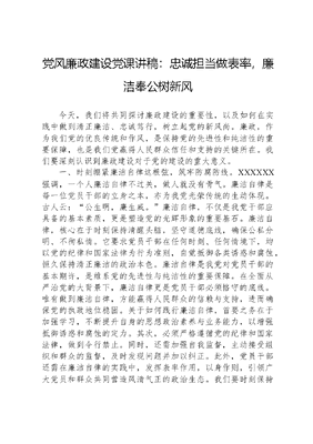 党风廉政建设党课讲稿:忠诚担当做表率,廉洁奉公树新风今天,我们将共同探讨廉政建设的重要性,以及如何在实践中做到清正廉洁、忠诚笃行,树立起党的新风尚。廉政,作为我们党的优良传统和作风,是保持党的先进性和纯洁性的重要保障,也是我们党赢得人民群众信任和支持的关键所在。我们要深刻认识到廉政建设对于党的建设的重大意义。一、时刻绷紧廉洁自律这根弦,筑牢防腐防线。XXXXXX强调,一个人廉洁自律不过关,做人就没有骨气。廉洁自律是每一位党员干部的立身之本,亦为我党光荣传统的生动体现。古人云:公生明,廉生威。廉洁自律,不仅是我党干部应具备的基本素质,更是塑造党的光辉形象的重要基石。廉洁自律,核心在于时刻保持清醒头脑,坚守道德底线,确保公私分明、不徇私情。它要求党员干部在任何时刻、任何情境下,均以党的纪律和国家法律为行为准则,自觉抵御各类诱惑和腐蚀,恒久保持清正廉洁的政治本色。廉洁自律是我党对党员干部的基本期许,是维系党的先进性与纯洁性的重要保障。在全面从严治党的大背景下,廉洁自律更是党员干部必须恪守的底线。唯有做到廉洁自律,方能赢得人民群众的信赖与支持,进而确保党的执政地位稳固。关于如何践行廉洁自律,首要之务在于加强学习,不断提升自身的思想政治素养与业务能力,以增强抵御诱惑和腐蚀的定力。其次,必须严格遵循党的纪律和国家法律,做到令行禁止。同时,还需加强自我监督,主动接受组织和群众的监督,及时发现问题并加以纠正。此外,党员干部还需在廉洁自律的实践中,发挥表率作用,以身作则,引领广大党员和群众共同营造风清气正的政治生态。我们要时刻保持对权力的敬畏之心,清醒认识到权力是一把双刃剑,用得好可以为人民谋福祉,用得不好则会损害党的形象,损害人民的利益。二、时刻保持忠诚担当强本领,铸就坚强党性。忠诚是党员的基本品质,担当是党员的职责所在。在革命战争年代,无数共产党员以坚定的信念和无私的奉献,书写了忠诚担当的壮丽篇章。他们为了民族独立和人民解放,不畏艰难险阻,不惜流血牺牲,用实际行动诠释了共产党员的忠诚与担当。在新时代的征程中,忠诚担当同样是我们党员干部的必备品质。忠诚,就是要始终坚守党的信仰,坚定理想信念,对党忠诚老实,言行一致,始终与党中央保持高度一致。担当,就是要敢于面对困难和挑战,勇于承担责任,积极作为,不断推动事业发展。作为党员干部,我们要将忠诚担当内化于心、外化于行。在工作中,要始终坚持以人民为中心的发展思想,积极回应群众关切,切实解决群众问题。在面对困难和挑战时,要敢于迎难而上,勇于担当作为,以实际行动赢得人民群众的信任和支持。忠诚担当,是党员干部的精神内核,也是我们党不断取得胜利的重要法宝。忠诚,意味着对党的信仰、对人民的承诺始终不渝;担当,则要求我们在面对困难和挑战时,敢于迎难而上,勇于承担责任。忠诚担当,首先要体现在对党的忠诚上。我们要始终坚定理想信念,牢记党的宗旨,不断增强四个意识,坚定四个自信,做到两个维护。无论面对何种困难和挑战,我们都要始终与党中央保持高度一致,确保党的决策部署得到贯彻执行。担当精神是党员干部的必备品质。在新时代背景下,我们要敢于担当、善于担当,勇于直面问题、解决问题。面对复杂多变的形势和任务,我们要敢于创新、敢于突破,不断探索新的工作思路和方法,推动各项工作取得新成效。三、切实转变真抓实干好传统,创造实绩实效。XXXXXX强调,新征程是充满光荣和梦想的远征,没有捷径,唯有实干,提出大道至简,实干为要的根本要求。真抓实干,文可居文库——海量学习资料,手机电脑均可下载www.wenkeju.com是党员干部应秉持之工作理念与行动纲领。空谈误国,实干兴邦,我们既要坚定理想信念,坚守崇高道德情操,更要脚踏实地、真抓实干,以实际行动彰显担当。唯有如此,方能确保党的决策部署落地生根,转化为具体成效,赢得人民群众广泛认可与支持。笃行实干,要求我们务必保持务实高效的工作作风。在工作中,应深入调查研究,全面把握实际情况,确保决策的科学性和实效性。同时,需注重细节,精益求精,确保每项工作都经得起检验。此外,要善于总结提炼实践经验,不断反思优化工作方法,推动各项工作取得新进展。笃行实干,亦应体现在对人民群众的深情厚谊和贴心服务上。我们应时刻关注群众需求,积极回应群众关切,为他们排忧解难。在解决群众问题的过程中,要耐心细致、热情周到,让群众切实感受到党的关怀与温暖。四、不断厚植为民情怀做表率,引领新风正气。群众利益无小事,一枝一叶总关情。党的十八大以来,XXXXXX以大爱无疆、心系苍生的博大情怀,怀着为中国人民谋幸福、为中华民族谋复兴的殷殷初心和崇高使命,引领全党与人民同呼吸、共命运、心连心,朝着实现中华民族伟大复兴的宏伟目标奋勇前进。情结之深与思想之妙,从来都是相辅相成的。坚持以人民为中心的发展思想,