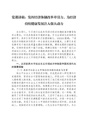 党课讲稿:发挥经济体制改革牵引力,为经济持续健康发展注入强大动力各位同仁,今日我们在此共同探讨经济体制改革的重要性和必要性,以及具体落实方案的实施。作为全面深化改革的关键环节,其牵引作用具有举足轻重的地位。XXXXXX强调:深化经济体制改革仍是进一步全面深化改革的重点,主要任务是完善有利于推动高质量发展的体制机制,塑造发展新动能新优势,坚持和落实两个毫不动摇,构建全国统一大市场我们必须深刻认识到,发挥经济体制改革的牵引作用,就是要坚定不移地以供给侧结构性改革为主线,深化要素市场化配置改革,加速完善社会主义市场经济体制,确保改革成果惠及广大人民群众。一、认识到高水平社会主义市场经济体制是中国式现代化的重要保障(一)高水平社会主义市场经济体制的提出与背景高水平社会主义市场经济体制,系我党在深入研究国内外发展经验、紧密结合中国国情的基础上,所提出的一项具有重大战略意义的决策。此决策深刻体现了我们党对经济发展规律的精准把握和对社会主义市场经济理论的创新,成为新时代中国经济发展的根本指导原则。构建高水平社会主义市场经济体制,不仅是实现我国经济持续健康发展的核心要素,更是推动社会全面进步、促进人的全面发展的关键支撑。这一体制,既继承了世界市场经济的先进成果,又坚守了社会主义基本制度,充分发挥了市场在资源配置中的决定性作用,并进一步优化了政府功能,实现了社会主义市场经济体制的全面升级。在此基