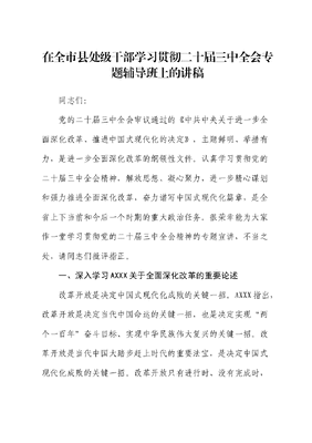 在全市县处级干部学习贯彻二十届三中全会专题辅导班上的讲稿同志们:党的二十届三中全会审议通过的《中共中央关于进一步全面深化改革、推进中国式现代化的决定》,主题鲜明、举措有力,是进一步全面深化改革的纲领性文件。认真学习贯彻党的二十届三中全会精神,解放思想、凝心聚力,进一步精心谋划和强力推进全面深化改革,奋力谱写中国式现代化篇章,是全省上下当前和今后一个时期的重大政治任务。很荣幸能为大家作一堂学习贯彻党的二十届三中全会精神的专题宣讲,不当之处,请同志们批评指正。一、深入学习AXXX关于全面深化改革的重要论述改革开放是决定中国式现代化成败的关键一招。AXXX指出,改革开放是决定当代中国命运的关键一招,也是决定实现两个一百年奋斗目标、实现中华民族伟大复兴的关键一招。改革开放是当代中国大踏步赶上时代的重要法宝,是决定中国式现代化成败的关键一招。改革开放只有进行时、没有完成时,推进中国式现代化,必须进一步全面深化改革开放,不断解放和发展社会生产力、解放和增强社会活力。要坚持党的领导。总结改革开放四十多年的经验,总结新时代十多年全面深化改革的经验,AXXX指出,坚持党的领导,全面从严治党,是改革开放取得成功的关键和根本。全面深化改革必须加强和改善党的领导,充分发挥党总揽全局、协调各方的领导核心作用。前进道路上,我们必须增强四个意识、坚定四个自信、坚决做到两个维护,把党的领导贯彻和体