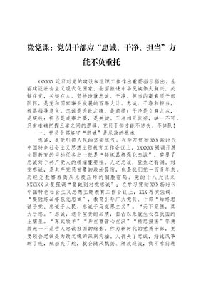 微党课:党员干部应忠诚、干净、担当方能不负重托XXXXXX近日对党的建设和组织工作作出重要指示指出,全面建设社会主义现代化国家,全面推进中华民族伟大复兴,关键在党,关键在人。坚持造就忠诚、干净、担当的高素质干部队伍,是党和国家事业发展的百年大计。忠诚、干净和担当,极具指导意义。忠诚是为政之魂,是前提;干净是立身之本,是底线;担当是成事之要,是关键。三者相互依存,缺一不可,只有准确把握三者之间的逻辑,党员干部才能不迷失、不掉队!一、党员干部恪守忠诚是从政的根本忠诚,是党引领人民的坚实底气。在学习贯彻XXX新时代中国特色社会主义思想主题教育工作会议上,XXXXXX强调开展主题教育的目标任务之一就是锤炼品格强化忠诚,突显了忠诚对于共产党人的极端重要性。人之忠诚,犹鱼之有渊。对党忠诚,是共产党员首要的政治品质,也是我们党一百多年来,历经无数磨难而从未被压垮的制胜密码。党的十八大以来XXXXXX反复强调要做到对党忠诚;在学习贯彻XXX新时代中国特色社会主义思想主题教育工作会议上,XXX再次强调,要锤炼品格强化忠诚,教育引导广大党员、干部始终忠诚于党、忠诚于人民、忠诚于马克思主义。天下至德,莫大乎忠。忠诚,这个宝贵的品质,自古以来就生长在我国的土壤里。苏武牧羊身在曹营心在汉精忠报国等典故无一不是古人忠诚报国的缩影。作为新时代的党员干部,更要领会忠诚是为政之魂的深刻内涵。人丧失了忠诚,好比风筝断了线,航船失了舵,就会随风飘荡、随波逐流,找不准前进的方向。我们要坚决做到对党忠诚,矢志不渝跟党走,党号召的坚决响应、党要求的坚决做到、党反对的坚决抵制,以实际行动践行对党忠诚。党员干部要对党绝对忠诚,坚定不移贯彻执行党的理论、路线、方针和政策,不断增强四个意识,坚定四个自信,做到两个维护。要坚定理想信念,始终站稳政治立场,增强政治意识,提高政治敏锐性和政治鉴别力,以坚定的理想信念、坚强的党性意志,捍卫自己在党旗下的誓言。要永葆初心使命,秉持赶考的清醒和坚定,勇于战胜前进道路上的各种艰难险阻,为中国人民谋幸福,为中华民族谋复兴。二、党员干部干净是做事的基础干净,是党为人民服务的赤诚之心。清正廉洁是干事创业之本。XXXXXX在内蒙古考察时强调:要弘扬清廉之风,教育各级领导干部牢固树立正确权力观,全面查找廉洁风险点,筑牢思想防线,坚守法纪红线。《周礼》有云,廉有六义:一曰廉善,二曰廉能,三曰廉敬,四曰廉正,五曰廉法,六曰廉辨。这六廉是最早的官吏考核标准,即为善良、能干、敬业、公正、守法、明智。廉洁历来被视作从政的基石,古代士大夫尚且懂得廉洁是从政之基、为人之本,今天的党员干部更应将清廉的从政之道当作一种生活习惯和生活方式,永葆正身廉心、立住修身廉行、涵养守身廉风,为自己打入廉洁的防腐剂。清正廉洁是党员干部的立身之本,是推动新时代新征程党和国家事业发展的坚实保障。广大党员干部要自觉用XXX新时代中国特色社会主义思想改造主观世界,拧紧廉洁螺丝,上紧廉洁发条,涵养廉洁风骨,永葆清正廉洁政治本色,要摒弃官念,能够放下架子、俯下身子、放下面子,把自己当做群众,善于站在群众的角度看问题、想事情、做决策,实现民有所呼,我有所应;民有所盼,我有所为。要固守民念,始终把人民群众利益放在心中最高位置,思民之所想、念民之所忧、行民之所盼,用实际行动去诠释和群众的鱼水情。要强化观念,时刻筑牢思想防线,常修从政之德、常怀律己之心、常思贪欲之害、常戒非分之想,使党纪党规内化于心、外化于行。二、党员干部担当是干成事的关键担当,是党在人民心中的巍峨长城。干事担当是干部的职责和价值所在。XXXXXX在党的XX大作的报告,明确了新时代新征程党的使命和任务。在全面建设社会主义现代化国家、全面推进中华民族伟大复兴的新征程上,必须有一支政治过硬、适应新时代要求、敢于担当作为且具备领导现代化建设能力的高素质干部队伍。我们党是生于忧患、成长于忧患、壮大于忧患的政党。敢于担当是中国共产党人的鲜明品格,我党自其成立的那一刻起,就把为中国人民谋幸福、为中华民族谋复兴作为自己的担当;战争年代,大敌当前,我军指挥官敢于横刀立马、战士们勇于亮剑是一种担当;改革开放初期,改革先驱者敢于创新,杀出一条血路,是一种担当。回顾党的历史特别是改革开放以来的发展历程,事业向前推进的每一步都离不开广大干部群众的奋发努力,正是一代代中国共产党人心存忧患、肩扛重担,才团结带领中国人民不断从胜利走向新的胜利。XXXXXX指出,要牢记空谈误国、实干兴邦的道理,坚持知行合一、真抓实干,做实干家。能不能坚持问题导向抓实践、办实事,推动群众急难愁盼问题有效解决,既是对党员干部宗旨意识的检验