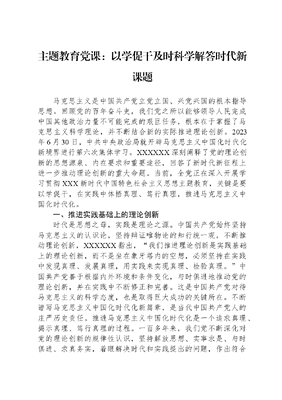 主题教育党课:以学促干及时科学解答时代新课题马克思主义是中国共产党立党立国、兴党兴国的根本指导思想。回顾党的百年奋斗史,我们党之所以能够领导人民完成中国其他政治力量不可能完成的艰巨任务,根本在于掌握了马克思主义科学理论,并不断结合新的实际推进理论创新。2023年6月30日,中共中央政治局就开辟马克思主义中国化时代化新境界进行第六次集体学习。XXXXXX深刻阐释了党的理论创新的思想源泉、内在要求和重要途径,回答了新时代新征程上进一步推动理论创新的重大命题。当前,全党正在深入开展学习贯彻XXX新时代中国特色社会主义思想主题教育,关键是要以学促干,在实践中体悟真理、笃行真理,推进马克思主义中国化时代化。一、推进实践基础上的理论创新时代是思想之母,实践是理论之源。中国共产党始终坚持马克思主义的认识论,坚持辩证唯物论的知行统一观,不断推动理论创新,XXXXXX指出,我们推进理论创新是实践基础上的理论创新,而不是坐在象牙塔内的空想,必须坚持在实践中发现真理、发展真理,用实践来实现真理、检验真理。中国共产党善于根据内外环境和条件变化,与时俱进地推动党的理论创新,并在实践中不断修正和完善。这是中国共产党对待马克思主义的科学态度,也是取得巨大成功的关键所在。不断谱写马克思主义中国化时代化新篇章,是当代中国共产党人的庄严历史责任。推进马克思主义中国化时代化是一个追求真理、揭示真理、笃行真理的过程。一百多年来,我们党不断深化对党的理论创新的规律性认识,坚持解放思想、实事求是、与时俱进、求真务实,着眼解决时代和实践提出的问题,作出符合中国实际和时代要求的正确回答,得出符合客观规律的科学认识,形成与时俱进的理论成果,推动马克思主义基本原理同中国具体实际相结合,形成了理论和实践相结合的优良作风。在实践基础上推动理论创新,是我们党推动理论创新的重要规律性认识。面对新时代新征程,我们只有及时地研究新时代的新情况,解决新问题,才能顺利推进社会主义现代化建设事业。经过长期努力,中国特色社会主义进入了新时代,对党治国理政提出了一系列重大时代课题。XXXXXX指出,一切划时代的理论,都是满足时代需要的产物。用以观察时代、把握时代、引领时代的理论,必须反映时代的声音,绝不能脱离所在时代的实践,必须不断总结实践经验,将其凝结成时代的思想精华。新时代坚持和发展什么样的中国特色社会主义、怎样坚持和发展中国特色社会主义,建设什么样的社会主义现代化强国、怎样建设社会主义现代化强国,建设什么样的长期执政的马克思主义政党、怎样建设长期执政的马克思主义政党,对新时代的理论和实践结合提出了更高的要求。党的十八大以来,以XXX同志为核心的党中央开辟了马克思主义中国化时代化新境界。我们党把理论和实践相结合,深入回答了关系党和国家事业发展、党治国理政的一系列重大时代课题。我们党勇于进行理论探索和创新,以全新的视野深化了对共产党执政规律、社会主义建设规律、人类社会发展规律的认识,取得重大理论创新成果,把XXX新时代中国特色社会主义思想确立为我们党的指导思想。马克思主义关于认识发展的理论认为,基于实践的由浅入深是认识发展和深化的关键环节。只有经过实践,才能在实干中更好地领悟真理、笃行真理、发展真理。要通过实践而发现真理,又通过实践而证实真理和发展真理。当前,我们党正在深入开展学习贯彻XXX新时代中国特色社会主义思想主题教育。只有把理论和实践相结合,以实干笃行为抓手,将学干相融,以学促干、以干践学,才能用党的创新理论统一全党思想,解决经济社会发展和党的建设中存在的各种矛盾问题,防范化解重大风险,推动中国式现代化取得新进展新突破2023年7月,XXXXXX在江苏考察时对开展主题教育提出明确要求,对以学促干作了深刻阐述,要求广大党员干部要坚持学思用贯通、知信行统一,匡正干的导向,增强干的动力,形成干的合力,在以学促干上取得实实在在的成效,这些要求,为新时代推进党的理论创新提出了明确的遵循。二、以学促干,匡正干的导向以学促干为谁干,其导向在于人民。马克思主义是为人民立言,为人民代言的理论,人民性是马克思主义的本质属性。中国共产党是用马克思主义武装起来的无产阶级政党,一经诞生,就把为中国人民谋幸福、为中华民族谋复兴确立为自己的初心使命。为人民服务,紧密联系人民群众,这既是中国共产党的立党之本、成事之基、制胜之道,也是中国共产党相比于其他一切政党的显著优势。XXXXXX指出,要教育引导广大党员、干部牢固树立以人民为中心的发展思想,坚持一切为了人民、一切依靠人民,自觉问计于民、问需于民,始终同人民同呼吸、共命运、心连心。坚持以人民为中心的发展思想,是以XXX同志为核心的党中央对中国共产党人民观的创造性继承和发展,是马克思主义理论认识和行动实践的统一,是中国特色社会主义伟大实践和理论总结的结晶,表明
