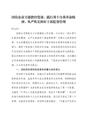 国有企业主题教育党课:践行勇于自我革命精神,从严从实抓好干部监督管理同志们:按照公司党组关于主题教育工作安排,今天我以践行勇于自我革命精神,从严从实抓好干部监督管理为题为大家讲授党课,本次党课通过与大家共同学习领会党的自我革命的重大历史意义、做好干部监督工作的时代内涵,分析总结我们党在全面从严治党的历史进程中干部队伍建设取得的成功做法和宝贵经验,提出对新时代下如何加强干部监督工作的思考和举措,从而推动公司党的建设和组织工作高质量发展。下面结合近期学习工作感悟,与大家分享四点体会:一、深刻领会党的自我革命的重大历史意义坚持勇于自我革命、全面从严治党是我们党最鲜明的政治品格和优良传统,也是百年大党永葆青春活力的密码。XXXXXX指出我们党历史这么长、规模这么大、执政这么久,如何跳出治乱兴衰的历史周期率?毛泽东同志在延安窑洞里给出了第一个答案,这就是只有让人民起来监督政府,政府才不敢松懈;经过百年奋斗特别是党的十八大以来新的实践,我们党又给出了第二个答案,这就是自我革命。党的XX大报告指出,全面从严治党永远在路上,党的自我革命永远在路上,决不能有松劲歇脚、疲劳厌战的情绪,必须持之以恒推进全面从严治党,深入推进新时代党的建设新的伟大工程,以党的自我革命引领社会革命。(一)自我革命开辟出政党永葆青春活力的新路中国共产党历经百年风雨仍然风华正茂,核心密码就在于党敢于直面自身问题、勇于自我革命。回顾党百年奋斗史,中国共产党人始终以刀刃向内的政治勇气推进自我革命,不断去腐生肌坚持在化解矛盾的斗争中自我净化,在解决难题的斗争中自我完善,在争取工作主动的斗争中自我革新,在防范化解风险的斗争中自我提高;永不自满、从不懈怠,在全面从严治党中加强党的先进性与纯洁性建设,开辟出政党永葆青春活力的新路。(二)自我革命开辟出政党不变质、不变色、不变味的新路百年来党始终坚持人民至上的政治立场和价值追求,在自我革命中不断锤炼无私品质,从不代表任何利益集团、任何权势团体、任何特权阶层的利益,所付出的一切努力、进行的一切斗争作出的一切牺牲,都是为了人民;不断锤炼无我品质,坚定马克思主义信仰,坚定人民立场,坚定道路自信,为人民幸福和民族复兴勇于自我革命;不断锤炼无畏品质,以刮骨疗毒、壮士断腕的勇气,开辟出一条确保党的先锋队本质不变、以人民为中心本色不变、优良作风本味不变的新路。(三)自我革命开辟出政党自我监督的新路中国共产党是一个立党为公、执政为民的党,是一个没有任何私利的党,这就决定了中国共产党能够从党的性质和根本宗旨出发,解决好自我监督问题。党的十八大以来,我们党探索出一条通过执政党自我革命实现自我监督的新路。这条新路在实践中通过不断完善自我监督的方式方法,实现对全体党员干部无禁区无死角、全覆盖的监督,保证把人民赋予的权力始终用来为人民服务。这条新路强调紧盯关键少数,以更高的标准、更严的要求加强对关键少数的监督,实现了政党监督理论的重大突破。二、深刻把握做好干部监督工作的时代内涵(一)做好干部监督是纵深推进全面从严治党的重要抓手党要管党,首先是管好干部;从严治党,关键是从严治吏。重视和加强干部队伍建设,是我们党的优良传统和基本经验,我们党之所以能够始终保持强大的创造力、凝聚力、战斗力,成为革命、建设、改革事业发展的中流砥柱,团结带领人民战胜各种艰难险阻、取得一个又一个胜利,一个十分重要的原因就在于高度重视培养造就能够担当重任的干部队伍。党的十八大以来,党中央从进行具有许多新的历史特点的伟大斗争出发,把干部队伍建设放在管党治党、治国理政的突出位置来抓,全面从严治党锻造出过硬干部队伍,推动党和国家事业取得历史性成就、发生历史性变革。从从严治党的传统到XXXXXX提出全面从严治党,既是一种历史的传承,也是党建理论发展的逻辑必然,XXXXXX反复强调的严格管理、科学管理干部队伍,成为不断推进全面从严治党的重要抓手。当前随着改革深化,社会价值观呈现出多元化倾向,面对各种环境影响,免疫力不强的党员干部是抵挡不住各种诱惑的,做好新形势下干部监督工作,是推进干部作风建设、推进企业和谐发展的有效途,有利于提高领导干部治企能力、保持党员的先进性,有利于建立良好的政治生态。(二)做好干部监督工作是建设高素质专业化干部队伍的客观需要党的XX大报告强调,全面建设社会主义现代化国家,必须有一支政治过硬、适应新时代要求、具备领导现代化建设能力的干部队伍。这是党中央着眼于新形势新任务对干部队伍建设提出的基本要求。当前,世界百年未有之大变局加速演进,我国发展进入战略机遇和风险挑战并存、不确定难预料因素增多的时期越是目标远大、任务艰巨,越是形势复杂、挑战严峻,越需要培养造就一支德才兼备、忠诚干净担当的高素质专业化干部队伍。党的十八大以来,XXXXXX始终高度关