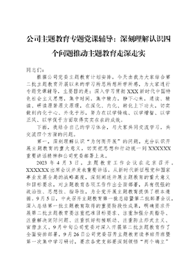 公司主题教育专题党课辅导:深刻理解认识四个问题推动主题教育走深走实同志们:根据公司党委主题教育计划安排,今天由我为大家结合第二批主题教育开展以来的学习所思所想所学所感,为大家进行专题党课辅导,主要目的是:深入学习贯彻XXX新时代中国特色社会主义思想,集中时间,集中精力,静下心来,通读、精读、研读原著原文原理,在深化、内化、转化上下功夫,切实做到内化于心、外化于形,努力在以学铸魂、以学增智、以学正风、以学促干方面取得实实在在的成效。下面,我结合自己的学习体会,与大家共同交流学习,共交流四个方面的问题。第一,深刻理解认识为何而开展的问题,充分认识开展主题教育的重大意义,切实把思想和行动统一到XXXXXX重要讲话精神和公司党委部署上来。2023年4月3日,主题教育工作会议在北京召开。XXXXXX出席会议并发表重要讲话,从新时代新征程党和国家事业发展全局的战略高度,深刻阐述开展主题教育的重大意义和目标要求,对主题教育各项工作作出全面部署,具有很强的政治性、思想性、指导性,为全党开展主题教育提供了根本遵循。9月5日,中央召开主题教育第一批总结暨第二批部署会议,深入总结第一批主题教育取得的重要阶段性成果,明确要求开展第二批主题教育要注重把准目标要求、注重加强分类指导、注重解决实际问题、注重抓好衔接联动、注重防止形式主义、官僚主义。9月中旬公司党委对深入开展第二批主题教育作了全面安排部署,9月26日公司党委召开主题教育读书班开班暨第一次集中学习研讨,要求各党支部要深刻领悟两个确立的决定性意义,切实增强四个意识、坚定四个自信、坚决做到两个维护,深刻认识开展主题教育的重大政治意义、实践意义、历史意义和时代意义,进一步增强抓好主题教育的思想自觉、政治自觉、行动自觉,以强烈的政治担当和责任使命把主题教育抓实抓好抓出成效。第二,深刻理解认识理论先行是先导的问题,重点把握好开展主题教育是持续推动用XXX新时代中国特色社会主义思想武装头脑指导实践推动工作的迫切需要。新时代10年,我们党顺应时代发展新要求,创立了XXX新时代中国特色社会主义思想。XXX新时代中国特色社会主义思想气势恢宏、博大精深,是当代中国的马克思主义、21世纪马克思主义。开展主题教育,就要以学习贯彻XXX新时代中国特色社会主义思想为主线,坚持思想建党、理论建党,坚持学思用贯通、知信行统一,推动全体党员干部全面系统学、深入思考学、联系实际学,切实筑牢信仰之基、补足精神之钙、把稳思想之舵。理论学习往心里走。公司党委不断深化理论武装,充分发挥领导班子领学促学、示范带动作用,坚持先学一步、学深一层,进行党委理论中心组集中学习、专题研讨,把党的创新理论与解决实际问题紧密结合。下发主题教育书籍250余册,组织基层党支部学习党的XX大报告、《XXX新时代中国特色社会主义思想专题摘编》等学习材料20余次,将学习、工作热情转化为攻坚克难、干事创业的强大动力,为开展好主题教育打下坚实基础。第三,深刻理解认识从严从紧从实的问题,切实把握好开展主题教育是推进新时代党的建设的迫切需要。党的十八大以来,以XXX同志为核心的党中央,坚定不移推进伟大自我革命,作出全面从严治党战略部署,开创了党的建设新局面,明确提出了党的建设总要求,对推进新时代党的建设作出了全面部署,为新时代党的建设指明了方向和提供了遵循。我们要认真落实新时代党的建设总要求,坚持党要管党,全面从严治党,坚持正风肃纪不停步、反腐惩恶不懈怠、严肃问责不松劲。在新的历史条件下,我们也要清醒地看到,对标对表新时代党的建设总要求,全面从严治党任务艰巨,党内政治不纯、思想不纯、组织不纯、作风不纯的问题依然存在,违反政治纪律、组织纪律的问题时有发生。作为党员干部,不仅要把严与实的要求贯穿主题教育始终,更要在日常工作中久久为功,将严的精神与实的作风贯彻始终。廉洁奉公树立新风是这次主题教育要达到的具体目标之一,建设廉洁文化,就是要倡导立足我们的实际工作岗位,廉洁奉公、诚实守信、爱岗敬业,不断规范和约束我们的思想与行为,增强我们拒腐蚀、永不沾的能力,以营造清正廉洁、公道正派的工作氛围为指向,使廉洁成为一种习惯、成为一种文化自觉,让廉洁文化深入到我们生活的每个方面。广大党员干部要以开展主题教育为契机,深入贯彻新时代党的建设总要求,始终坚持问题导向,全面推进党的政治建设、思想建设、组织建设、作风建设、纪律建设,把制度建设贯穿其中,建设忠诚干净担当的干部队伍。第四,深刻理解认识人民至上的问题,紧贴实际把握好开展主题教育是强化宗旨观念,全心全意为人民服务的迫切需要。全心全意为人民服务是党的根本宗旨,通过开展主题教育我们要持续强化广大党员干部的宗旨意识、服务意识,坚持以人民为中心的发展思想,多干群众期盼和急需办的事,多干群众受益和得实惠的事,多干