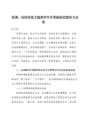 党课:持续深化主题教育牢牢掌握新思想的方法论同志们:所谓方法论,是关于认识世界、改造世界方法的理论。从哲学的层面上说,就是人们认识世界、改造世界的一般方法,是人们用什么样的方式、方法来观察、认识事物和处理问题。这是方法论的最高层次。在哲学的层面下,还有各个具体学科、具体方面的方法。一个科学理论,所体现出的方法论,既包括这个理论中对方法论的直接论述,也包括体现在理论内容、理论体系中的方法论。借此机会,由我为大家作一堂党课报告,与同志们共同交流。一、XXX新时代中国特色社会主义思想对方法论的直接论述XXXXXX高度重视马克思主义方法论问题。党的XX大报告中所阐述的两个结合六个坚持,是对XXX新时代中国特色社会主义思想中世界观和方法论的直接论述。(一)XXXXXX高度重视方法论XXXXXX高度重视方法论,多次阐述方法论的重要性,从不同的角度论述要重视方法论问题。在要求党的干部要具备方法论的素养时指出:新干部、年轻干部尤其要抓好理论学习,通过坚持不懈学习,学会运用马克思主义立场、观点、方法观察和解决问题,坚定理想信念。在论述把握我国社会发展的阶段性特征时指出:要坚持辩证唯物主义和历史唯物主义的方法论。在讲到经济发展时强调:我们不论主观上怎么想,但不能违背客观规律。在总结党的历史经验特别是领导改革开放的历史经验时强调:我们要增强战略思维、辩证思维、创新思维、法治思维、底线思维,加强宏观思考和顶层设计坚持问题导向。在谈到科学对待马克思主义时指出:我们要坚持和运用辩证唯物主义和历史唯物主义的世界观和方法论,坚持和运用马克思主义立场、观点、方法。在论述党的十八大以来的理论创新时指出:要把握好新时代中国特色社会主义思想的世界观和方法论,坚持好、运用好贯穿其中的立场观点方法。这些论述对于我们坚持和运用方法论有重要的指导意义。(二)明确提出了两个结合马克思主义中国化的两个结合,是XXXXXX在庆祝中国共产党成立100周年大会上的讲话中明确提出的新论断。党的十九届六中全会决议把两个结合的论断写进坚持理论创新的历史经验的总结中。党的XX大报告又指出:只有把马克思主义基本原理同中国具体实际相结合、同中华优秀传统文化相结合,坚持运用辩证唯物主义和历史唯物主义,才能正确回答时代和实践提出的重大问题,才能始终保持马克思主义的蓬勃生机和旺盛活力。两个结合是世界观和方法论,首先,XXXXXX在论述两个结合时,是和辩证唯物主义、历史唯物主义密切结合在一起的,两个结合阐明了坚持、运用、发展马克思主义不能脱离中国具体实际,不能脱离中华优秀传统文化。只有坚持两个结合,才能科学对待马克思主义、发展马克思主义。两个结合科学阐明了马克思主义基本原理在中国的运用和发展的基本方法,既具有理论上的方法论意义,也具有实践上的方法论意义。同时,两个结合也继承和发展了马克思主义的方法论。其次,两个结合指导着并将长期指导中国共产党带领中国人民实现中华民族伟大复兴的伟业。再次,两个结合是党长期探索得出的规律性认识。XXXXXX在文化传承发展座谈会上的重要讲话中指出:在五千多年中华文明深厚基础上开辟和发展中国特色社会主义,把马克思主义基本原理同中国具体实际、同中华优秀传统文化相结合是必由之路。这是我们在探索中国特色社会主义道路中得出的规律性的认识,是我们取得成功的最大法宝。规律性的认识最大法宝等论断,既从理论创新的角度、也从实践发展的角度说明两个结合的重要性。(三)对六个必须坚持的集中论述党的XX大报告对六个必须坚持进行了集中论述,并说明其世界观方法论特点,具有重要的价值。首先,进一步明确了六个必须坚持在中国共产党历史中的地位和作用。在领导人民实现中华民族从站起来、富起来到强起来的跨越过程中,党的理论和行动起了关键作用。六个必须坚持既体现在党的理论中,也体现在党的行动中。将这六个方面集中论述,进一步体现这六个必须坚持在党的历史中的重要作用。其次,进一步明确了六个必须坚持在马克思主义世界观方法论中的地位和作用。党的XX大集中阐述六个必须坚持并明确了世界观方法论的地位,使我们在认识和坚持马克思主义世界观和方法论时,可以结合中国实际特别是新时代实际,更全面地把握世界观和方法论问题,更深刻地认识马克思主义世界观和方法论在民族化的马克思主义中的地位和指导作用。再次,进一步明确了六个必须坚持在XXX新时代中国特色社会主义思想中的地位和作用。六个必须坚持是XXX新时代中国特色社会主义思想科学体系中不可或缺的内容。十个明确、十四个坚持、十三个方面成就、六个必须坚持内在贯通、有机统一,凝结着我们党认识世界、改造世界的宝贵经验和重大成果,体现了理论与实际相结合、认