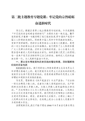 第二批主题教育专题党课:牢记党的宗旨砥砺奋进新时代同志们,根据区委第二批主题教育计划安排,今天我围绕牢记党的宗旨砥砺奋进新时代为题给大家一起交流。翻开党的章程,开篇第一句就表明了我们党的性质,即中国共产党是中国工人阶级的先锋队,同时是中国人民和中华民族的先锋队。党章中同样载明,党的宗旨是坚持全心全意为人民服务,是党的一切工作的根本出发点和落脚点。我们党除了工人阶级和最广大人民群众的利益,没有自己特殊的利益。全心全意为人民服务意味着把人民的利益放在首位,始终坚持人民至上的原则。每一名共产党员应该时刻牢记自己的使命,始终把人民的利益放在第一位。为人民的利益奋斗终身。一、要从党长期发展和历史实践的理论维度,深刻理解我们党的宗旨性质XXXXXX指出,我们党的初心和使命是建立在马克思主义科学理论基础之上的。我们党是用马克思主义武装起来的政党,党的宗旨性质不是凭空而来的,而是有着深厚的马克思主义科学理论和党的历史实践的基础。马克思、恩格斯在《共产党宣言》中庄严宣告:过去的一切运动都是少数人的,或者为少数人谋利益的运动。无产阶级的运动是绝大多数人的,为绝大多数人谋利益的独立的运动。历史唯物主义认为人民群众是历史的创造者,人民群众在社会历史发展中起主体作用。我们党把历史唯物主义的群众史观运用到革命、建设、改革的伟大实践中,在理论上确认了人民群众的历史主体地位,在实践上把全心全意为人民服务作为党的根本宗旨。回顾党的历史,我们不能不想起1944年9月8日毛泽东同志在延安各界为中央警卫团战士张思德举行的追悼会上的重要讲演,也是我们党史上的名作《为人民服务》。张思德生前是中央警备团战士,也是我们党历史上为人民服务的典范,1944年9月其因在陕北山中烧炭,炭窑崩塌,奋力将队友推出窑外,自己被埋而牺牲,年仅29岁。毛主席在演讲中深刻指出我们的共产党和共产党所领导的八路军、新四军,是革命的队伍。我们这个队伍完全是为着解放人民的,是彻底地为人民的利益工作的。这句话在当时而言,是对党和党领导下的人民军队提出的一个高标准的要求,是社会主义道路的根本追求,后来凝练成对我们党宗旨的高度概括为全心全意为人民服务"。XXXXXX曾经说:我们党来自人民、植根人民、服务人民,党的根基在人民、血脉在人民、力量在人民。失去了人民拥护和支持,党的事业和工作就无从谈起。党的宗旨性质实际上回答的是我们党为了什么而执政这一问题。革命战争年代,我们党坚持了这一根本宗旨,取得了革命的胜利。成为执政党后,我们党面临新的历史性考验--就是能否在执政中保持自己的根本性质和政治本色,能否避免其兴也勃,其亡也忽的历史周期律的考验。而经受住这一历史考验的法宝,就是为人民服务的执政理念。在这里我想举一个苏联解体前的民意调查作为例子。1990年6月,即苏联解体前一年多,《西伯利亚报》曾进行过一次民意调查。当人们被问及苏共代表谁的利益时,回答代表苏共党员的占被调查人数的11%,回答代表全体人民的只占7%,回答代表工人的只占4%,而回答代表党的机关工作人员的竟占到了85%。此时此刻的苏联政府的支持率仅有13%,不支持率高达73%,苏共的支持率仅有14%,苏共在事实上已经丧失了人民的支持,最后造成国家的解体。这个民意调查给我们的启示是,任何一个政党,如果密切联系群众,始终保持同人民群众的血肉联系,就会拥有源源不断的力量源泉,反之其执政基础就会动摇,经不起任何风吹雨打。因此,我们党之所以成为中国工人阶级的先锋队,成为中国人民和中华民族的先锋队,成为各项事业的领导核心,就是因为我们党是全心全意为人民服务的政党,是反映人民群众的利益和意志的政党,是努力帮助人民群众组织起来为自己的利益和意志而斗争的政党。我们要深刻理解党的宗旨性质,就要从马克思主义科学理论、从党的历史实践经验出发,在学深悟透的基础上,才能将全心全意为人民服务的意识深入到思想中,落实到行动中。二、要从坚持以人民为中心的思想深度,始终牢记我们党的宗旨性质党的XX大报告确定了坚持以人民为中心的发展思想的重大原则,这是由我们党的根本宗旨、我国经济社会发展的根本目的决定的。新征程上,我们必须坚持尊重社会发展规律和尊重人民历史主体地位的一致性、为崇高理想奋斗和为最广大人民谋利益的一致性、完成党的各项工作和实现人民利益的一致性,努力为人民创造更美好、更幸福的生活。XXXXXX强调,我们党的最大政治优势是密切联系群众,党执政后的最大危险是脱离群众,群众路线是我们党的生命线和根本工作路线。一是要牢固树立群众观点。党员是我们党的肌体细胞,细胞健康,党的肌体才健康:党员合格,党的组织才坚强有力。只有每一位党员牢固树立群众观点,才能把我们党全心全意为人民服务的宗旨落到实处,才能把以人民为中心的发展思想转化为具体行动。中国革命胜利时,为了解决不