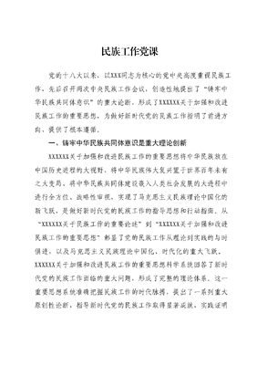 民族工作党课党的十八大以来,以XXX同志为核心的党中央高度重视民族工作,先后召开两次中央民族工作会议,创造性地提出了铸牢中华民族共同体意识的重大论断,形成了XXXXXX关于加强和改进民族工作的重要思想,为做好新时代党的民族工作指明了前进方向、提供了根本遵循。一、铸牢中华民族共同体意识是重大理论创新XXXXXX关于加强和改进民族工作的重要思想将中华民族放在中国历史进程的大视野、将中华民族伟大复兴置于世界百年未有之大变局、将中华民族共同体建设嵌入人类社会发展的大进程中进行全方位、战略性审视,实现了马克思主义民族理论中国化的新飞跃,是做好新时代党的民族工作的指导思想和行动指南。从XXXXXX关于民族工作的重要论述到XXXXXX关于加强和改进民族工作的重要思想彰显了党的民族工作从理论到实践的与时俱进,以及马克思主义民族理论中国化、时代化的重大飞跃。XXXXXX关于加强和改进民族工作的重要思想科学系统回答了新时代党的民族工作面临的重大问题,形成了完整的理论体系。这一重要思想系统准确把握民族工作的时代脉搏,提出了一系列重大原创性论断,指导新时代党的民族工作取得显著成就,实践证明其具有强大的真理力量。我们应深刻认识到这一思想的重大意义即其具有理论引领力,是马克思主义民族理论中国化的历史性飞跃;具有现实指导力,是中国特色解决民族问题正确道路的不断拓展;具有国际影响力,是我们党为世界各国解决民族问题贡献的中国智慧。二、铸牢中华民族共同体意识的丰富内涵中华民族共同体意识是一种群体性社会意识,由社会存在所决定。它的形成经历了由个体意识的特殊性到群体意识的普遍性的整合过程,是经过抽象反映、综合筛选、扬弃提炼而形成的更高层次的共同体意识。要把握新时代党的民族工作的主线,就要明了铸牢中华民族共同体意识是什么、为什么、怎么办。是什么主要包含四个与共,即铸牢中华民族共同体意识就是要引导各族人民牢固树立休戚与共、荣辱与共、生死与共、命运与共的共同体理念,它诠释了中华民族共同体的深刻内涵。正如XXXXXX在2019年全国民族团结进步表彰大会上指出的那样,一部中国史,就是一部各民族交融汇聚成多元一体中华民族的历史,就是各民族共同缔造、发展、巩固统一的伟大祖国的历史。关于为什么要铸牢中华民族共同体意识,四个必然要求做出了精简回答,即是维护各民族根本利益的必然要求,只有铸牢中华民族共同体意识,构建起维护祖国统一和民族团结的坚固长城,各民族共同维护好国家安全和社会稳定,才能有效抵御各种极端、分裂思想的渗透颠覆,才能实现各族人民对美好生活的向往,才能实现好、维护好、发展好各民族根本利益;是实现中华民族伟大复兴的必然要求,只有铸牢中华民族共同体意识才能有效应对实现中华民族伟大复兴过程中民族领域可能发生的风险挑战,才能为党和国家兴旺发达、长治久安提供重要思想保证;是巩固和发展平等团结互助和谐社会主义民族关系的必然要求,只有铸牢中华民族共同体意识,才能增进各民族对中华民族的自觉认同,夯实我国民族关系发展的思想基础,推动中华民族成为认同度更高、凝聚力更强的命运共同体;是党的民族工作开创新局面的必然要求,只有顺应时代变化,按照增进共同性的方向改进民族工作,做到共同性和差异性的辩证统一、民族因素和区域因素的有机结合,才能把新时代党的民族工作做好做细做扎实。四对重大关系则对如何铸牢中华民族共同体意识进行了统筹概括,是铸牢中华民族共同体意识的重大原则,回答了怎么办的问题。一是铸牢中华民族共同体意识要正确把握共同性和差异性的关系,增进共同性、尊重和包容差异性是民族工作的重要原则。共同性是主导,是方向、前提和根本,要以增进共同性为方向推进中华民族共同体建设;差异性将长期存在,要在增进共同性的过程中尊重和包容差异性,同时要坚决防范差异性削弱和危害共同性。二是要正确把握中华民族共同体意识和各民族意识的关系,厘清二者的层次关系,二者可以并存不悖,但不是平行并列的。这种层次关系决定了各民族意识必须服从和服务于中华民族共同体意识,任何民族的本民族意识不能等同或凌驾于中华民族共同体意识之上。大汉族主义要不得,狭隘民族主义也要不得,它们都是民族团结的大敌,都不利于中华民族共同体建设,必须坚决防范。三是要正确把握中华文化和各民族文化的关系,XXXXXX强调各民族优秀传统文化都是中华文化的组成部分,中华文化是主干,各民族文化是枝叶,根深干壮才能枝繁叶茂。这一形象的比喻生动阐释了中华文化和各民族文化的深层次逻辑关系。四是要正确把握物质和精神的关系,物质文明和精神文明两手抓、两手都要硬,是我们党推进中国特色社会主义事业的重要历史经验。在新时代党的民族工作实践中,要重视物质的作用,将发展作为解决民族地区各种问题的总钥匙,把各族人民对美好生活的向往作为奋斗目标,推动民族