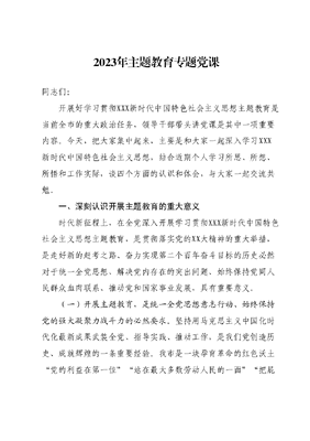 2023年主题教育专题党课同志们:开展好学习贯彻XXX新时代中国特色社会主义思想主题教育是当前全市的重大政治任务,领导干部带头讲党课是其中一项重要内容。今天,把大家集中起来,主要是和大家一起深入学习XXX新时代中国特色社会主义思想,结合近期个人学习所思、所想、所悟和工作实际,谈四个方面的认识和体会,与大家一起交流共勉。一、深刻认识开展主题教育的重大意义时代新征程上,在全党深入开展学习贯彻XXX新时代中国特色社会主义思想主题教育,是贯彻落实党的XX大精神的重大举措,是走好新的赶考之路、奋力实现第二个百年奋斗目标的历史必然对于统一全党思想、解决党内存在的突出问题、始终保持党同人民群众血肉联系、推动党和国家事业发展,具有重要意义。(一)开展主题教育,是统一全党思想意志行动、始终保持党的强大凝聚力战斗力的必然要求。坚持用马克思主义中国化时代化最新成果武装全党、指导实践、推动工作,是我们党创造历史、成就辉煌的一条重要经验。我市是一块孕育革命的红色沃土党的利益在第一位站在最大多数劳动人民的一面把屁股端端地坐在老百姓的这一面等,都是老一辈革命家初心使命的生动写照。我们必须深刻认识到,开展这次主题教育,就是要教育引导党员干部从思想上正本清源、固本培元,不断提高政治判断力、政治领悟力、政治执行力,增强四个意识、坚定四个自信、拥护两个确立、做到两个维护,始终在思想上政治上行动上同党中央保持高度一致,做到心往一处想、劲往一处使,共同把党锻造成一块攻无不克、战无不胜的坚硬钢铁。(二)开展主题教育,是推动全党积极担当作为、不断开创事业发展新局面的必然要求。中国共产党为什么能,中国特色社会主义为什么好,归根到底是马克思主义行,是中国化时代化的马克思主义行。实践充分证明,新时代十年的伟大变革,最根本的原因在于有XXXXXX作为党中央的核心、全党的核心掌舵领航,在于有XXX新时代中国特色社会主义思想科学指引。我们要通过开展主题教育,教育引导全市广大党员干部学思想、强党性、重实践、建新功,不断提高推动高质量发展本领、服务群众本领、防范化解风险本领,加强斗争精神和斗争本领养成,提振锐意进取担当有为的精气神,以统一的思想、坚定的意志、协调的行动、强大的战斗力踏上新征程、创造新伟业,以推动高质量发展成效检验主题教育成果。(三)开展主题教育,是深入推进全面从严治党、以党的自我革命引领社会革命的必然要求。党的十八大以来,我们党采取一系列重大战略举措,坚定不移推进全面从严治党,党在革命性锻造中更加坚强有力。认真贯彻落实党中央决策部署,持续深入纠治四风,一体推进不敢腐、不能腐、不想腐,政治生态在净化修复中持续好转,呈现良好态势。开展主题教育,就是要用XXX新时代中国特色社会主义思想凝心铸魂,引导全市广大党员干部弘扬伟大建党精神,牢记三个务必,自觉对照党章找差距对照群众期盼找差距,刀刃向内革除自身在政治、思想、能力、作风、纪律等方面的病症,增强自我净化、自我完善、自我革新自我提高的能力,为奋进新征程、建功新时代提供坚强有力的政治引领和政治保障。二、深刻领悟党的独特优势面对世界百年未有之大变局,在全球经济降至冰点、社会动荡风起云涌、局部战争愈演愈烈的全球乱局下,中国共产党带领全党全国人民披荆斩棘、乘风破浪,取得了一系列斗争胜利,创造了一连串伟大奇迹,这从党的百年历史循来,也有其规律性和必然性。一是从抗击疫情看制度优势。三年前,突如其来的新冠疫情在全世界爆发并迅速蔓延,中国仅用一个多月的时间就初步遏制了疫情蔓延势头,用三个月左右的时间取得了武汉保卫战、湖北保卫战的决定性胜利。而在相同考题下,美国的新冠病毒确诊人数和死亡人数始终位居世界第一。回顾三年抗疫,我国强大的制度优势和组织优势是取得战疫主动的关键,中央对于疫情防控的举措部署,很短时间就可以下沉到基层、落实到个人,正是这种社会主义制度集中力量办大事的优势,让我国疫情防控始终走在全球前列,全国人民一起给世界上了一堂制度自信公开课。二是从大国博弈看道路优势。当今世界格局加速演变,美国为实现对我国的全面遏制,通过经贸、科技、外交、军事等手段对我国实施全方位极限打压。面对风险挑战,以XXXXXX为核心的党中央领导指挥全国人民沉着应对、密切配合,采取对等反制措施坚决回击,打出了一系列组合拳,把握了战略主动,保持了大局稳定。就拿中美贸易战来说,面对美方的无理要求、极限施压全党全国人民没有屈服,而是全党团结一心,全国上下步调一致社会各界力同心,成功抵御了美方贸易霸凌行径的负面冲击,勠让世界人民看到风景这边独好。三是从抗洪救灾看发展优势。今年入汛以来,全国多条河流发生超警戒水位以上洪水,面对防汛形势,习XXX多次作出重要批示指示,坚持人民至上、生命至上,全力以赴做好防汛抗洪各项工作。