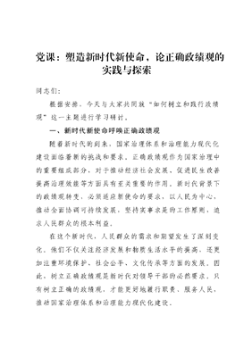 党课:塑造新时代新使命,论正确政绩观的实践与探索同志们:根据安排,今天与大家共同就如何树立和践行政绩观这一主题进行学习研讨。一、新时代新使命呼唤正确政绩观随着新时代的到来,国家治理体系和治理能力现代化建设面临着新的挑战和要求。正确政绩观作为国家治理中的重要组成部分,对于推动经济社会发展、促进民生改善提高治理效能等方面具有至关重要的作用。新时代背景下的政绩观转变,必须适应新使命的要求,以人民为中心,推动全面协调可持续发展,坚持实事求是的工作原则,追求人民群众的根本利益。在这个新时代,人民群众的需求和期望发生了深刻变化。他们不仅关注经济发展和物质生活水平的提高,还更加注重环境保护、社会公平、文化传承等方面的发展。因此,树立正确政绩观是新时代对领导干部的必然要求。只有树立正确的政绩观,才能更好地履行职责、服务人民,推动国家治理体系和治理能力现代化建设。二、正确政绩观的内涵与实践以人民为中心的发展思想,是正确政绩观的核心理念在实践中,领导干部要始终把人民的利益放在首位,关注人民群众的需求与期望,切实解决好人民群众最关心、最直接、最现实的问题。同时,要注重保障人民群众的基本权益和生活质量,推动经济发展和民生改善的良性循环。全面协调可持续发展,是正确政绩观的重要目标。在实践中,领导干部要注重经济、政治、文化、社会、生态等方面的全面发展,既要追求经济发展速度和规模,又要注重环境保护、社会公平、文化传承等方面的发展。同时要注重短期利益与长期利益的平衡,推动可持续发展和长远规划的实施。实事求是的工作原则,是正确政绩观的基本要求。在实践中,领导干部要尊重客观规律,不搞盲目攀比、虚报浮夸,脚踏实地地推进工作。同时,要注重求真务实,杜绝形式主义和浮夸作风,推动工作的实际效果和人民群众的满意度提高。追求人民群众的根本利益,是正确政绩观的最终目的在实践中,领导干部要把人民群众的利益放在首位,追求人民群众的根本利益。同时,要把人民幸福放在首位,以人民满意度衡量工作成效,推动民生改善和社会和谐稳定发展。三、政绩观错位的危害与防范政绩观错位是领导干部中存在的一种不良现象。常见的表现包括盲目追求短期效益、忽视人民群众的利益、片面追求个人成绩等。这些行为不仅损害了人民群众的利益也影响了党和政府的形象和声誉。因此,必须采取有效措施防范政绩观错位。一方面,要加强教育培训,提高领导干部的政绩观意识;另一方面,要强化考核评价机制,引导领导干部树立正确政绩观;同时,要鼓励社会监督,发挥媒体与公众在评价政绩中的作用;最后,要加强自我修养,提升领导干部的道德与职业素养。具体来说,防范政绩观错位需要采取以下措施:一是加强教育培训:通过专题培训、经验交流等方式提高领导干部对政绩观的认识和理解。强调以人民为中心的发展思想、全面协调可持续发展、实事求是的工作原则以及追求人民群众的根本利益等方面的重要性。二是强化考核评价机制:将政绩观纳入考核评价体系中,制定明确的评价标准和指标体系。通过定期考核和评价领导干部的工作绩效,引导他们树立正确政绩观。同时对于存在政绩观错位的领导干部要及时纠正和惩戒。三是鼓励社会监督:通过媒体宣传和社会监督等方式加强对领导干部工作的监督和制约。鼓励公众积极参与评价政府工作和领导干部的工作绩效。同时建立举报制度,让公众可以通过合法途径举报领导干部的违法违规行为,维护党和政府的形象和声誉。