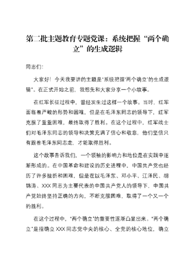 第二批主题教育专题党课:系统把握两个确立的生成逻辑同志们:大家好!今天我要讲的主题是系统把握两个确立的生成逻辑。在正式开始之前,我想先和大家分享一个小故事。在红军长征过程中,曾经发生过这样一个故事。当时,红军面临着严峻的形势和困难,但是在毛泽东同志的领导下,红军克服了重重困难,最终取得了胜利。在这个过程中,红军战士们对毛泽东同志的领导和决策充满了信心和敬意,他们坚信只有跟着毛泽东同志走,才能取得胜利。这个故事告诉我们,一个领袖的影响力和地位是在实践中逐渐形成的。在中国革命和建设的历史进程中,中国共产党也经历了许多挫折和困难,但是在以毛泽东、邓小平、江泽民、胡锦涛、XXX同志为主要代表的中国共产党人的领导下,中国共产党始终坚持正确的方向,不断克服困难,取得了一个又一个的胜利。在这个过程中,两个确立的重要性逐渐凸显出来。两个确立是指确立XXX同志党中央的核心、全党的核心地位,确立XXX新时代中国特色社会主义思想的指导地位。这两个确立是在中国特色社会主义进入新时代的历史条件下形成的,是中国共产党在新时代的重大政治决策和理论创新。那么,两个确立的生成逻辑是什么呢?我们可以从以下几个方面来理解:一、两个确立的理论逻辑作为马克思主义政党,拥有一个坚强的领导核心和统领全局的领袖,作为带领全党在新的发展道路上奋勇前进的坚强领路人,对政党的发展壮大来说是非常重要的。历史唯物主义在肯定历史是由人民创造的同时,也肯定了领袖人物在人类历史进程中扮演的重要领导角色和一定历史条件下的决定性作用。无产阶级的领袖人物所提出的新思想、新观念既符合历史的发展规律,又适应广大人民群众的意愿,对社会发展进步具有一定的指导作用。同时,领袖人物在历史变革进程中具有高度凝聚力,能够将人民群众的力量整合起来,实现真正的社会历史变革。马克思主义一点也不否认卓越人物的作用,或者说,一点也不否认人们创造历史,充分发挥领袖人物的感召作用,引领全党上下和广大人民群众继续前行。没有权威,就不可能有任何的一致行动。列宁在领导俄国进行革命和建设的过程中强调,党的杰出领袖在党的意志统一中起着决定性作用,造就一批有经验、有极高威望的党的领袖是一件长期的艰难的事情。但是做不到这一点,无产阶级专政、无产阶级的意志统一就只能是一句空话。要使无产阶级统一意志,实现无产阶级的专政,就必须培养有威严、有能力、有经验的党的领袖,这是首要的前提。马克思主义建党学说的基本要求之一,就是要加强理论建设,强化理论武装,树立并维护马克思主义的指导思想,充分发挥思想理论的引领作用。正如马克思所言,思想的闪电一旦彻底击中这块素朴的人民园地,德国人就会解放成为人,无产阶级的革命实践离不开理论指导。列宁也坚信,只有以先进理论为指南的党,才能实现先进战士的作用,要始终坚持用马克思主义这一科学理论来指导全党的具体实践,保持乱云飞渡仍从容的信心、千磨万击还坚劲的恒心、咬定青山不放松的决心。XXXXXX指出:科学理论是我们推动工作、解决问题的金钥匙。一百多年来,中国共产党之所以能够战胜任何困难挑战,完成其他政党不能完成的艰难重任,带领中国不断向前发展,日益走在时代前列,与始终坚持把马克思主义写在自己的旗帜上并作为指导思想是密切相关的。二、两个确立的历史逻辑从国际共产主义运动看,两个确立深刻总结了国际共产主义运动的经验与教训。在国际共产主义运动史上,1871年的巴黎公社革命是无产阶级夺取政权的首次尝试,但由于受到主客观因素的影响,被资产阶级反革命的武装洪流所淹没,最后以失败告终。探究其中的缘由,客观原因在于没有坚实的物质基础和阶级条件确保巴黎公社的成功;主观原因在于新生的人民政权缺乏坚强的领导核心和以科学指导思想为依据制定的正确的政策与战略。事实上,巴黎公社遭到灭亡,就是由于缺乏集中和权威。苏联解体是20世纪重大的历史事件。由于组织路线出现错误,苏共后期开始蜕化变质,导致了苏联解体。用辩证唯物主义和历史唯物主义的立场、观点和方法分析巴黎公社失败和苏联解体的教训,可以得出,无论是在领导革命、夺取政权的武装斗争中,还是在建设无产阶级政权的过程中,党的领导核心地位和科学理论指导作用的巩固,对革命建设事业的兴衰有直接的影响。从历史逻辑看,两个确立是中国共产党带领人民经过百年奋斗历程得出的必然结论。在重大历史阶段和关键时期,树立和突出领导核心,是中国共产党具备的优良传统和独特的政治优势,也是我们党不断走向成熟的一个重要标志。中国共产党成立之初,由于理论准备不足,缺乏实践经验,革命初期我们党出现了教条主义、经验主义的错误,给中国革命带来了深重的灾难和巨大的损失。中国迫切需要新的思想引领救亡运动,迫切需要新的组织凝聚革命力量。遵义会议后,党确立毛泽东同志的核心地位,