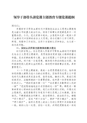 领导干部带头讲党课主题教育专题党课提纲同志们:开展好学习贯彻A新时代中国特色社会主义思想主题教育是当前全市的重大政治任务,领导干部带头讲党课是其中一项重要内容。今天,把大家集中起来,主要是和大家一起深入学习A新时代中国特色社会主义思想,结合近期个人学习所思、所想、所悟和工作实际,谈四个方面的认识和体会,与大家一起交流共勉。一、深刻认识开展主题教育的重大意义时代新征程上,在全党深入开展学习贯彻A新时代中国特色社会主义思想主题教育,是贯彻落实党的XX大精神的重大举措,是走好新的赶考之路、奋力实现第二个百年奋斗目标的历史必然,对于统一全党思想、解决党内存在的突出问题、始终保持党同人民群众血肉联系、推动党和国家事业发展,具有重要意义。(一)开展主题教育,是统一全党思想意志行动、始终保持党的强大凝聚力战斗力的必然要求。坚持用马克思主义中国化时代化最新成果武装全党、指导实践、推动工作,是我们党创造历史、成就辉煌的一条重要经验。我市是一块孕育革命的红色沃土,党的利益在第一位站在最大多数劳动人民的一面把屁股端端地坐在老百姓的这一面等,都是老一辈革命家初心使命的生动写照。我们必须深刻认识到,开展这次主题教育,就是要教育引导党员干部从思想上正本清源、固本培元,不断提高政治判断力、政治领悟力、政治执行力,增强四个意识、坚定四个自信、拥护两个确立、做到两个维护,始终在思想上政治上行动上同党中央保持高度一致,做到心往一处想、劲往一处使,共同把党锻造成一块攻无不克、战无不胜的坚硬钢铁。(二)开展主题教育,是推动全党积极担当作为、不断开创事业发展新局面的必然要求。中国共产党为什么能,中国特色社会主义为什么好,归根到底是马克思主义行,是中国化时代化的马克思主义行。实践充分证明,新时代十年的伟大变革,最根本的原因在于有AXXX作为党中央的核心、全党的核心掌舵领航,在于有A新时代中国特色社会主义思想科学指引。我们要通过开展主题教育,教育引导全市广大党员干部学思想、强党性、重实践、建新功,不断提高推动高质量发展本领、服务群众本领、防范化解风险本领,加强斗争精神和斗争本领养成,提振锐意进取、担当有为的精气神,以统一的思想、坚定的意志、协调的行动、强大的战斗力踏上新征程、创造新伟业,以推动高质量发展成效检验主题教育成果。(三)开展主题教育,是深入推进全面从严治党、以党的自我革命引领社会革命的必然要求。党的十八大以来,我们党采取一系列重大战略举措,坚定不移推进全面从严治党,党在革命性锻造中更加坚强有力。认真贯彻落实党中央决策部署,持续深入纠治四风,一体推进不敢腐、不能腐、不想腐,政治生态在净化修复中持续好转,呈现良好态势。开展主题教育,就是要用A新时代中国特色社会主义思想凝心铸魂,引导全市广大党员干部弘扬伟大建党精神,牢记三个务必,自觉对照党章找差距,对照群众期盼找差距,刀刃向内革除自身在政治、思想、能力、作风、纪律等方面的病症,增强自我净化、自我完善、自我革新、自我提高的能力,为奋进新征程、建功新时代提供坚强有力的政治引领和政治保障。二、深刻领悟党的独特优势面对世界百年未有之大变局,在全球经济降至冰点、社会动荡风起云涌、局部战争愈演愈烈的全球乱局下,中国共产党带领全党全国人民披荆斩棘、乘风破浪,取得了一系列斗争胜利,创造了一连串伟大奇迹,这从党的百年历史循来,也有其规律性和必然性。一是从抗击疫情看制度优势。三年前,突如其来的新冠疫情在全世界爆发并迅速蔓延,中国仅用一个多月的时间就初步遏制了疫情蔓延势头,用三个月左右的时间取得了武汉保卫战、湖北保卫战的决定性胜利。而在相同考题下,美国的新冠病毒确诊人数和死亡人数始终位居世界第一。回顾三年抗疫,我国强大的制度优势和组织优势是取得战疫主动的关键,中央对于疫情防控的举措部署,很短时间就可以下沉到基层、落实到个人,正是这种社会主义制度集中力量办大事的优势,让我国疫情防控始终走在全球前列,全国人民一起给世界上了一堂制度自信公开课。二是从大国博弈看道路优势。当今世界格局加速演变,美国为实现对我国的全面遏制,通过经贸、科技、外交、军事等手段对我国实施全方位极限打压。面对风险挑战,以A同志为核心的党中央领导指挥全国人民沉着应对、密切配合,采取对等反制措施坚决回击,打出了一系列组合拳,把握了战略主动,保持了大局稳定。就拿中美贸易战来说,面对美方的无理要求、极限施压,全党全国人民没有屈服,而是全党团结一心,全国上下步调一致,社会各界勠力同心,成功抵御了美方贸易霸凌行径的负面冲击,让世界人民看到风景这边独好。三是从抗洪救灾看发展优势。今年入汛以来,全国多条河流发生超警戒水位以上洪水,面对防汛形势,AXXX多次作出重要批示指示,坚持人民至上、生命至上,全力以赴做好防汛抗洪各项工作。在党