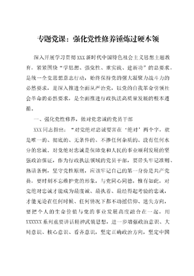 专题党课:强化党性修养锤炼过硬本领深入开展学习贯彻XXX新时代中国特色社会主义思想主题教育,紧紧围绕学思想、强党性、重实践、建新功的总要求,是统一全党思想意志行动,始终保持党的强大凝聚力战斗力的必然要求,是深入推进全面从严治党,以党的自我革命引领社会革命的必然要求,是全面推进行政执法高质量发展的根本遵循。一、强化党性修养,做对党忠诚的党员干部XXX同志指出:对党绝对忠诚要害在绝对两个字,就是唯一的、彻底的、无条件的、不掺任何杂质的、没有任何水分的忠诚。对党绝对忠诚是保障党和人民的事业顺利发展的坚强政治保证,作为行政执法领域的党员干部,要带头牢记准则、熟谙条例,坚守党性原则,应该牢记自己的第一身份是共产党员,要时刻不忘维护党的形象,与党同心同德,惟有如此,对党绝对忠诚才能成为最虔诚、最执着、最经得起考验的忠诚,才能无论在任何时候、任何情况下都不动摇信仰、迷失方向,要把个人的生命价值与党的事业发展高度融合在一起,用XXXXXX系列重要讲话精神武装思想,进一步增强政治意识、大局意识、核心意识、看齐意识,坚定正确政治方向,坚定中国特色社会主义道路自信、理论自信、制度自信、文化自信,在工作、学习和生活中勇于担当作为,发挥党员先锋模范作用。在实践中,做到对党绝对忠诚,必须做到在党爱党、在党言党、在党忧党、在党为党,不断强化对党的认同感、归属感,胸怀高度的责任感、使命感和担当精神,努力为党的事业多作贡献,像珍惜自己的生命一样珍惜党的威望,坚守精神高地,明大德、守公德、严私德。二、坚持执法为民,做公平公正的党员干部在维护公平正义的路上,做正直正派、诚实守信、忠诚担当的党员干部。正直正派,就是要坐得直、行得端、挺得住,想问题、办事情敢于坚持原则,公道正派,秉公用权,阳光用权,解决问题不带私心,协调矛盾不偏不倚,凡事能从人民利益出发,从党和国家利益出发,做到于公对得起党和人民、于人对得起自己良心。诚实守信,就是要敢于承诺践诺,言必行,行必果,说到做到,要求别人做到的,自己首先做到,要求别人的不做的,自己首先不做,不失信于人,不出尔反尔,不阳奉阴违。忠诚担当,就是要增强事业心和责任感,把工作当作事业来追求,兢兢业业,一丝不苟,工作无论多么困难,多么险重,都敢于迎难而上,不讲价钱,不打折扣,用实际行动体现对党的忠诚,对祖国的忠诚,对人民的忠诚。要坚持原则、敢抓敢管,把纪律和规矩挺在前面,自觉接受党和人民的监督,接受党章党规党纪的约束,面对大是大非敢于亮剑,面对歪风邪气敢于斗争,面对矛盾问题敢于挺身而出,自觉维护公平正义。三、坚持实事求是,做求真务实的党员干部XXX同志指出:坚持实事求是,就是坚持一切从实际出发来研究和解决问题,坚持理论联系实际来制定和形成指导实践发展的正确路线方针政策,坚持在实践中检验真理和发展真理。要积极参加集体学习、培训学习,主动抓好自学,认真学习马克思主义理论这一看家本领,学习党的路线方针政策和国家法律法规,学习工作需要的各方面知识,依靠学习提高知识化、专业化水平,依靠学习克服本领恐慌,确保政令畅通、决策落地。我们谋划工作、认识事物的本质,光有理论还不行,还必须有实践,纸上得来终觉浅,绝知此事要躬行,作为党员干部,要做到务实,就要特别注重深入基层、深入群众、深入实际进行调查研究,尤其是要多到困难大、问题多、矛盾突出的地方去,把事实的来龙去脉搞清楚,把事物的内部和外部联系弄明白,把人民群众的意见和建议听清楚,从中找出能够解决问题、符合群众要求的办法来。新形势、新任务、新要求,对执法人员的理论素养、知识储备和综合能力提出了更高的要求。作为党员干部必须要自觉从全局高度谋划推进工作,做到实事求是、求真务实,把准方向、敢于担当,善作善成、推进工作。四、立足本职岗位,做为民服务的党员干部面对千头万绪的综合执法工作,XXX新时代中国特色社会主义思想就是做好工作的根本遵循。必须坚持不懈地用XXXXXX的重要讲话精神武装头脑,切实扛牢行政执法之责,把XXXXXX的指示转化为践行使命的实干担当、为民情怀的生动实践、干事创业的不竭动力,把学习成效转化为做好新时代执法工作的实干成效。坚持把推动执法工作高质量发展作为主题教育的着力点,切实抓好维护文旅市场安全稳定各项措施落实,坚持以人民为中心的发展思想,顺应群众所思所想所忧所盼,把下基层、察民情,解民忧、暖民心的工作做到群众心坎上,不断增强人民群众的获得感、幸福感、安全感。要牢固树立执纪者必先守纪,监督者必先接受监督理念,始终坚持用权为民,按规则、按制度行使权力,以典型案例为鉴戒,坚持以案促改、以案促治,强化警示教育,严明党纪法规,任何时候都不搞特权、不以权谋私,聚焦人民群众急难愁盼问题,以实际行动践行初心使命,坚决履行好党和人民赋予的新时代职责使命,紧紧围绕文旅市场维稳
