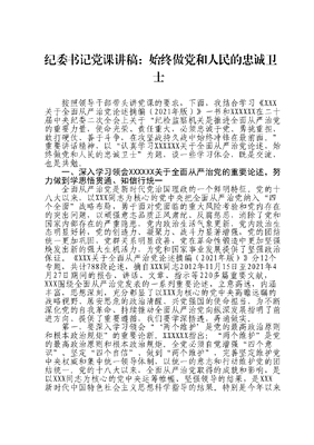 纪委书记党课讲稿:始终做党和人民的忠诚卫士按照领导干部带头讲党课的要求,下面,我结合学习《XXX关于全面从严治党论述摘编(2021年版)》一书和XXXXXX在二十届中央纪委二次全会上关于纪检监察机关是推进全面从严治党的重要力量,使命光荣、责任重大,必须忠诚于党、勇挑重担,敢打硬仗、善于斗争,在攻坚战持久战中始终冲锋在最前面。重要讲话精神,以认真学习XXXXXX关于全面从严治党论述,始终做党和人民的忠诚卫士为题,谈一些学习体会,既是交流,也是共勉。一、深入学习领会XXXXXX关于全面从严治党的重要论述,努力做到学思悟贯通、知信行统一全面从严治党是新时代党治国理政的一个鲜明特征。党的十八大以来,以XXX同志为核心的党中央把全面从严治党纳入四个全面战略布局,勇于面对党面临的重大风险考验和党内存在的突出问题,以顽强意志品质正风肃纪、反腐惩恶,消除了党和国家内部存在的严重隐患,党内政治生活气象更新,党内政治生态明显好转,党的创造力、凝聚力、战斗力显著增强,党的团结统一更加巩固,党群关系明显改善,党在革命性锻造中更加坚强焕发出新的强大生机活力,为党和国家事业发展提供了坚强政治保证。《XXX关于全面从严治党论述摘编(2021年版)》分12个专题,共计788段论述,摘自XXX同志2012年11月15日至2021年4月27日期间的报告、讲话、文章、指示等220多篇重要文献,XXX围绕全面从严治党发表的一系列重要论述,立意高远,内涵丰富,思想深刻,充分彰显了以XXX为核心的党中央高瞻远瞩的战略视野、居安思危的政治清醒、兴党强国的使命担当,为不断深化党的自我革命、持续推动全面从严治党向纵深发展指明了前进方向、提供了重要遵循,我们要学深悟透,弄通做实。第一,要深入学习领会两个维护是党的最高政治原则和根本政治规矩的重要论断。XXXXXX指出:两个维护是党的最高政治原则和根本政治规矩。全党必须自觉增强四个意识、坚定四个自信、做到两个维护,完善坚定维护党中央权威和集中统一领导体制,以统一的意志和行动维护党的团结统一。党的十八大以来,全面从严治党取得的成就和影响,是以XXX同志为核心的党中央运筹帷幄、坚强领导的结果,是XXX新时代中国特色社会主义思想科学指导的结果。特别是今年以来我国抗击疫情取得重大成效,最根本来源于XXXXXX领航掌舵、党中央集中统一领导下的中国特色社会主义制度优势,再次诠释了XXX新时代中国特色社会主义思想的强大真理力量、实践力量。作为纪检监察干部,必须带头践行两个维护,真学真懂真信真用XXX新时代中国特色社会主义思想。第二,深入学习领会全面从严治党是新时代党治国理政的一个鲜明特征的重要论断。XXXXXX强调:回望这些年的奋斗历程,我们清醒的看到,全面从严治党是新时代党治国理政的一个鲜明特征。党的十八大以来,以XXX同志为核心的党中央以前所未有的勇气和定力,推动新时代全面从严治党取得了历史性、开创性成就,产生了全方位深层次影响。经过持续努力,全党在思想上正本清源、精神上团结统一、行动上坚决有力,党的领导弱化、党的建设缺失、管党治党不力状况得到坚决彻底扭转,党的领导真正落实到治国理政全过程各方面,党团结带领中国人民创造了世所罕见的经济快速发展奇迹和社会长期稳定奇迹,实现了风景这边独好的中国之治。以上这些都是全面从严治党这一鲜明特征的生动写照和具体注脚。作为纪检监察干部,必须深刻领会这一重要论断精神,在管全党、治全党中认真履行好自己的职责,为全面从严治党这一鲜明特征擦亮底色、增加成色。第三,要深入学习领会全面从严治党既是政治保障,也是政治引领的重要论断。XXXXXX强调:实践证明,全面从严治党既是政治保障,也是政治引领。这一重要论断,深刻揭示了全面从严治党的使命所在和价值取向。从政治保障而言,全面从严治党扶正祛邪、惩恶扬善,与一切影响党的先进性、弱化党的纯洁性的问题作斗争,进一步严明政治纪律和政治规矩,切实解决思想不纯、政治不纯、组织不纯、作风不纯等突出问题,为党和国家事业顺利发展提供坚强保证和有力支撑。从政治引领而言,我国正处于全面建成小康社会的关键时期,日益接近实现中华民族伟大复兴中国梦,通过全面从严治党,引领全党同志坚定正确政治方向、坚守正确政治立场,引导党员干部在内心深处铸牢初心使命,有助于把我们党建设成为始终走在时代前列、人民衷心拥护、勇于自我革命、经得起各种风浪考验的马克思主义执政党,引领中国特色社会主义这艘巨轮沿着正确的航线乘风破浪,从胜利走向新的胜利。作为纪检监察干部,要深刻学习领会这一论断精神,通过不断强化政治保障和政治引领,在革命性锻造中成长进步。第四,要深刻学习领会把严的主基调长期坚持下去的重要论断。2014年1月20日,XXXXXX在党的群众路线教育实践活