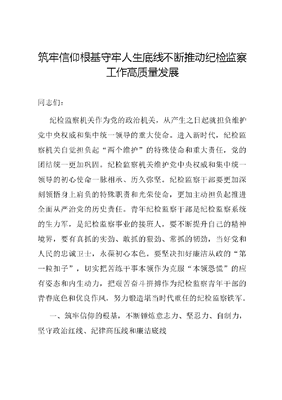 筑牢信仰根基守牢人生底线不断推动纪检监察工作高质量发展同志们:纪检监察机关作为党的政治机关,从产生之日起就担负维护党中央权威和集中统一领导的重大使命。进入新时代,纪检监察机关自觉担负起两个维护的特殊使命和重大责任,党的团结统一更加巩固。纪检监察机关维护党中央权威和集中统一领导的初心使命一脉相承、历久弥坚。纪检监察干部要更加深刻领悟身上肩负的特殊职责和光荣使命,更加主动担负起推进全面从严治党的历史责任。青年纪检监察干部是纪检监察系统的生力军,是纪检监察事业的接班人,要不断提升自己的精神境界,要有真抓的实劲、敢抓的狠劲、常抓的韧劲,当好党和人民的忠诚卫士,永葆初心本色。要坚决扣好廉洁从政的第一粒扣子,切实把苦练干事本领作为克服本领恐慌的应有姿态和内生动力,把艰苦奋斗拼搏作为纪检监察青年干部的青春底色和优良作风,努力锻造堪当时代重任的纪检监察铁军。一、筑牢信仰的根基,不断锤炼意志力、坚忍力、自制力,坚守政治红线、纪律高压线和廉洁底线志气是志向、价值取向,是党员干部干事创业的根和魂。纪检监察干部使命光荣、责任重大,要筑牢信仰之基、补足精神之钙、把稳思想之舵,以坚定的理想信念砥砺对党的赤诚忠心,涵养矢志报国的浩然正气。要筑牢信仰之基、补足精神之钙、把稳思想之舵,在山雨欲来风满楼的形势考验中永葆越是艰险越向前的担当精神,从纪检监察先辈们的手中接过打虎拍蝇接力棒,以坚定的步伐、昂扬的斗志在反腐败斗争中愈战愈勇。第一,坚持以XXX新时代中国特色社会主义思想凝心铸魂,以理论上的清醒保证政治上的坚定。坚持把XXX新时代中国特色社会主义思想作为改造主观世界和客观世界的强大思想武器,坚持读原著、学原文、悟原理,全面把握其科学体系、精髓要义、实践要求,贯通把握其世界观方法论和贯穿其中的立场观点方法,深刻把握道理学理哲理,做到知其言更知其义、知其然更知其所以然。自觉运用两个结合、六个必须坚持观察时代、把握时代、引领时代,不断深化对共产党执政规律、社会主义建设规律、人类社会发展规律的认识,全面深刻理解中国共产党能、中国特色社会主义好、马克思主义行的整体逻辑,把马克思主义的科学真理性、中国特色社会主义的巨大优越性、中华民族伟大复兴的历史必然性紧密结合、贯通掌握,切实筑牢信仰之基、补足精神之钙、把稳思想之舵,不断增强道路自信、理论自信、制度自信、文化自信,为强国建设、民族复兴坚定必胜信心、注入强大动能。第二,把牢政治方向,确保党中央决策部署和XXXXXX重要指示要求不折不扣落到实处。纪检监察干部肩负着维护党中央权威和集中统一领导的重大使命,是两个维护的忠实践行者和坚定捍卫者,必须深刻领悟两个确立的决定性意义,始终胸怀国之大者,突出政治监督首责,善于用政治的眼光看待问题、识别本质、明辨是非,善于从业务看政治、从问题看责任、从成效看作风,及时校正偏差。要把XXX新时代中国特色社会主义思想作为看家本领,深刻领会党中央重大战略决策部署背后的政治考量,更加坚定中国特色监督体系制度自信,更加坚定不移完善党和国家监督体系,更加坚定不移推进全面从严治党,更加坚定不移推进反腐倡廉,确保纪检监察工作始终沿着XXXXXX指引的方向坚定前行。第三,践行初心使命,持续整治群众身边腐败和作风问题,提升人民群众的获得感、幸福感、安全感。纪检监察工作必须坚持人民至上的根本立场和价值取向,牢固树立以人民为中心的发展思想,紧紧抓住人民群众最关心最直接最现实的利益问题,盯住民生领域的热点、难点问题,持续推进民生领域问题专项整治,监督保障党中央惠民政策落地见效,持续整治群众身边腐败和作风问题,提升人民群众的获得感、幸福感、安全感。要在学思践悟中牢牢把握这一思想蕴含的根本政治立场,深刻体悟XXXXXX我将无我、不负人民的崇高精神境界,树牢群众观点、践行群众路线,始终同人民同呼吸、共命运、心连心。牢记让人民生活幸福是国之大者,坚持执纪执法为民、纠风治乱为民,凡是群众反映强烈的问题都要严肃认真对待,凡是损害群众利益的行为都要坚决纠正,深入开展乡村振兴领域不正之风和腐败问题专项整治,严肃惩治就业创业、教育医疗、养老社保、生态环保、食品药品安全等领域的腐败,推动解决群众急难愁盼问题,始终保持党同人民群众的血肉联系,不断厚植党长期执政的政治根基和群众基础。二、守牢人生的底线,不断提高依规依纪依法履职能力,练就敢于斗争、善于斗争的硬脊梁、铁肩膀、真本事纪检监察干部作为监督别人的人、执纪执法的人,必须始终保持自身干净,始终保持赶考的清醒,保持对腐蚀、围猎的警觉,自觉接受最严格的约束和监督,坚决防止家人、亲属利用纪检监察干部影响谋取私利,持续整治灯下黑。要时刻保持政治清醒,把纪律挺在前面,注重自我提升,做守纪律、讲规矩的表率。带头