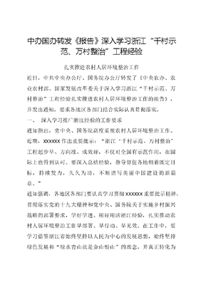 中办国办转发《报告》深入学习浙江千村示范、万村整治工程经验扎实推进农村人居环境整治工作近日,中共中央办公厅、国务院办公厅转发了《中央农办、农业农村部、国家发展改革委关于深入学习浙江千村示范、万村整治工程经验扎实推进农村人居环境整治工作的报告》,并发出通知,要求各地区各部门结合实际认真贯彻落实。一、深入学习推广浙江经验的工作要求通知指出,党中央、国务院高度重视农村人居环境整治工作。近期,XXXXXX作出重要批示:浙江千村示范、万村整治工程起步早、方向准、成效好,不仅对全国有示范作用,在国际上也得到认可。要深入总结经验,指导督促各地朝着既定目标,持续发力,久久为功,不断谱写美丽中国建设的新篇章。通知强调,各地区各部门要认真学习贯彻XXXXXX重要批示精神,贯彻落实党的十九大精神和党中央、国务院关于实施乡村振兴战略的部署要求,学好学透、用好用活浙江经验,扎实推动农村人居环境整治工作早部署、早行动、早见效。在工作中,要学习借鉴浙江省始终坚持以人民为中心的发展思想,始终坚持绿色发展和绿水青山就是金山银山的理念,并真正转化为引领推动农村人居环境综合治理的具体实践;要坚持高位推动,党政一把手亲自抓,五级书记一起抓;坚持因地制宜、分类指导,与当地发展阶段相适应;坚持聚焦民生福祉,由易到难,从村庄清洁行动做起,以重点突破带动面上工作;坚持系统治理、久久为功,建立健全长效治理机制;坚持真金白银投入,强化要素保障,建立多元化投入机制;坚持强化政府主导作用,调动农民主体和市场主体力量,形成全社会共同参与推动的大格局。在地方党政机构改革过程中,要做好农村人居环境整治工作衔接,确保不断档、不耽误。2019年年底国务院开展一次大检查,对措施不力、搞虚假形式主义、劳民伤财无效实施的地方和单位予以批评问责。《中央农办、农业农村部、国家发展改革委关于深入学习浙江千村示范、万村整治工程经验扎实推进农村人居环境整治工作的报告》主要内容如下。改善农村人居环境,是以XXX同志为核心的党中央从战略和全局高度作出的重大决策。早在2003年,时任浙江省委书记的XXX同志亲自调研、亲自部署、亲自推动,启动实施千村示范、万村整治工程(以下简称千万工程)。15年来,浙江省委和省政府始终践行XXXXXX绿水青山就是金山银山的重要理念,一以贯之地推动实施千万工程,村容村貌发生巨大变化。目前,全省农村生活垃圾集中处理建制村全覆盖,卫生厕所覆盖率98.6%,规划保留村生活污水治理覆盖率100%,畜禽粪污综合利用、无害化处理率97%,村庄净化、绿化、亮化、美化,造就了万千生态宜居美丽乡村,为全国农村人居环境整治树立了标杆。千万工程被当地农民群众誉为继实行家庭联产承包责任制后,党和政府为农民办的最受欢迎、最为受益的一件实事。2018年9月,浙江千万工程获联合国地球卫士奖。XXXXXX多次作出重要批示,要求结合农村人居环境整治三年行动计划和乡村振兴战略实施,进一步推广浙江好的经验做法,建设好生态宜居的美丽乡村。为深入贯彻落实XXXXXX重要指示批示精神,中央农办、农业农村部、国家发展改革委在深入调研基础上,会同浙江省有关方面,研究提出了深入学习浙江千万工程经验、扎实推进农村人居环境整治工作的意见建议。二、深入学习推广浙江经验意义重大浙江千万工程起步早、方向准、举措实、成效好,对全国各地实施乡村振兴战略、推进农村人居环境整治具有重要示范带动作用。(一)深入学习浙江经验是贯彻落实XXX生态文明思想的重要举措。浙江经验是XXX生态文明思想的生动实践,充分展示了新时代我国生态文明建设的成就。贯彻落实XXX生态文明思想,深入学习浙江经验,多举措改变农村脏乱差现象,多渠道打通绿水青山向金山银山的转化路径,多形式构建人与自然和谐共生的乡村发展新格局,才能实现农村生态美与百姓富的统一。(二)深入学习浙江经验是践行以人民为中心的发展思想的内在要求。浙江省在推进千万工程中,始终把实现好、维护好、发展好农民群众的福祉作为根本出发点,不断提高农民群众生活质量和健康水平。深入学习浙江经验,始终坚持以人民为中心的发展思想,努力改善农村基础设施条件,才能持续增强农民群众的获得感幸福感。(三)深入学习浙江经验是实施乡村振兴战略的有效抓手。浙江省通过千万工程,创新升级、与时俱进建设美丽乡村,走出了一条改善农村人居环境与城乡融合发展协同推进的新路子。深入学习浙江经验,下大力气改善农村人居环境,补齐农村建设这块突出短板,切实解决农村发展不平衡不充分问题,才能为乡村振兴打下坚实基础。(四)深入学习浙江经验是实现农村人居环境整治三年行动目标任务的重要保障。浙江省坚持循序渐进,有重点有步骤地推进千万工程,治理农村垃圾、污水,实施农村厕所革命,全
