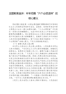 主题教育宣讲:牢牢把握六个必须坚持的核心要义党的XX大报告第一次提出要把握好XXX新时代中国特色社会主义思想的世界观和方法论,坚持好、运用好贯穿其中的立场观点方法这一重大命题和论断。六个必须坚持不仅是这一思想本身的精髓要义,也是开辟马克思主义中国化时代化新境界的精髓要义,是全面建设社会主义现代化国家和全面实现中华民族伟大复兴的精髓要义,是维护人类持久和平和推动人类共同发展的精髓要义,接下来我分别来详细阐述一下六个必须坚持的核心要义,不足之处敬请批评指正。(一)坚持人民至上是立场马克思主义是站在人民立场上的理论,人民性是马克思主义的本质属性。马克思主义之所以具有跨越国度、跨越时代的影响力,就是因为它植根人民之中,指明了依靠人民推动历史前进的人间正道。马克思主义在人类解放和人的解放的视域下探讨无产阶级解放问题,坚持人民群众是历史的创造者,这是它具有跨越时空永恒价值内在依据的根本所在,也是它能够在全球范围内迅速传播并成为各国无产阶级认识世界和改造世界强大武器的根本原因所在。中国共产党是以马克思主义作为指导思想的政党,马克思主义的政治优势和理论优势成为中国共产党和中国特色社会主义的基本依据。我们党的理论创新来源于人民,同时又在转化为改变世界的物质力量过程中服务于人民,这是我们党的理论创新永葆生机与活力的根本所在。正如党的XX大报告强调:一切脱离人民的理论都是苍白无力的,一切不为人民造福的理论都是没有生命力的。人民至上是马克思主义基本立场的中国表达。人民是我们党的力量源泉,我们党根基在人民、血脉在人民。我们党始终坚持为人民服务,把人民放在心中最高位置。作为历史观,人民至上强调江山就是人民、人民就是江山,打江山、守江山,守的是人民的心;作为政治观,人民至上强调民心是最大的政治;作为价值观,人民至上强调我们党是全心全意为人民服务的党,坚持立党为公、执政为民,把人民对美好生活的向往作为始终不渝的奋斗目标;作为群众观,人民至上强调以百姓心为心,与人民同呼吸、共命运、心连心,是党的初心,也是党的恒心。人民至上不是一个抽象的口号,它贯彻于党的十八大以来推进经济高质量发展、发展全过程人民民主、繁荣发展中国特色社会主义先进文化、加强以民生为重点的社会建设、建设美丽中国的各方面和全过程,是我们事业胜利的重要发展理念、实践经验和政治保证。新时代新征程继续推进马克思主义中国化时代化,必须深刻把握人民至上的时代要求。在历史观上,要发挥人民主体地位,依靠人民创造历史伟业;在政治观上,要站稳人民立场,把人民放在心中的最高位置;在价值观上,要把人民对美好生活的向往当作我们的奋斗目标,把实现好维护好发展好最广大人民的根本利益作为一切工作的出发点和落脚点;在群众观上,要坚决贯彻党的群众路线,要向人民学习、拜人民为师,尊重人民创造,集中人民的智慧,及时概括提炼人民群众的新鲜经验,形成为人民所喜爱、所认同、所拥有的理论,确保我们党的创新理论和路线方针政策反映人民日益增长的美好生活需要。只要我们把人民至上贯彻到党和国家事业的全过程和各方面,全面建设社会主义现代化国家和全面实现中华民族伟大复兴的宏伟目标一定能够实现。(二)坚持自信自立是基础中国共产党之所以自信自立是因为有马克思主义理论奠定的理论基础,有中华民族优秀传统文化提供的历史文化基础,有百余年历史铸造的伟大光荣的实践基础。党的XX大报告明确指出:中国人民和中华民族从近代以后的深重苦难走向伟大复兴的光明前景,从来就没有教科书,更没有现成答案。党的百年奋斗成功道路是党领导人民独立自主探索开辟出来的,马克思主义的中国篇章是中国共产党人依靠自身力量实践出来的,贯穿其中的一个基本点就是中国的问题必须从中国基本国情出发,由中国人自己来解答。自信自立无论过去、现在还是将来,都是我们的根本立足点,是党和人民事业不断从胜利走向新的胜利的根本所在。自信自立贯穿于XXX新时代中国特色社会主义思想各方面,体现了新时代我们坚定不移走自己的路的决心和信心。XXXXXX指出:人类历史上,没有一个民族、没有一个国家可以通过依赖外部力量,跟在他人后面亦步亦趋实现强大和振兴。那样做的结果,不是必然遭遇失败,就是必然成为他人的附庸。这里讲的自信就是XXXXXX提出的四个自信,以及基于四个自信提出的历史自信和在历史主动中形成的文明自信,归根到底是中国特色社会主义自信。自立就是走自己的路,同时尊重其他国家对自己发展道路选择的权利。我们从来不干涉其他国家的内政,也反对其它国家干涉我们的内政。党的十八大以来,我们正是靠自信自立实现了第一个百年奋斗目标,夺取了新时代中国特色社会主义新胜利,使我们踏上全面建设社会主义现代化国家的新征程。新时代新征程继续推进马克思主义中国化时代化,必须深刻把握坚持自信自立的时代要求。我们