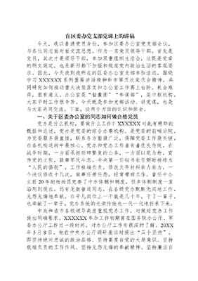 在区委办党支部党课上的讲稿今天,我以普通党员身份,参加区委办公室党支部会议,与各位同志面对面交流思想。作为一名党员领导干部,首先是党员,其次才是领导干部,参加双重组织生活会,这既是党章的明文规定,也是新形势下加强和规范党内政治生活的客观要求。因此,今天我到我所在的区委办公室支部参加活动,围绕学习XXXXXX系列重要讲话精神和市第五次党代会精神,共同研究如何推动重大决策落实和办公室工作再上台阶,机会难得,很有意义。办公室是智囊团参谋部,是中枢机构,大家平时工作很辛苦。今天既是参加支部活动、讲党课,也是与大家共同交流。下面,谈两个方面的认识和体会。一、关于区委办公室的同志如何做合格党员党办是什么机构,要做什么工作?XXXXXX对此有精辟的概括和论述,党办是党委的综合办事机构,是党委的前哨后院,为党委服务最直接,联系各方面最广泛,保障党委工作最关键,在各机构运转中最核心。党办和党办工作者有着优良传统。在战争时期,一方面承担琐碎繁复的公务,一方面以笔为枪,宣传党的主张,鼓舞军民斗志。中央第一任秘书长任弼时被称为人民的骆驼,工作极端负责,修改文件材料亲力亲为,一个决议修改十几次,做事任劳任怨,经常带病工作。曾任中办主任20年的杨尚昆完善了中办体制和制度,很多体制制度一直沿用到现在。还有无数普通同志,在各级党办默默无闻地工作,无怨无悔地奉献,在平凡岗位上一干就是几十年,干了一辈子,也奉献了一辈子。党办系统的光荣传统也一代一代地传承下来。中央和省市各级领导高度重视党办工作,对做好党办工作提出明确要求。XXXXXX参加工作初期曾在国务院办公厅、军委办公厅工作过一段时间,对办公厅工作有很深的了解。20XX年5月8日,他在中央办公厅调研座谈时提出五个坚持,即坚持绝对忠诚的政治品格、坚持高度自觉的大局意识、坚持极端负责的工作作风、坚持无怨无悔的奉献精神、坚持廉洁自律的道德操守。这五个坚持既是XXXXXX对中央办公厅的严格要求,也是对全国党办系统优良传统和当代党办工作者高尚品格的总结概括。省委书记X参加省委办公厅综合室党支部专题组织生活会时对党办工作提出,要坚持注重积累、加强学习,坚持深度思考、主动作为,坚持高位定标、争创一流,坚持成果导向、多出精品,充分发挥好参谋助手作用。刚才X同志传达了X书记在市委办公厅秘书一处党支部党课上的讲话,王书记对年轻党员干部提出明确要求和殷切希望,主要是过三关,即信念关、方法关、作风关。尤其X书记对年轻干部智慧、能力和作风的提高非常关注,语重心长、言传身授,要求年轻干部在工作方法上要既看上又看下、既看总又看细、既看点又看面、既看动又看静、既看表又看里、既看正又看反,在作风方面尤其强调要凭专业说话。提高智慧、能力和作风,最根本的是要加强学习。来X区工作这几年,与办公室的同志接触最多,所以今天与大家坐下来感到特别亲切。区委办公室的特点可以用四多四少来概括。一是忙碌多、闲暇少。办公室工作,大至方针政策、重要决策,细至室内卫生、干部生活;上至接待省市领导,下至联系平民百姓;内至机要机密,外至社俗民情,什么都要参与了解。就内部分工来说,有政研、信息、改革、督察、接待、机要、保密、档案、文印、收发等各项工作。办公室干部每天都要处理许多事情,弦绷得紧紧的。平常上班经常看到办公室的同志拿着文件、材料急匆匆的身影,有时甚至是一路小跑;逢大的会议办会的同志往返于办公室和会场,事无俱细,装订材料大家聚在中厅一起紧张忙碌;早上和中午大家要先收拾完卫生,快过饭点了才匆匆忙忙赶到餐厅,匆匆忙忙吃几口饭,再匆匆忙忙赶回办公室,有时甚至忙得顾不上吃饭。二是加班多、休息少。办公室的同志每天来得最早、走得最晚,五加二、白加黑,加班加点是家常便饭,我的讲话稿、工文可居文库——海量学习资料,手机电脑均可下载www.wenkeju.com作报告等材料许多都是在晚上或周末时间完成,然后传到我的邮箱;安排会务的同志不管周末还是节假日,只要有活动就要到场;搞接待的同志只要有接待任务,随叫随到;从事机要工作的同志不管几点,只要有机要件需要收发都要赶到办公室;保密的同志责任大,保密检查不论是否是工作日、不论是否在8小时之内,工作干不完不休息。我了解到办公室有些同志近几年没有休全过公休假,有的没有休全过节假日。三是奉献多、回报少。有人解释办公室的办字,中间是个力,意思是要下力气。力两边有两个点,一个代表汗水,一个代表泪水,有幸福的泪水,也有成功喜悦的泪水。也就是说在办公室工作,既要付出辛劳,又要付出辛酸。办公室工作多在幕后,有职位无权力,有成果无形象,有本事无脾气。网上和微信圈里有许多说办公室工作的段子,虽然都是戏谈,却从侧面反映出办公室工作的辛苦和奉献。春节前政研室的同志把我近两年的讲话做了个汇编,我大体看了下