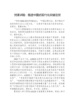 党课讲稿:推进中国式现代化关键在党党的XXX报告明确指出:中国式现代化,是中国共产党领导的社会主义现代化。这是对中国式现代化定性的话,是管总、管根本的。为什么要强调党在中国式现代化建设中的领导地位?这是因为,党的领导直接关系中国式现代化的根本方向、前途命运、最终成败。中国特色社会主义最本质的特征是中国共产党领导,中国特色社会主义制度的最大优势是中国共产党领导。坚持党对一切工作的领导,是党和国家的根本所在、命脉所在,是全国各族人民的利益所系、命运所系。以中国式现代化全面推进中华民族伟大复兴,必须坚持和加强党的全面领导,把坚持党的领导贯彻和体现到改革发展稳定、内政外交国防、治党治国治军各个领域各个方面,确保充分发挥党总揽全局、协调各方的领导核心作用。2023年2月7日,AXXX在新进中央委员会的委员、候补委员和省部级主要领导干部学习贯彻A新时代中国特色社会主义思想和党的XXX精神研讨班上发表重要讲话,深刻阐明中国式现代化的一系列重大理论和实践问题,鲜明强调党在中国式现代化建设中的领导地位。《中国式现代化是中国共产党领导的社会主义现代化》一文,是AXXX重要讲话的一部分。在这篇重要文章中,AXXX从党的领导决定中国式现代化的根本性质、党的领导确保中国式现代化锚定奋斗目标行稳致远、党的领导激发建设中国式现代化的强劲动力、党的领导凝聚建设中国式现代化的磅礴力量四个方面,深刻阐明中国式现代化是中国共产党领导的社会主义现代化,具有很强的政治性、理论性、针对性、指导性。要把深入学习贯彻AXXX这篇重要文章精神,同深入学习贯彻党的XXX精神和XXX最新重要讲话精神结合起来,同正在全党深入开展的学习贯彻A新时代中国特色社会主义思想主题教育结合起来,坚持不懈用A新时代中国特色社会主义思想凝心铸魂,深刻领悟两个确立的决定性意义,增强四个意识、坚定四个自信、做到两个维护,坚持和加强党的全面领导,确保以中国式现代化全面推进中华民族伟大复兴始终沿着正确方向前进。一、党领导人民开创了中国式现代化道路只有我们中国共产党人实现了。2020年10月,十四五规划即将布局,AXXX到广东考察,参观汕头开埠文化陈列馆,在《建国方略》相关规划图前,驻足感慨。《建国方略》绘就了近代中国谋求现代化的第一份蓝图:修建160万公里公路、约16万公里铁路、3个世界级大海港,还有建设三峡大坝……在当时看来,梦想的实现遥不可及。而今日中国,在中国共产党领导下,高铁飞驰领跑世界,公路纵横牵起城乡,世界大港十之有七,现代化程度远超当初的设想,强国建设、民族复兴展现出不可逆转的光辉前景。实现中华民族伟大复兴是近代以来中国人民的共同梦想,无数仁人志士为此苦苦求索、进行各种尝试,但都以失败告终。探索中国现代化道路的重任,历史地落在了中国共产党身上。新民主主义革命时期,党团结带领人民建立了人民当家作主的中华人民共和国,实现了民族独立、人民解放,为实现现代化创造了根本社会条件。新中国成立后,党团结带领人民确立社会主义基本制度,建立起独立的比较完整的工业体系和国民经济体系,为现代化建设奠定根本政治前提和宝贵经验、理论准备、物质基础。改革开放和社会主义现代化建设新时期,党作出把党和国家工作中心转移到经济建设上来、实行改革开放的历史性决策,实现了从生产力相对落后的状况到经济总量跃居世界第二的历史性突破,实现了人民生活从温饱不足到总体小文可居文库——海量学习资料,手机电脑均可下载www.wenkeju.com康、奔向全面小康的历史性跨越,为中国式现代化提供了充满新的活力的体制保证和快速发展的物质条件。在新中国成立特别是改革开放以来的长期探索和实践基础上,经过党的十八大以来在理论和实践上的创新突破,我们党成功推进和拓展了中国式现代化。——在认识上不断深化。党的十八大以来,中国特色社会主义进入新时代,以A同志为主要代表的中国共产党人,坚持把马克思主义基本原理同中国具体实际相结合、同中华优秀传统文化相结合,创立了A新时代中国特色社会主义思想,实现了马克思主义中国化时代化新的飞跃,为中国式现代化提供了根本遵循。进一步深化对中国式现代化的内涵和本质的认识,概括形成中国式现代化的中国特色、本质要求和重大原则,初步构建中国式现代化的理论体系,使中国式现代化更加清晰、更加科学、更加可感可行。——在战略上不断完善。以A同志为核心的党中央明确坚持和发展中国特色社会主义,总任务是实现社会主义现代化和中华民族伟大复兴,在全面建成小康社会的基础上,分两步走在本世纪中叶建成富强民主文明和谐美丽的社会主义现代化强国,以中国式现代化推进中华民族伟大复兴。明确五位一体总体布局和四个全面战略布局,深入实施科教兴国战略、人才强国战略、乡村振兴战略等一系列重大战略,为中国