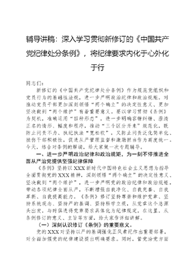 辅导讲稿:深入学习贯彻新修订的《中国共产党纪律处分条例》,将纪律要求内化于心外化于行同志们:新修订的《中国共产党纪律处分条例》作为规范党组织和党员行为的基础性法规,进一步严明政治纪律和政治规矩,对推动党员干部更加深刻领悟两个确立的决定性意义、更加坚决做到两个维护有着重要意义。要以学习贯彻《条例》为契机,准确运用四种形态,进一步明确容错纠错、澄清正名的情形、幅度和程序,推动三个区分开来规范化,既防止问责不力、执纪执法宽松软,又防止问责泛化简单化、挫伤干部积极性,促进从严管理监督和激励担当作为高度统一。今天,结合对条例的解读,给大家做一次专题辅导。一、进一步严明政治纪律和政治规矩,为一刻不停推进全面从严治党提供坚强纪律保障《条例》坚持以XXX新时代中国特色社会主义思想为指导全面贯彻党的XXX精神,深刻领悟两个确立的决定性意义、坚决做到两个维护,进一步严明党的政治纪律和政治规矩,带动各项纪律全面从严,不断增强自我净化、自我完善、自我革新、自我提高能力。《条例》修订坚持尊崇和维护党章、坚持系统观念、坚持严的基调、坚持科学立规,从党章这个总源头出发,与时俱进将党章要求具体化为纪律规定。在这里,从条例修订的意义、主旨等方面,给大家作详细讲解。(一)深刻认识修订《条例》的重要意义。党的XXX对坚持以严的基调强化正风肃纪作出重要部署,对全面加强党的纪律建设提出明确要求。同时,管党治党方面还存在的一些问题,也要求纪律建设进一步细化处分规定,让铁纪长牙、发威,让党员干部重视、警醒、知止,使铁的纪律真正转化为党员干部的日常习惯和自觉遵循。《条例》在修订过程中,总结全面从严治党经验,在指导思想中增写弘扬伟大建党精神,坚持自我革命,贯彻全面从严治党战略方针推动解决大党独有难题、健全全面从严治党体系为以中国式现代化全面推进强国建设、民族复兴伟业提供坚强纪律保障等内容,有利于推动全党更加深刻领悟两个确立的决定性意义、更加坚决做到两个维护。党的十八大以来,党中央总结全面从严管党治党经验,与时俱进对《条例》先后进行了三次修订。本次《条例》的修订,深入贯彻了XXXXXX关于全面加强党的纪律建设的重要论述,将全面从严治党的最新理论、实践成果和制度创新转化为党规党纪,进一步彰显了党坚持自我革命、刀刃向内的坚定决心,释放了从严治党越来越严格、执纪越往后越严厉的强烈信号。一是促进全党深刻领悟两个确立的决定性意义、坚决做到两个维护的必然要求。《条例》坚决落实党的XXX关于坚持加强党的全面领导和党中央集中统一领导的各项部署要求,突出政治纪律和政治规矩,有利于推动全党更加深刻领悟两个确立的决定性意义、更加坚决做到两个维护,在新征程上统一思想、统一意志、统一行动,步调一致向前进,使全党团结成一块坚硬的钢铁。二是贯彻落实XXX新时代中国特色社会主义思想的具体行动。《条例》将XXXXXX关于全面加强党的纪律建设重要论述转化为纪律要求,用贯穿党的创新理论的立场观点方法引领纪律建设工作,有利于为新征程上一刻不停推进全面从严治党提供坚强纪律保障。三是坚持问题导向,用严明的纪律管全党治全党的现实需要。坚持靶向施治,聚焦执纪监督中的重点难点问题,充实违纪情形,细化处分规定,有利于让铁纪长牙、发威,让党员干部重视、警醒、知止,使铁的纪律真正转化为党员干部的日常习惯和自觉遵循。文可居文库——海量学习资料,手机电脑均可下载www.wenkeju.com四是总结从严管党治党经验、实现制度与时俱进的实践要求。在总结实践经验基础上,与时俱进完善纪律规范,有利于充分发挥纪律建设标本兼治的利器作用,推动全面从严治党向纵深发展。(二)准确把握《条例》修订的主旨要义。此次修订《条例》比较充分地体现了一个总体特征,这就是全面加强党的纪律建设,要始终坚持严的基调,在全链条全周期全覆盖上持续用力,不断增强自我革命能力。在对象上对全党各级组织和全体党员全覆盖;在党员干部的管理上全周期从严;在责任落实上必须全链条从严,充实对新官不理旧账行为的处分条款。《条例》把坚决维护以XXX同志为核心的党中央权威和集中统一领导作为出发点和落脚点,进一步充实完善各级党组织和全体党员在政治方向、政治立场、政治言论、政治行为方面必须遵守的纪律规矩。坚持严字当头,通篇贯彻严的基调,在总则指导思想中增写贯彻全面从严治党战略方针推动解决大党独有难题、健全全面从严治党体系等内容,在工作原则中强调把严的基调、严的措施、严的氛围长期坚持下去。坚持实事求是,把从严管理监督和鼓励担当作为统一起来,有针对性地作出纪律规范,促进营造积极健康、干事创业的政治生态和良好环境。坚持明方向、立规矩、正风气、强免疫,一体推进锤炼党性、纯洁党风、严明党纪,持续放大标本兼