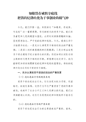 知敬畏存戒惧守底线把铁的纪律内化为干事创业的精气神今天,我们齐聚一堂,共同探讨知敬畏、存戒惧、守底线这一重要课题。作为新时代的党员干部,我们肩负着党和人民的期望与重托,必须时刻保持清醒的头脑,坚定理想信念,严守党的纪律和规矩。今天,我将从四个方面展开论述:一是充分认清党员干部违纪违法的严重危害;二是深入剖析典型案例的问题根源;三是分析当前党员干部在遵规守纪方面存在的问题;四是如何以实际行动立起新时代党员干部的好形象。希望通过这次学习,我们能够更加深刻地理解党的纪律和规矩的重要性,将铁的纪律内化为日用而不觉的言行准则。一、充分认清党员干部违纪违法的严重危害(一)违纪违法行为的现实表现党员干部违纪违法行为,往往表现为权力寻租、利益输送、权钱交易等。这些行为不仅严重损害了党的形象和威信,也破坏了社会公平正义和人民群众的利益。我们必须清醒地认识到,这些行为是党的纪律和规矩所不能容忍的。(二)违纪违法行为的严重后果党员干部违纪违法行为的后果是极其严重的。首先,它会严重损害党的形象和威信,使人民群众对党失去信心。其次,它会破坏社会公平正义,加剧社会矛盾和冲突。最后,它会危及国家的长治久安和人民的幸福安康。因此,我们必须时刻保持警醒和自律,坚决杜绝任何违纪违法行为的发生。(三)典型案例的警示作用近年来,我们党查处了一批党员干部违纪违法案件,这些案件给我们敲响了警钟。例如,某些官员利用职务之便