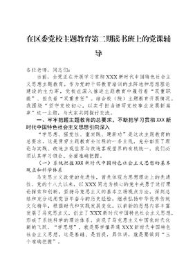 在区委党校主题教育第二期读书班上的党课辅导各位老师,同志们:当前,全党正在开展学习贯彻XXX新时代中国特色社会主义思想主题教育。作为党的干部教育培训的主阵地和思想理论建设的生力军,党校在深入推进主题教育中履行着双重职能、担负着双重责任。结合校(院)主题教育开展情况,我围绕坚守党校初心,以实干担当谱写党校事业发展新篇章这一主题,与大家共同探讨交流。一、牢牢把握主题教育的总要求,不断把学习贯彻XXX新时代中国特色社会主义思想引向深入学思想、强党性、重实践、建新功是这次主题教育的总要求。这是贯穿主题教育全过程的一条主线,充分彰显了理论与实践、改造主观世界与改造客观世界的有机统一,我们必须认真学习领会、全面准确把握。(一)系统把握XXX新时代中国特色社会主义思想的基本观点和科学体系马克思主义政党的先进性,首先体现为思想理论上的先进性。党的十八大以来,以XXX同志为核心的党中央勇于进行理论探索和创新,坚持马克思主义的基本立场观点方法,深刻总结和充分运用党百年奋斗的历史经验,继承弘扬中华优秀传统文化精华,根据时代和实践发展变化,以崭新的思想内容丰富发展了马克思主义,创立了XXX新时代中国特色社会主义思想,形成了系统科学的理论体系,实现了马克思主义中国化时代化新的飞跃。学思想,就是要学懂弄通XXX新时代中国特色社会主义思想,这是基础、是前提,具体讲,就是要做到三个准确把握。一是准确把握这一思想回答和解决的重大时代课题。党的十八大以来,国内外形势新变化和实践新要求迫切需要我们从理论和实践的结合上,深入回答关系党和国家事业发展、党治国理政的一系列重大时代课题。对此,我们党坚持把马克思主义基本原理同中国具体实际相结合、同中华优秀传统文化相结合,科学回答了新时代坚持和发展什么样的中国特色社会主义、怎样坚持和发展中国特色社会主义等重大时代课题,创立了XXX新时代中国特色社会主义思想,为推动党和国家事业取得历史性成就、发生历史性变革提供了科学理论指导,推动我国进入全面建设社会主义现代化国家的新征程。二是准确把握这一思想的主要内容。党的十九大、十九届六中全会提出的十个明确十四个坚持十三个方面成就概括了这一思想的主要内容。党的XX大概括提出并深入阐述的中国式现代化理论是这一思想的最新发展成果。其中,十个明确是支撑这一思想理论大厦的四梁八柱,是核心要义和基本精神;十四个坚持是新时代坚持和发展中国特色社会主义的基本方略,是贯彻落实这一思想的实践要求;十三个方面成就是新时代坚持党的全面领导、全面从严治党等方面取得的历史性成就和发生的历史性变革;中国式现代化理论是我们强国建设、民族复兴以及谋求人类进步、世界大同的必由之路。这些精髓要义,我们必须深入学习领会、全面系统掌握。三是准确把握这一思想的世界观和方法论。党的XX大提出的六个必须坚持概括阐述了XXX新时代中国特色社会主义思想的世界观、方法论和贯穿其中的立场观点方法。六个必须坚持是一个相互联系的有机整体,赋予了马克思主义世界观和方法论以新时代的内涵,充分彰显了这一思想的理论品格和鲜明特征,是深刻理解这一思想必须牢牢把握的基本点,也是新征程上继续丰富发展这一思想必须始终坚持的基本点,更是学深悟透的金钥匙,只有牢牢记在心上、攥在手上,才能方向笃定、行动坚定。(二)自觉用XXX新时代中国特色社会主义思想改造主观世界党性是党员干部立身、立业、立言、立德的基石,贯穿着我们党对党员一以贯之的政治品格、价值追求、精神境界、作风操守的严格要求。衡量党性强弱的根本标准,是公、私二字。党性强,就能知敬畏、守纪律、讲规矩、有觉悟,就能与党同心同德,对党忠诚、为党分忧、为党担责、为党尽职。党性弱,则丧失敬畏和觉悟,缺乏清醒的危机意识和底线思维。正如XXXXXX强调的讲政治最根本就是要讲党性,强党性就是要不断强化党员意识,牢记自己的第一身份是共产党员、第一职责是为党工作,坚定不移做两个确立的忠诚拥护者、两个维护的示范引领者,自觉用XXX新时代中国特色社会主义思想锤炼过硬的党性修养。(三)始终把XXX新时代中国特色社会主义思想转化为推动事业发展的强大力量理论的价值不仅在于认识世界,更在于指导实践,学习的成果要靠实践成效来检验。新时代新征程,只有把党的创新理论转化为推进中华民族伟大复兴的实践力量,才能把握历史主动,创造新的伟业。重实践就是要自觉践行XXX新时代中国特色社会主义思想,用以改造客观世界、推动事业发展,将党的创新理论蕴含的真理伟力转化为解决问题矛盾、战胜风险挑战的强大实践力量。要突出实践导向,积极识变应变求变,以时时放心不下的责任感、积极担当作为的精气神,敢于从艰难险阻中找出路,一事当前只为办好想办法、不为不办找借口,真抓实干、务求实效,切实解决