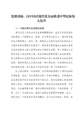 党课讲稿:以中国式现代化全面推进中华民族伟大复兴一、中国式现代化的理论创新现代化是人类社会历史发展的重要线索,也是当今社会进步和发展的一个重要标志。然而,对于现代化的定义,国内外学者存在不同的观点。其中,第一种观点认为现代化是近代资本主义兴起后的特定国际关系格局下,经济落后国家通过大搞技术革命在经济和技术上赶上世界先进水平的历史过程。第二种观点认为现代化是工业化的同义语,是经济落后国家实现工业化的进程。第三种观点认为现代化是自科学革命以来人类急剧变动的过程的统称。第四种观点认为现代化是一种心理态度、价值观和生活方式的改变过程,是代表当今历史时代的一种文明的形式。以上观点都有一定的道理,从不同的侧面揭示了现代化的特征和性质。因此,可以说现代化是一个综合的概念,它体现在社会发展进程中的方方面面和各个层次上。现代化的核心是经济领域的工业化、科技发展和市场机制,同时也涉及政治制度、文化观念、社会福利等方面。现代化的目标是实现一个更加富裕、平等、公正、自由的社会,提高人类的生活质量和幸福感。总之,现代化是一个复杂且多层次的概念,它不仅涉及经济、科技、政治等领域的发展,也涉及人类社会价值观和生活方式的变革。因此,在实现现代化的过程中,需要全面考虑各种因素,推动社会的全面进步和发展。1960年,各国学者在日本箱根召开会议,专门讨论现代化的标准问题,形成了著名的箱根共识,提出了有关现代化标准的八项指标:人口较高地向城市集中,整个社会日益以都市为中心组织起来;非生物能源高度利用,商品广泛流通,服务性行业发达;社会成员在广泛空间范围内相互作用,社会成员普遍参与经济和政治事务;村社和世袭社会群体普遍解体,个人社会流动性增大,个人的社会表现范围更加多样化;伴随个人非宗教地并日益科学地应付环境,普及读写能力;具有渗透性的大众传播网形成;政府、企业、工业等大规模社会设施的拥有,这些设施的组织日益科层化;各庞大人口集团逐渐统一在单一的控制(国家)之下,各国之间相互作用(国际关系)日益加强。20世纪70年代至80年代,美国社会学家阿历克斯·英格尔斯根据他对一些现代化国家的比较研究,提出了一套关于现代化标准的定量指标。这些指标包括:人均国民生产总值(GNP)3000美元以上;农业产值占GNP比重12%-15%以下;服务业产业占GNP比重45%以上;非农劳动力占总劳动力比重70%以上;识字人口的比重80%以上;适龄年龄组中大学生比重10%-15%以上;每名医生服务的人数1000人以下;平均预期寿命70岁以上;城市人口占总人口比重50%以上;人口自然增长率1%以下。那么,怎样实现现代化?这涉及现代化的道路问题。最初的现代化道路是资本主义道路,与资本主义相伴而生。英国是典型的例子,其工业革命从纺织领域兴起,但英国的资本主义却从农业领域兴起。在16世纪初期,英国的羊毛贸易和圈地运动推动了资本主义的发展,但同时也造成了农民与土地的分离,引发大量流民和治安问题。在欧洲现代化的进程中,环境污染、资源掠夺和破坏等问题也引发了严重的社会问题,如两极分化和阶级斗争。这些矛盾通过殖民掠夺、奴隶贸易、商品倾销、资本输出或移民、军事侵略等途径传递给欧洲以外的经济文化相对落后的国家。这些经济文化相对落后的国家开始了现代化的发展进程,但受到老牌资本主义国家的压制,因此必须寻找新的发展路径。在这样的国际关系格局下,社会主义现代化的道路应运而生。最早体现为苏联模式的社会主义现代化,其以工业化概念替代现代化概念,从重工业开始实行高收入,主要依靠本国农民积累资金,这种模式建立在生产资料全民所有制与集体所有制这两种公有制以及按劳分配、计划经济的基础之上。在新中国成立之初,我们沿袭苏联模式进行了社会主义工业化建设。然而,苏联模式起源于战争与革命的历史条件,但社会主义力量成长壮大后推动了时代主题从战争与革命到和平与发展的转变,可是许多国家并未及时、彻底地完成转变,不仅未能克服苏联模式的弊端,反而使其固定化甚至僵化1956年社会主义改造完成之际,毛泽东同志较早意识到了苏联模式的弊端。1956年4月,他在调查研究的基础上写了《论十大关系》。在这篇著作中,毛泽东同志指出了苏联模式的一些弊端如片面发展重工业,忽视农业和轻工业;在生产者、生产单位和国家这三者利益方面,苏联模式过度剥削农民,影响了生产积极性;在中央和地方的关系上,权力过度集中在中央,抑制了地方的生产积极性和主动性。1957年,毛泽东同志发表了《关于正确处理人民内部矛盾的问题》的著作,提出无论学习苏联还是西方,都要符合国情。1964、1965年之交,我们党逐步形成了分两步走、到20世纪末基本实现农业、工业、国防和科学技术四个现代化,使国民经济走在世界前列的发展战略。党的十一届三中全会以后,我们党以实事求是的态度重新谋划中国的现代化发展战略