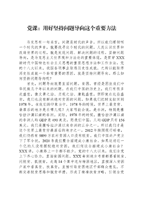 党课:用好坚持问题导向这个重要方法马克思有一句名言,问题是时代的声音。所以我们要倾听一个时代的声音,就要找寻这个时代的问题。人类认识世界和改造世界的过程,就是发现问题、解决问题的过程。坚持问题导向,是马克思主义世界观和方法论的重要体现,是贯穿XXX新时代中国特色社会主义思想的重要思想方法和工作方法。党的十八大以来,我国各项事业取得历史性成就,之所以能取得历史性成就一个非常重要的原因,就是坚持问题导向。那么如何坚持问题导向呢?首先,问题导向就要直面问题。贫困,曾经是困扰我们中华民族几千年以来的问题。在我们中国的历史上,我们有很多次盛世,像文景之治、贞观之治、康乾盛世。但即使在这些盛世,我们也没有解决绝对贫困的问题。如果我们把时光拉回到1978年,在我们的印象当中,1978年的时候,世界上最贫穷、最落后的地方是在哪儿呢?大家可能会说,是非洲,特别是撒哈拉沙漠以南的非洲。实际,1978年的时候,撒哈拉沙漠以南的非洲人均GDP是490美元。而我们中国,人均GDP只有156美元。我们是撒哈拉沙漠以南非洲的三分之一。所以我们才是这个世界上最贫穷最落后的地方之一。2012年按照现行标准,我们仍然有9899万农村贫困人口没有脱贫。我们中国共产党立下了军令状,2020年我们要全面建成小康社会。如果这将近一个亿的人没有摆脱绝对贫困,我们何谈全面建成小康社会?XXX讲,小康路上一个都不能少。党的十八大以来,我们全党上下齐心协力,直面贫困问题。XXX每到地方考察都要看脱贫、问脱贫、抓脱贫,走遍14个集中连片特困地区,直接深入贫困户家中看真贫、扶真贫,直接听取贫困地区干部群众意见,不断完善脱贫思路和脱贫举措,形成了精准扶贫方略,引领全党全国打赢了脱贫攻坚战,解决了这个困扰中华民族几千年的问题。这个问题的解决,是我们中国共产党对中国人民的伟大贡献、对中华民族的伟大贡献、对人类社会发展的伟大贡献。可以说直面问题是问题导向的第一个要诀。其次,问题导向需要深入分析问题。经济发展和环境保护的关系问题,曾经是困扰我国发展的一个难题。浙江安吉,是浙江北部的一个小县城。20年前安吉在浙江省内的知名度都不是很高很多人不知道安吉在哪?如今,几乎没有人不知道安吉这个地方。20年以来,安吉的知名度今非昔比。安吉知名度的提升与XXX紧密相关。2005年8月15日,时任浙江省委书记的XXX到安吉去调研,在安吉他讲了一句话,绿水青山就是金山银山。所以安吉也成为两山理念的诞生地。实际上,这次调研的主题不是环保,也不是生态,而是法治浙江建设。在听到村干部向他介绍我们关停破坏生态的矿山,转而发展生态经济的时候,他即兴讲了一段话,其中就提到,绿水青山就是金山银山。话是即兴的,但是思考是长期的、深入的。绿水青山和金山银山到底是什么样的关系?绿水青山和金山银山是不是对立的?欧美国家在现代化的过程当中,基本上都走过了一条先污染、后治理的路子。我们在发展的过程当中,也曾经走过了一段用破坏绿水青山来换取金山银山的路子。在深入分析长期思考的基础之上,XXX提出了绿水青山就是金山银山重要理念。后来,他又相继提出了,冰天雪地也是金山银山,保护生态环境就是保护生产力的科学论断。十年来,我国经济实力实现历史性跃升。环境保护发生历史性全局性变化。我们的绿水青山保护得更好了,金山银山做得更大了。这都是绿水青山就是金山银山重要理念指引的结果。所以在直面问题的基础之上分析问题,这是问题导向的第二个要求。再次,在分析问题的基础之上,持之以恒地解决问题。欲把西湖比西子,淡妆浓抹总相宜。在我们中国的古诗词中,赞美西湖美景的诗句非常多。在西湖边,有一座中国共产党杭州历史馆。这座历史馆把千年的西湖美景、百年的历史建筑和杭州的地方党史融合在一起,游人络绎不绝。然而在十八大以前,这里却是一座高档会所,装修奢华、价格昂贵,普通人望而却步。2013年浙江省启动整治会所中的歪风专项行动,摸排出杭州西湖边上的30多家会所。现在这30多家会所,全部都实现了转型。小切口,见证大变局。浙江省启动整治会所中的歪风专项方案,就是落实中央八项规定精神的重要突破口。办法就在问题里,思路就在困难处。问题导向,就是要找准病根、开对药方。2012年11月14日,党的十八大闭幕。第二天上午,十八届一中全会召开。一中全会闭幕以后,新一届中央政治局常委同中外记者见面。这是XXX履新以后,第一次会见中外记者。他在会见中外记者的时候,发表了一个重要讲话。在这个重要讲话当中,他讲打铁还需自身硬。XXX说,新形势下,我们党面临着许多严峻挑战,党内存在着许多亟待解决的问题。尤其是一些党员干部中发生的贪污腐败、脱离群众、形式主义、官僚主义等问题,必须下大气力解决。20天以后,12月4日旨在规范中央政治局委员行为的中央八项规定出台。全面从严治