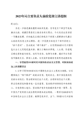 2023年局主要负责人廉政党课宣讲提纲同志们:为进一步推进廉政教育向纵深发展,引导党员干部坚守底线廉洁从政,根据区委落实主体责任有关要求,今天我在这里讲授一节廉政党课,目的就是让我们的党员干部深入理解新时代廉洁从政的现实意义和必要性,进一步促使全体党员干部牢固树立四个意识,坚决做到两个维护,自觉用XXX新时代中国特色社会主义思想武装头脑,树立正确的世界观、人生观、价值观正确处理奉献与索取、权利与责任、他律与自律、遵纪守法与保持节操的关系,算好人生账,切实筑牢拒腐防变的思想道德防线一、学思践悟XXX新时代中国特色社会主义思想,时刻保持政治上的清醒坚定1.以学习贯彻XXX新时代中国特色社会主义思想为契机,切实增强践行两个维护的政治自觉。党的历史、新中国发展的历史都告诉我们:要治理好我们这个大党、治理好我们这个大国,保证党的团结和集中统一至关重要,坚决维护XXXXXX党中央的核心、全党的核心地位,坚决维护党中央权威和集中统一领导,是中国共产党的重大政治原则和根本政治规矩。一要深化XXX新时代中国特色社会主义思育,凝聚思想共识。当下,XXX新时代中国特色社会主义思想主题教育活动正如火如荼开展,我们必须持续推动XXX新时代中国特色社会主义思想学习教育活动,教育引导全体党员干部深入了解XXXXXX的重要讲话精神,旗帜鲜明反对历史虚无主义,坚决抵制歪曲和丑化党的历史的错误倾向,正确认识党史上的重大事件、重要人物、重要会议等。深化对马克思主义中国化成果特别是XXX新时代中国特色社会主义思想的理解,坚决在思想上政治上行动上同以XXX同志为核心的党中央保持高度一致,引导党员干部树立正确的历史观、民族观、国家观、文化观,不断增强四个意识、坚定四个自信、坚决做到两个维护,为推动党的事业发展凝聚力量共识、打牢思想基础。二要总结历史经验,始终坚持正确的政治方向。党中央的权威不是凭空产生的,是党在领导中国人民不断创造历史的实践中确立的,两个维护这个重大政治原则也不是凭空产生的,是中国共产党百年浴血奋斗的历史经验。我们党很早就认识到,要把中国人民组织起来,改变旧中国四分五裂、一盘散沙的局面,首先要把自己组织起来,二大党章明确规定全体党员必须绝对服从全国大会及中央执行委员会的决议。正因为我们党从一开始就确立并始终坚持这一重大政治原则,才能经历各种艰难困苦而愈挫愈勇,团结带领中国人民从苦难走向辉煌,成为中国人民最可靠的主心骨。党的百年历史表明,维护党的核心,维护党中央权威和集中统一领导,决不是一般问题和个人的事,而是方向性、原则性问题,是党性,是大局,关系党、民族、国家前途命运。服从核心维护核心就是服从大局、维护大局,就是最大的政治。党中央有权威,党就有力量,如果党中央没有权威,党的理论和路线方针政策可以随意不执行,党就会变成一盘散沙,就会成为自行其是的私人俱乐部,党的领导就会成为一句空话。旗帜鲜明讲政治、保证党的团结和集中统一是党的生命,也是中国共产党能成为百年大党、创造世纪伟业的关键所在。党的百年伟大实践雄辩证明,只要全党团结成一块坚硬的钢铁,就能够把全国各族人民团结起来,形成万众一心、无坚不摧的磅礴力量,战胜一切强大敌人、一切艰难险阻。三要严格政治纪律和政治规矩。两个维护是我们党重要的政治纪律和政治规矩。要坚定政治定力敢于同破坏党的政治纪律和政治规矩的行为作斗争,通过严肃的党内政治生活杜绝思想上的跑冒滴漏、行为上的出轨越界,始终保持共产党人的初心不改、本色不变、立场不移,切实增强落实两个维护的主动性自觉性,确保政令畅通、令行禁止。2.深入学习领会XXX重要讲话精神,从党的优良作风中汲取前进力量。XXXXXX曾说过坚持真理、坚守理想,践行初心、担当使命,不怕牺牲、英勇斗争,对党忠诚、不负人民的伟大建党精神,深刻揭示了中国共产党的精神之源,深刻阐明了党的光荣传统、红色血脉的根和魂。我们要认真学习领会XXXXXX的重要讲话精神,用党的光荣传统和优良作风坚定信念、凝聚力量,切实把思想和行动统一到讲话精神上来,知责于心、担责于身、履责于行。一要永葆红色精神世代相传。人无精神不立,国无精神不强。在中华民族5000多年文明发展中,形成了在历史洪流中屹立不倒、挺立潮头的强大精神支撑。一百年前,中国共产党的先驱们创建了中国共产党,形成了伟大建党精神,这是中国共产党的精神之源。一百年来,我们弘扬伟大建党精神,在长期奋斗中构建起中国共产党人的精神谱系,锤炼出鲜明的政治品格历史川流不息,精神代代相传。我们要继续弘扬光荣传统,永远把伟大建党精神继承下去、发扬光大,增强做到两个维护的精神主动和行动自觉,鼓起奋进新征程的强大精气神。二要坚定对党的绝对忠诚。忠诚,是共产党员必备的政治品格,XXXXXX强调:我们党一路走来,经历