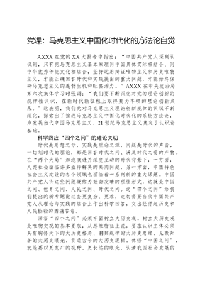 党课:马克思主义中国化时代化的方法论自觉AXXX在党的XX大报告中指出:中国共产党人深刻认识到,只有把马克思主义基本原理同中国具体实际相结合、同中华优秀传统文化相结合,坚持运用辩证唯物主义和历史唯物主义,才能正确回答时代和实践提出的重大问题,才能始终保持马克思主义的蓬勃生机和旺盛活力。AXXX在中央政治局第六次集体学习时强调:我们要不断深化对党的理论创新的规律性认识,在新时代新征程上取得更为丰硕的理论创新成果。这表明,我们党对马克思主义理论创新规律的认识不断深化,探索出了推进马克思主义中国化时代化的系统方法论,为发展当代中国马克思主义、21世纪马克思主义奠定了认识论基础。科学回应四个之问的理论关切时代是思想之母,实践是理论之源,问题是时代的声音,一切划时代的理论,都是回答时代之问、满足时代之需的产物。在两个大局加速演进并深度互动的时代背景下,一方面,人类社会面临许多亟待解决的共同问题,另一方面,中国特色社会主义建设的各个领域也面临着一系列新的重大课题。中国共产党人将这些问题凝结为振聋发聩的理性形式,这就是中国之问、世界之问、人民之问、时代之问。这四个之问给我们提出的新考题比过去更复杂、更难,迫切需要当代中国共产党人从理论与实践的结合上作出科学回答,交出经得起历史和人民检验的圆满答卷。回答四个之问必须牢固树立大历史观。树立大历史观是唯物史观的基本要求,从思维特征上说,要求认识主体必须具有胸怀天下的大历史格局、洞察规律的大历史思维、见微知著的大历史眼光、贯通古今的大历史逻辑。体悟中国之问,就是要以更宽广的视野、更长远的眼光,认清我国社会发展的大逻辑、大趋势,把握中国式现代化的历史沿革和实践要求,在中国近代以来的历史进程中定位中华民族伟大复兴的中国梦,在世界历史发展进程中定位中国特色社会主义,科学回答建设什么样的社会主义现代化强国、怎样建设社会主义现代化强国的重大问题,坚定不移地以中国式现代化全面推进中华民族伟大复兴;体悟世界之问,就是要深刻把握人类社会发展的大逻辑、大趋势,理清世界历史的发展脉络,汲取人类历史的经验教训,认清当今世界存在的问题与挑战,辨识世界未来的正确走向,科学认识和回答世界怎么了、我们怎么办的时代课题,统筹中华民族伟大复兴战略全局和世界百年未有之大变局,向世界申明中国立场,倡导中国主张,提供中国方案,贡献中国智慧,发挥中国力量,促进世界和平与发展,推动构建人类命运共同体,为人类的发展进步作出更大贡献;体悟人民之问,就是要始终坚持以人民为中心的价值立场,自觉践行党的群众路线,细心体察人民对美好生活的向往,不断满足人民群众更有品质、更丰富多样的美好生活需要,不断推进社会全面进步和人的自由全面发展,让中国人民获得富足、幸福、自由和尊严;体悟时代之问,就是要准确把握和平与发展的时代主题,正确认识和处理过去、现在、未来的关系,与世界各国一道,认识和处理全球性问题,以中国的发展促进世界的繁荣与进步,不断缩小和化解和平赤字、发展赤字、安全赤字、治理赤字,以强烈的历史主动精神引领时代,塑造时代,创造人类的美好未来。在中国的历史方位发生重大变化的今天,无论是回应中国之问人民之问,还是世界之问时代之问,都必须清醒地认识到社会主义与资本主义、新兴大国与老牌发达国家并存出现的新的严峻形势。历史上,有些率先完成工业化的国家,以大炮的射程垄断真理,以强权逻辑制定规则,将规则霸权包装成规则文明,把西方价值观演绎为普世价值,想要按照自己的面貌为自己创造一个世界。从特朗普政府开始,美西方大搞团伙政治,拉帮结派,对中国这样的世界大国也发起无理性且无底线的全面打压、围堵和制裁,公然以双重标准扯下他们最后的文明遮羞布,让原本的强盗逻辑、霸权思维和伪善面目赤裸裸地暴走于天下。美西方今天所宣称的文明,仍如马克思当年指出的那样:当我们把目光从资产阶级文明的故乡转向殖民地的时候,资产阶级文明的极端伪善和它的野蛮本性就赤裸裸地呈现在我们面前,它在故乡还装出一副体面的样子,而在殖民地它就丝毫不加掩饰了。站在世界何去何从的十字路口,中国坚定不移地走和平发展道路,旗帜鲜明地反对霸权主义和强权政治,弘扬和平、发展、公平、正义、民主、自由的全人类共同价值,致力于推动构建人类命运共同体。通过回答四个之问,全面系统地提出解决现实问题的科学理念和有效对策,让当代中国马克思主义、21世纪马克思主义展现出更为强大、更有说服力的真理力量,兑现中国共产党人为中国人民谋幸福、为中华民族谋复兴、为人类谋进步、为世界谋大同的历史使命。自觉坚持两个结合的方法论原则方法论是理论原则、理论逻辑向认识和实践过程的自然延伸。坚持用马克思主义的方法论运用和发展马克思主义,是马克思主义政党理论上彻底的自觉表