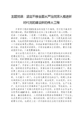 主题党课:坚定不移全面从严治党深入推进新时代党的建设新的伟大工程尽管学习党的XXX报告的角度不尽相同,但万变不离其宗我们都知道,党的XXX报告总体上旨在解决两个核心问题:一是讲一个好故事;二是建一个好团队。也就是说,我们要把故事讲好、讲精彩,一个是现代化的故事,另一个是民族复兴的故事,这也是党的XXX报告对当下中国社会最主要的顶层设计。一个好的故事是必要的,和好故事相伴随的还有一个非常重要的方面,那就是好的团队。只有好故事加上好团队,最后才能成就好作品,二者是要兼备的。在过去悠久的历史中,我们这个民族何曾如现在这样自觉把建设现代化、从世界民族之林中脱颖而出当作清晰的目标。可以说,党的XXX报告讲的现代化的故事、民族复兴的故事,是中华民族在历史上讲过的最富有理想、具有最高境界和情怀的故事了。尽管有人讲中国在历史上的很多时候都是领先世界的,但那是在世界互通有无、贸易往来不充分的情况下,是在世界上很多地方闭关隔绝的情况下,是在没有充分的世界历史的背景下,所以这种领先不是竞争的结果,而是自然发生的结果。今天就不一样了,在全球化高度发达的当下,构建人类命运共同体已成为客观的经济现实、政治现实、社会现实。在这一背景下,国家与国家、政治与政治、文化与文化、生产与生产、技术与技术之间都具有了充分的可交流性、可比较性,全世界也就具有了足够大的竞争与合作空间。在竞争与合作当中,全世界的GDP排名、城镇化排名、人均寿命排名、恩格尔系数排名、廉洁指数排名、人均受教育年限排名等都具有了可比性。也正是通过这种近似、相似的比较,我们充分认识到了发展的道理与方向,也通过上述一系列指标表达出现代化国家和非现代化国家、发展好的国家和发展不好的国家的区别。党的XXX报告指出:中国式现代化,是中国共产党领导的社会主义现代化,既有各国现代化的共同特征,更有基于自己国情的中国特色。现代化是人类物质文明、精神文明、政治文明长期发展和积累的结果,具有普遍性与广泛性。今天的中国要讲现代化的故事,要以中国式现代化全面推进中华民族伟大复兴,是我们党顺应历史潮流,遵循人类社会发展规律,顺应中华民族发展的内在规律,为中国社会寻找到的一个具有光明前景的,能够推动中华民族走向进步、前进与发展的方向。在世界范围内,一批国家已经在现代化这条道路上取得成功,我们也要沿着这条有前景的道路走下去,实现民族的发展与复兴,这是非常了不起的。一个高规格的故事,一个动人的故事,一个富有前景的故事,当然需要好的团队带领。那么,这个团队的建设问题,就是党的建设的问题。现代化的故事讲得怎么样,关键取决于党领导得怎么样。现代化本身无所谓成功与失败,党领导得好,现代化就走向成功;党领导得不好,现代化就走向失败。那么,党领导得怎么样,取决于什么?党的建设的水平。党建设得好,党的领导就能够发挥好的作用;党建设得不好,党的领导就不能够正确地发挥作用。所以,党的领导就是给现代化赋能,党的领导是中国式现代化行稳致远的发动机、驱动器。党领导得好,这台机器就能够稳稳地徐徐向前。所以,党的领导的问题因为现代化的顶层设计而前所未有地突显出来,党的领导和现代化的成功与否产生了紧密的关联,党的领导成为实现现代化的关键决定力量。所以,在现代化的因子中,党的领导既是首要的原则,也是现代化的本质性规定、决定性因素。党的领导的程度、水平、方向、效果,直接关乎着现代化的方向、过程、结果。没有科学、正确的党的领导,现代化就不可能实现。现代化代表的是什么?是一种高度的历史自觉、高度的国家理性自觉、高度的民族自觉。没有了党的领导,没有了这样一股自觉的力量,现代化就会变成自发性的行动,想怎么搞就怎么搞,搞成什么样子就是什么样子,无所谓好坏、对错、成功失败。总之,没有了标准、构想、方向的现代化就失去了意义,现代化和非现代化的界线也就模糊了。所以,现代化与民族复兴,本质上代表的是中国共产党的政治力量、民族意识、国家意识、历史意识的觉醒,代表着我们党对这个时代、这个国家、这个民族的最高的认识和理解。现代化命题的出现就是党的领导的直接结果,党的领导水平、能力、质量、效果直接取决于党的建设,所以解决党的建设的问题就是解决团队的问题。一、深刻把握历史方位,推进新时代党的建设新的伟大工程充分认识在新时代党的事业中、党的XXX的工作格局里、党的XXX的政治坐标上,中国共产党是什么样的,是我们加强党的建设的首要前提,也就是得先找准历史方位、政治坐标。我们可以看到,在同样高举中国特色社会主义伟大旗帜下党的十八大与党的XXX所作的文章是不同的,国家政治生活的主题由为全面建成小康社会而奋斗变为为全面建设社会主义现代化国家而奋斗,是因为现代化代表着更高水平、更高程度、更强能力的国家发展方向。国家的发展逻辑当然是向前发展、向文明的方向发展。所以,由小康社会变为