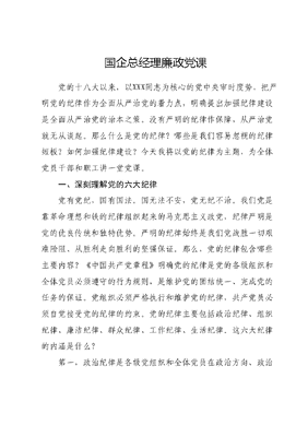 国企总经理廉政党课党的十八大以来,以XXX同志为核心的党中央审时度势,把严明党的纪律作为全面从严治党的着力点,明确提出加强纪律建设是全面从严治党的治本之策。没有严明的纪律作保障,从严治党就无从谈起。那么什么是党的纪律?哪些是我们容易忽视的纪律短板?如何加强纪律建设?今天我将以党的纪律为主题,为全体党员干部和职工讲一堂党课。一、深刻理解党的六大纪律党有党纪,国有国法。国无法不安,党无纪不治。我们党是靠革命理想和铁的纪律组织起来的马克思主义政党,纪律严明是党的优良传统和独特优势。严明的纪律始终是我们党战胜一切艰难险阻、从胜利走向胜利的坚强保证。那么,党的纪律包含哪些主要内容?《中国共产党章程》明确党的纪律是党的各级组织和全体党员必须遵守的行为规则,是维护党的团结统一、完成党的任务的保证。党组织必须严格执行和维护党的纪律,共产党员必须自觉接受党的纪律的约束。党的纪律主要包括政治纪律、组织纪律、廉洁纪律、群众纪律、工作纪律、生活纪律。这六大纪律的内涵是什么?第一,政治纪律是各级党组织和全体党员在政治方向、政治立场、政治言论、政治行为方面必须遵守的规矩,是牵头管总的纪律,是维护党的团结统一的根本保证,遵守党的政治纪律是遵守党的全部纪律的重要基础。政治纪律主要是四个坚决:坚决与党中央保持一个声音,坚决贯彻党和国家的方针政策以及决策部署,坚决与宗教迷信活动划清界限,坚决反对团团伙伙、拉帮结派。第二,组织纪律是规范和处理党的各级组织之间、党组织与党员之间以及党员与党员之间关系的行为规则,是维护党的集中统一、保持党的战斗力的基本条件。组织纪律主要包括四服从三严格一自觉。四服从即党员个人服从党的组织,少数服从多数,下级组织服从上级组织,全党各个组织和全体党员服从党的全国代表大会和中央委员会。三严格一自觉即严格遵守组织制度和程序,严格执行民主集中制和请示报告制度,严格按组织原则和组织程序办事,自觉接受组织安排和纪律约束。第三,廉洁纪律是党组织和党员在从事公务活动或者其他与行使职权有关的活动中应当遵守的廉洁用权的行为规则,是干部清正、政府清廉、政治清明的重要保障。核心内容即为《中国共产党廉洁自律准则》:党员要坚持公私分明,先公后私,克己奉公;坚持崇廉拒腐,清白做人,干净做事;坚持尚俭戒奢,艰苦朴素,勤俭节约;坚持吃苦在前,享受在后,甘于奉献。领导干部要廉洁从政,自觉保持人民公仆本色;廉洁用权,自觉维护人民根本利益;廉洁修身,自觉提升思想道德境界;廉洁齐家,自觉带头树立良好家风。第四,群众纪律是党的各级组织和全体党员坚持以人民为中心的发展理念和处理党群关系时必须遵守的行为规则,充分体现了党的性质和宗旨,是密切党同人民群众血肉联系、克服脱离群众危险的重要保证。党的群众纪律要求各级党组织和共产党员,必须坚持党的全心全意为人民服务的宗旨,时刻维护人民群众的利益,做到四个严禁,即严禁侵害群众利益;严禁欺压群众充当黑恶势力保护伞;严禁漠视群众利益的不作为、乱作为严禁侵犯群众知情权。第五,工作纪律是党组织和党员在党的各项具体工作中必须遵循的行为规则,是党组织和党员依规开展各项工作的重要保证正确履职、担当尽责、作风优良,这是党的工作纪律要求的重要内容,也是党的各项工作正常开展的重要保证。对党是否绝对忠诚、是否遵从党组织要求、是否做到廉洁自律、是否始终保持与人民群众的血肉联系,都体现在具体的工作实践中,需要工作纪律做保障。第六,生活纪律是党员在日常生活和社会交往中应当遵守的行为规则,涉及个人品德、家庭美德、社会公德等各个方面,直接关系党的形象。生活纪律重在规范党员干部八小时之外的私人生活,要求党员必须发扬社会主义新风尚,带头实践社会主义核心价值观和社会主义荣辱观,提倡共产主义道德,弘扬中华民族传统美德,自觉遵守家庭美德和社会公序良俗,坚决反对享乐主义和奢靡之风,坚决反对一切庸俗、落后、腐化和违背党的理想信念宗旨的行为。六大纪律相互联系、相互统一,涵盖党的纪律各个方面,体现了对党员的高标准严要求,是保持党的肌体健康、维护党的团结统一提供了有力武器,是党的各级组织和全体党员必须遵守的行为规则,必须一以贯之、身体力行。二、以案为鉴强化纪律意识入党誓词和《党章》党员义务章节中都提出了严守党的纪律,正如习XXX强调的:党的纪律是全党必须遵守的行为准则严格遵守和坚决维护纪律是做合格党员、干部的基本条件。纵观身边的典型腐败案例,党员干部违法犯罪,始于纪律意识松懈党纪防线逐渐失守,一步步滑向违法深渊,最终沦为阶下囚事实证明,拒腐防变守住党纪底线是关键,2018年党中央修订实施《中国共产党纪律处分条例》,以负面清单的形式为全体党员划出了纪律红线。《条例》第二编分则第四十四条至第一百三十八条详细列举了各类违反六大纪律的情形,这里不展开赘述就