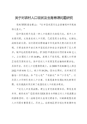 关于对农村人口现状及生育意愿问题研究党的XXX报告提出:以中国式现代化全面推进中华民族伟大复兴。①中国式现代化是一种人口规模巨大的现代化,其中人口发展问题,尤其是农村人口问题,已经显现为全局性、长期性、战略性的议题。该问题时刻影响着中华民族伟大复兴的历史进程。尽管自改革开放以来中国在经济和社会方面取得了巨大进步,城市化进程稳步推进,但2022年我国农村仍旧有4.91亿人口,占全国总人口的34.8%,其意义不容忽视。我国人口形势正在经历深刻变化,其中农村人口发展呈现出独特的复杂性。具体而言,农村人口总量持续减少,由2000年的8.08亿人降至2022年的4.91亿人,减少约39.2%。②与此同时,农村地区还面临一系列挑战,如空心化老龄化和少子化,以及因人口迁移引发的人户分离、空巢现象和性别比例失衡等问题。这些挑战共同反映了我国农村人口的复杂现状。优化人口发展战略,建立生育支持政策体系,降低生育养育、教育成本③是党的XXX报告为积极应对人口挑战提出的战略目标。这一战略目标从生育议题着手,对破解我国农村人口问题有重要意义。历史上,农村地区受计划生育政策和地域文化特色的双重影响,其生育意愿和生育水平长期高于城市。但近年来,社会经济的迅猛发展引发了这一趋势的显著转变。第七次全国人口普查数据显示,到2020年,中国农村地区0岁至4岁幼儿数量占全国同年龄段幼儿比例已低于农村全年龄人口占全国比。①不仅农村生育水平大幅下降,全国生育率同样面临整体低迷的问题。事实上,我国已成为全世界总和生育率最低的国家之一,仅为1.3。②根据低生育率陷阱理论,一旦总和生育率低于1.5,扭转生育率下降趋势将非常困难。③因此,对我国而言,制定有效政策提升生育水平,破除生育意愿和生育数量所面临的障碍,变得尤为紧迫。而缘于过去生育率相对较高、人口基数大的属性,农村地区自然成为提高全国生育水平的关键突破口。在此背景下,本研究致力于解答如下问题:第一,我国农村当前的人口态势和生育状况如何?其中存在哪些主要问题和冲突?第二,农村生育意愿的转变有何特征?第三,农村育龄人口如何认识我国的鼓励生育政策?为此,本文将深入分析2000年至2020年期间历次人口普查、人口抽样调查数据以及xx年共青团中央青少年生育配套支撑政策调查数据,④回答上述问题,并为我国农村人口发展、乡村振兴以及经济社会发展提供政策建议。一、中国农村人口状况(一)中国农村人口总量分析伴随着城市化的推进,我国农村人口总量呈现逐渐下滑的态势。2020年的数据显示,农村人口约为5.1亿人,相较于2000年减少了约2.7亿人,降幅达35%。在这20年间,农村人口在全国总人口中的比例从63.1%下降至36.2%,降幅约为27个百分点(见表1)。然而,我国的城市化进程存在明显的地域差异,农村人口占总人口比重在不同省份和地区明显不同。例如,在经济发展相对滞后的西藏、xx、甘肃和贵州等地,农村人口比重依然较高。比较而言,在经济较为发达的北京、xx、xx和广东等地区,农村人口的占比则明显偏低。从农村人口减少的速率来看,⑤xx、江苏、浙江等东部省份的农村人口减少更快。总体来看,西部地区的农村人口占比较高,城市化进程相对缓慢。我国农村人口的变化受多重因素影响,其中不同世代人口数量的变化值得关注。表2中2000年、2010年、2020年各世代农村人口的数量及变化,揭示出我国农村人口在自然变化和机械变化两个层面的演变特征。较早世代的人口数量变化更多地来自人口的自然变化。例如,2010年的30后农村人口相比于2000年减少了36.2%,2020年的40后农村人口相比于2010年减少了29.4%,其主要原因在于人口自然死亡。对80后90后和00后而言,人口数量的显著下降更多地受到人口机械变化的驱动,其中以农村向城市的人口流动为主导。特别是在2000年至2010年间,农村劳动力外出务工被视为提高生活水平的主要途径,这成为80后农村人口大量流出的重要原因。在随后的2010年至2020年间,80后90后和00后农村人口外流进一步加快。这些因素共同推动了我国农村人口总体数量的快速减少。(二)中国农村人口结构分析随着农村人口数量的显著减少,我国人口结构也呈现显著变化,主要体现在以下几个方面:第一,农村地区呈现出明显的人口老龄化特征,青壮年劳动力大幅减少。表3显示,2000年至2020年间,60岁及以上的人口比例稳步上升,占比从11.0%提升至23.8%。与此同时,20岁至44岁劳动力的占比逐渐减少,从39.8%下降至27.6%。第二,农村地区正在经历少子化,童龄人口逐渐减少在过去的二十年里,农村0岁至9岁的儿童占总人口的比例从14.1%减少到了12.3%,并且呈现出持续下降的趋势。第三,农