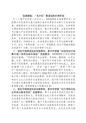 党课讲稿:牢牢把握九个以实践要求坚定不移推进党的自我革命在二十届中央纪委三次全会上,发表重要讲话,从统筹中华民族伟大复兴战略全局和世界百年未有之大变局的高度,着眼建设什么样的长期执政的马克思主义政党、怎样建设长期执政的马克思主义政党这一重大时代课题,全面总结新时代全面从严治党的新进展、新成效,深刻阐述党的自我革命的重要思想,科学回答我们党为什么要自我革命、为什么能自我革命、怎样推进自我革命等重大问题,明确提出九个以的实践要求,对持续发力、纵深推进反腐败斗争作出战略部署。今天,我以牢牢把握九个以实践要求坚定不移推进党的自我革命为题,与大家共同学习交流。一、坚定不移推进党的自我革命,要牢牢把握以坚持党中央集中统一领导为根本保证实践要求。在党的报告中强调:党的领导是全面的、系统的、整体的,必须全面、系统、整体加以落实。维护党中央集中统一领导是具体的而不是抽象的,首先要落实到坚定维护党中央权威上,落实到增强四个意识、坚定四个自信、做到两个维护的实际行动上。要把坚决维护党中央的核心、全党的核心地位,坚决维护以同志为核心的党中央权威和集中统一领导作为根本政治原则,把学习贯彻新时代中国特色社会主义思想作为首要政治任务,把不折不扣贯彻落实党中央重大决策部署作为首要政治担当,推动党中央各项决策部署落地生根,把党的事业不断推向前进。二、坚定不移推进党的自我革命,要牢牢把握以引领伟大社会革命为根本目的实践要求。勇于自我革命是我们党区别于其他政党的显著标志,是党跳出治乱兴衰历史周期率、历经百年沧桑更加充满活力的成功秘诀。以引领伟大社会革命为根本目的这一重要要求,揭示了我们党将以永远在路上的坚定和执着,把全面从严治党这场伟大自我革命进行到底;彰显了我们党永远保持马克思主义执政党本色,永远走在时代前列,永远做中国人民和中华民族的主心骨的政治本色。新征程上,我们必须继续发扬彻底的革命精神,勇于进行自我革命,把党建设得更加坚强有力,努力把新时代坚持和发展中国特色社会主义这场伟大社会革命进行好。三、坚定不移推进党的自我革命,要牢牢把握以新时代中国特色社会主义思想为根本遵循实践要求。理论创新每前进一步,理论武装就要跟进一步。现在,党团结带领中国人民奋进在实现第二个百年奋斗目标新的赶考之路上。面对新征程上的新挑战新考验,我们必须以新时代中国特色社会主义思想为指导,坚持不懈加强理论武装,坚定不移推进全面从严治党,使百年大党在自我革命中不断焕发蓬勃生机,始终成为中国人民最可靠、最坚强的主心骨。党的创新理论是推动工作、解决问题的金钥匙。学习贯彻二十届中央纪委三次全会精神,最重要、最关键的是学深悟透关于党的自我革命的重要思想,并将其转化为坚定理想、锤炼党性和指导实践、推动工作的强大力量,把党的自我革命的思路举措搞得更加严密,把每条战线、每个环节的自我革命抓具体、抓深入。四、坚定不移推进党的自我革命,要牢牢把握以跳出历史周期率为战略目标实践要求。赶考永无止境,自我革命永远在路上。强国建设、民族复兴的宏伟目标令人鼓舞、催人奋进,我们这一代共产党人使命光荣、责任重大。如何防止马克思主义政党在长期执政条件下腐化变质,永葆党的先进性和纯洁性、增强党的凝聚力和战斗力,仍是我们党最为紧迫、最为要害、最为根本的大问题。成其身而天下成,治其身而天下治。要保证我们党永葆生机活力,担负起新时代的历史使命,始终成为马克思主义执政党,就必须以跳出历史周期率为战略目标,以革命者必先自我革命的坚定意志和决心,继续推进自我革命,把党建设得更加坚强有力。五、坚定不移推进党的自我革命,要牢牢把握以解决大党独有难题为主攻方向实践要求。解决大党独有难题,是实现新时代新征程党的使命任务必须迈过的一道坎,是全面从严治党适应新形势新要求必须啃下的硬骨头。遍观人类社会几百年的政党政治,许多大党老党也曾经朝气蓬勃、生机盎然,但有的早已折戟沉沙,有的则是日薄西山,还有的深陷沉疴,令人唏嘘也发人深省。大党独有难题必须靠大党自身力量才能根本解决。我们必须深刻认识解决大党独有难题的时代意义、政治特质和丰富内涵,准确理解把握解决大党独有难题的实践要求,把党建设好建设强。只有坚持刀刃向内,在坚定理想信念、维护团结统一、提升治理能力、振奋精气神、纠正错误偏差、做到激浊扬清等方面始终如一、坚持不懈地抓下去,才能使党永葆旺盛生命力和强大战斗力。六、坚定不移推进党的自我革命,要牢牢把握以健全全面从严治党体系为有效途径实践要求。全面从严治党体系是一个内涵丰富、功能完备、科学规范、运行高效的动态系统,关涉管党治党各要素各方面各环节。健全这个体系,要坚持制度治党、依规治党,更加突出党的各方面建设有机衔接、联动集成、协同协调,更加突出体制机制的健全完善和法规制度的科学有效,