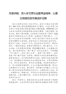 党课讲稿:深入学习贯彻全国两会精神,以更加昂扬的姿态奋进新征程经过全国两会的深入讨论与审议,政府工作报告为我们明确了2024年的主要发展预期目标和工作重点,这充分体现了我们党对于国家发展全局的深思熟虑与精准把握。XXXXXX在参与各省代表团审议时的重要指示和批示精神,为我们指明了前进方向,提供了根本遵循。这份政府工作报告深入贯彻了XXX新时代中国特色社会主义思想,全面落实了党的XX大、二十届二中全会的各项决策部署,体现了我们党对于经济社会发展的深刻理解和全面布局。报告对过去工作的总结全面而客观,既肯定了成绩,也指出了不足;提出的目标切实可行,既符合实际,又富有挑战性;政策取向精准有力,既注重长远,又关注当前;任务部署具体明确,既强调整体推进,又注重重点突破。我们要深刻领会两个确立的决定性意义,不断增强四个意识,坚定四个自信,做到两个维护,始终坚持两个毫不动摇的原则,确保党中央的决策部署得到全面贯彻和执行。我们要将思想和行动统一到党中央的决策部署上来,紧密围绕今年的经济社会发展目标任务,以更加昂扬的斗志、更加务实的作风、更加有力的措施,加速培育新质生产力,努力构建新发展格局,全力以赴推动高质量发展。通过本次党课的学习与讨论,我们将进一步明确今年的重点工作任务,深入探讨如何有效贯彻落实这些任务,以期通过深入交流,进一步凝聚共识,明确方向,为实现全年经济社会发展目标做出积极贡献。让我们携手共进,为实现中华民族伟大复兴的中国梦而努力奋斗!经过一年的努力,我国在经济社会发展方面取得了显著的高质量成果。这些成果是在面临多重风险和挑战的背景下取得的,实属难能可贵。这些成就进一步凸显了两个确立在应对风险挑战、推进中国式现代化建设中的决定性作用。一、过去一年,以XXX同志为核心的党中央展现出坚定的领导力,团结带领全党全军全国各族人民,成功完成了经济社会发展的核心目标,取得了新的巨大成就。这些成就充分彰显了以XXX同志为核心的党中央的坚强领导力和XXX新时代中国特色社会主义思想的科学指引力。我们必须深入学习和贯彻党中央的决策部署,明确政府工作报告所提出的目标任务。同时,我们应立足本地区经济社会发展的实际情况,聚焦于经济建设这一中心工作和高质量发展这一核心任务。我们要坚定信心,引导预期,狠抓落实,持续推动高质量发展迈上新台阶。通过实际行动和工作成效,坚决拥护两个确立,坚决做到两个维护。第一,两个确立对党和国家事业取得历史性成就、发生历史性变革具有决定性作用。当前,中国特色社会主义进入新时代,面临外部环境深刻复杂变化带来的新风险与新挑战,以及国内改革发展稳定中诸多长期未解的深层次矛盾和问题。以XXX同志为核心的党中央展现出伟大的历史主动精神、巨大的政治勇气和强烈的责任担当,全面统筹国内国际两个大局,坚定不移地贯彻党的基本理论、基本路线、基本方略,统揽伟大斗争、伟大工程、伟大事业、伟大梦想。在稳中求进的工作总基调下,党中央出台一系列重大方针政策,推出重大举措,推进重大工作,成功战胜重大风险挑战,攻克长期未解难题,完成关乎长远的大事要事,推动党和国家事业取得历史性成就、发生历史性变革。正是在这样的时代背景、历史选择、人民期盼和实践锻炼中,XXXXXX赢得了党中央的核心、全党的核心这一崇高地位。全面建设社会主义现代化国家、全面推进中华民族伟大复兴,关键在党。新征程上,我们必须深刻认识两个确立的决定性意义,更加自觉地维护XXXXXX党中央的核心、全党的核心地位,更加自觉地维护以XXX同志为核心的文可居文库——海量学习资料,手机电脑均可下载www.wenkeju.com党中央的权威和集中统一领导,全面贯彻XXX新时代中国特色社会主义思想,坚定不移地在思想上、政治上、行动上同以XXX同志为核心的党中央保持高度一致。第二,我们必须将两个确立的理念转化为自觉行动,坚决维护党中央的权威和集中统一领导。2023年,国内外环境复杂多变,改革发展稳定任务艰巨繁重。以XXX同志为核心的党中央展现出深远的战略眼光、坚定的意志力和非凡的战略定力,成功引领全国各族人民应对各种风险挑战,取得令人瞩目的成就,为推进中国式现代化奠定坚实基础。我们要深刻认识两个确立的重大意义,增强政治、思想、理论和情感认同,将其转化为自觉的思想、政治和行动,牢记XXXXXX的嘱托,以更大担当和作为,确保中央经济工作会和政府工作报告确定的任务得到有效落实,为现代化建设贡献力量。第三,我们必须坚决拥护两个确立的重要思想,严格遵循两个维护的原则,为国家的强盛和民族的复兴创造更有利的国际环境,提供更为坚实的战略支持。每年全国两会期间,XXXXXX与代表委员共商国家大事,关心百姓疾苦,讲述生动故事,留下许多感人瞬间和深刻话语。我们要深刻理解,两个