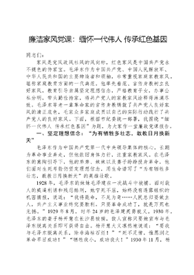 廉洁家风党课:缅怀一代伟人 传承红色基因同志们:家风是党风政风社风的风向标,红色家风是中国共产党永不褪色的传家宝。毛泽东作为中国共产党、中国人民解放军、中华人民共和国的主要缔造者和领袖,非常重视家庭家教家风,堪称家庭教育方面的一代典范。他率先垂范、言传身教树立良好家风,教育引导亲属坚定理想信念,严格教育子女,办事公私分明,带头勤俭持家,将共产党人的家教家风诠释得淋漓尽致。毛泽东等老一辈革命家的言传身教铸就了共产党人良好家风的清正底色,毛家众多家庭成员以自己的实际行动践行了共产党人的良好家风。下面,根据市纪委统一部署,我围绕缅怀一代伟人 传承红色基因为题,为大家作一堂廉政党课报告。一、坚定理想信念:为有牺牲多壮志,敢教日月换新天毛泽东作为中国共产党第一代中央领导集体的核心,长期为革命事业奔走,但他依旧身体力行,注重家教家风。在毛泽东的熏陶引导下,他的弟弟、妹妹以及妻子纷纷投身革命,他们面对生死考验仍坚定理想信念,用生命谱写了为有牺牲多壮志,敢教日月换新天的英雄壮歌。1928年,毛泽东的妹妹毛泽建在一次战斗中被捕。面对敌人的威逼利诱和残忍酷刑,她宁死不屈,始终没有透露组织的机密情报,说道:我将毙命,不足为奇……人民总归要做主人,共产主义事业终究要胜利。只要革命成功了,就是万死也无憾。1929年8月,时年24岁的毛泽建英勇就义。1930年,毛泽东的妻子杨开慧在长沙县被捕,敌人宣称只要她宣布与毛泽东脱离关系即可获得自由。杨开慧大义凛然地说道:要我与毛泽东脱离关系,除非海枯石烂!死不足惜,惟愿润之革命早日成功!牺牲我小,成功我大!1930年11月,杨开慧在长沙浏阳门外识字岭刑场慷慨就义,时年29岁。噩耗传来,毛泽东悲痛不已,大呼开慧之死,百身莫赎。1935年4月,毛泽东的三弟毛泽覃在瑞金为掩护战友突围而不幸中弹,牺牲时未满30岁。1942年,毛泽东的大弟毛泽民在新疆被捕,反动军阀盛世才逼迫他招认中国共产党在新疆策划暴动、说出组织的秘密以及脱离共产党,但毛泽民的坚贞不屈打破了敌人的幻想。毛泽东一家为了革命牺牲的亲人,还有他的侄子毛楚雄、儿子毛岸英。他们挥洒一腔热血,将毛家的红色家风与争取民族独立、追求人民解放的伟大事业融为一体,展现了共产党人对党的赤胆忠心和对革命必胜的信心。新时代党员干部带头树立良好家风,其基础就在于坚定理想信念、强化党性修养。党员干部唯有坚定理想信念,才能掌握真理、心存正义,提升自身及亲属的道德意识与精神追求,带头树立良好的家风。二、严格教育子女:不要特殊,不要骄娇二气,不要自以为是毛泽东前后共有过10个子女,然而从白色恐怖、战争洗礼中幸存下来的只有毛岸英、毛岸青两兄弟及李敏、李讷两姐妹。和天下众多父亲一样,毛泽东对于聚少离多的儿女们有着无限疼爱,但却更多了一份严格。毛泽东时常教导子女们不要特殊,不要骄娇二气,不要自以为是,要以一个普通人的身份看待自己,用一个普通人的眼光对待他人。1941年,毛泽东曾给远在苏联的长子毛岸英和二子毛岸青写信:人家恭维你抬举你,这有一样好处,就是鼓励你上进;但有一样坏处,就是易长自满之气,得意忘形,有不知脚踏实地、实事求是的危险。他希望儿子们能够正确地对待他人的鼓励和赞扬,不可沾沾自喜,忘乎所以,以免在进步时滋长骄傲自满之气。1946年1月,毛岸英从苏联回到延安。阔别十九年的父亲让他做的第一件事就是脱下洋装,换上布衣,到陕北去上劳动大学,拜乡村农民为师。后来,毛泽东又让他到西北农村参加土地改革工作团,新中国成立以后又让毛岸英到文可居文库——海量学习资料,手机电脑均可下载www.wenkeju.com北京机器总厂一线工作,抗美援朝时又支持毛岸英加入中国人民志愿军。毛泽东之所以这么做,就是为了让毛岸英明白自己就是一个普通人,要接地气,不能搞特殊。多年后,毛泽东同周士钊谈到为何把儿子毛岸英送上前线时说:我作为党中央的主席,作为一个领导人,自己有儿子,不派他去抗美援朝、保家卫国,又派谁的儿子去呢?同样的原因,毛岸英不幸在朝鲜战场上牺牲后,毛泽东也没有接受将毛岸英迎接回国安葬的安排,而是让毛岸英同其他在朝鲜牺牲的烈士一起长眠在异国的土地上。毛泽东给两个女儿取名李讷、李敏,也是希望女儿们能成为少说空话、多做实事的普通人。毛泽东从不允许子女们打着他的旗号享受特权。1959年8月,毛泽东长女李敏结婚当天,邀请的宾客仅三十多人,安排的饭菜也仅有三桌,没有大操大办。李讷是毛泽东最小的女儿,毛泽东对她疼爱有加,但也从未放低过对她的要求,甚至有一次李讷生病住院时也不能报出真名,而是使用的化名沈娟,为的就是避免得到毛泽东女儿的特殊照顾。上大学后,李讷和其他同学一样过着住学校、吃食堂的生活,每周六下课才回家。有一次,李讷离校晚,毛泽东的卫士李银桥