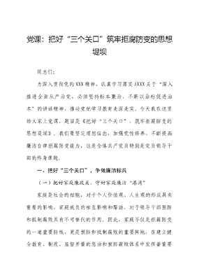 党课:把好三个关口筑牢拒腐防变的思想堤坝同志们:为深入贯彻党的XXX精神,认真学习落实AXXX关于深入推进全面从严治党,必须坚持标本兼治,不断以治标促进治本的讲话精神,推动党纪学习教育走深走实。今天我在这里给大家上党课,题目是《把好三个关口,筑牢拒腐防变的思想堤坝》。我们要坚定理想信念,加强党性修养,不断提高廉洁自律拒腐防变能力,这是全体共产党员特别是党员领导干部的终身课题。一、把好三个关口,争做廉洁标兵(一)把好家庭廉政关,守好家庭廉洁港湾家庭是社会的细胞,对于个人价值观、人生观的形成具有重要的影响,家庭成员的相互影响和帮助,对于领导干部预防和抵制腐败具有不可替代的作用。因此,家庭不仅是拒腐防变的一道重要防线,更是预防和抵制腐败的重要阵地,在建立健全教育、制度、监督并重的惩治和预防腐败体系中发挥着重要的作用。家是人生温馨的港湾,是每位同志干事业的大本营。希望我们每位领导干部的家属都能做到四多四少:事业上多一份支持,少一份拖累;感情上多一份温暖,少一份埋怨;生活上多一份理解,少一份苛求;廉洁上多一份把关,少一份奢求,给予自己的爱人更多的理解、更大的支持,使他们能够解除后顾之忧,集中精力,全身心地投入工作,做一个廉政勤政的领导干部。《诗经·小雅》中有句诗:妻子好合,如鼓琴瑟。意思就是,家人志同道合,亲密合作,如同弹奏出了一曲动听的乐章。(二)把好重点岗位关,树立廉洁新形象随着反腐败工作的深入开展,在惩治腐败的同时,中央提出要更加注重预防,更加注重治本,更加注重制度建设,针对容易产生腐败和问题的关键环节和部门加大力量开展廉政建设工作。从构建预防和惩处腐败体系的需要这个角度,结合当前实际,我委在实行执法检查时要严格落实先行告知、指导服务、纠错整改、行政处罚的四步规程,对企业轻微违法文可居文库——海量学习资料,手机电脑均可下载www.wenkeju.com行为要进行告知并指导其纠错、整改,未按规定整改的,再进行处罚;对企业首次轻微违规违法的,原则上不予罚款;必须采取经济处罚的,按下限进行处罚;企业对处罚决定提出异议的,不得加重处罚。同时,要优化行政权力运行流程,按照步骤清晰、程序简约、监督方便的原则,对行使的每一项行政权力运行流程进行重新审视和调整,全面规范行政权力的事项名称、法律依据、办理程序、岗位责任等内容,减少非法定的和不必要的审批环节,压缩工作时限。我们要加强政治修养、强化自律意识、正确看待权力。权力是国家和人民赋予我们的,是代表单位、政府履行职能,要做到权为民所用,利为民所谋,不能把权力作为捞取私利的工具,把自己的服务对象变成谋取私利的对象。(三)把好廉政监督关,构筑监督防线没有约束的权力,必然会导致腐败,失去监督的干部,难免会滑入泥潭。所以说,监督是防范腐败的关键。同时,监督本身也是对领导干部的关心、爱护和保护,是干部健康成长的必要条件。每位干部都要增强接受监督的意识和端正接受监督文可居文库——海量学习资料,手机电脑均可下载www.wenkeju.com的态度。要努力营造出一种监督有理、监督有功的氛围,要求我们面对赞誉,不能迷失方向,而应该深入到敢于真心实意地监督自己、直言不讳地批评自己的群众中去,鼓励群众们发表不同意见,提出不同看法,主动诚恳地对待他们的意见建议,该提醒的提醒,该批评的批评,该制止的制止,充分调动和保护群众监督的积极性,营造一种敢于监督、善于监督的良好氛围,只有这样才能听到真话,看到实情,才能时刻保持清醒头脑,提高免疫力。二、领导干部要强化自身素质,筑牢拒腐防变的思想堤坝多年来,党中央高度重视党的自身建设和党风廉政建设,取得了很大成效。但也应该看到,当前诱发腐败现象、使腐败现象滋生蔓延的土壤依然存在。原因是多方面的,但主观原因仍是决定因素。所以,党员干部必须注意加强自身锻炼,努力增强三个意识,提高三个能力。(一)要切实增强三个意识一要增强党的意识。我们党之所以能够战胜各种艰难险阻不断发展壮大,就是因为有坚定的理想信念,有严格的组织纪文可居文库——海量学习资料,手机电脑均可下载www.wenkeju.com律,有人民群众的衷心拥护和大力支持。大家可以回忆一下,我们在夺取政权的过程中,严格执行三大纪律八项注意,与人民群众建立了密切的关系,这是战无不胜的根本。现在,我们所处的环境、所肩负的任务,与执政以前相比,与改革开放以前相比,都发生了很大的变化。在新的历史条件下,需要我们像当年夺取政权和建设初期那样,保持蓬勃向上的朝气,保持与民同甘共苦的好风气,努力做到吃苦在前、享乐在后。作为党的干部,一定要明白这样一个道理:入党没有什么便宜可沾,当官没有什么特权可享,只能是为人民多做工作,甘于奉献,甚至在必要时献出自己的生命。这是一切共产